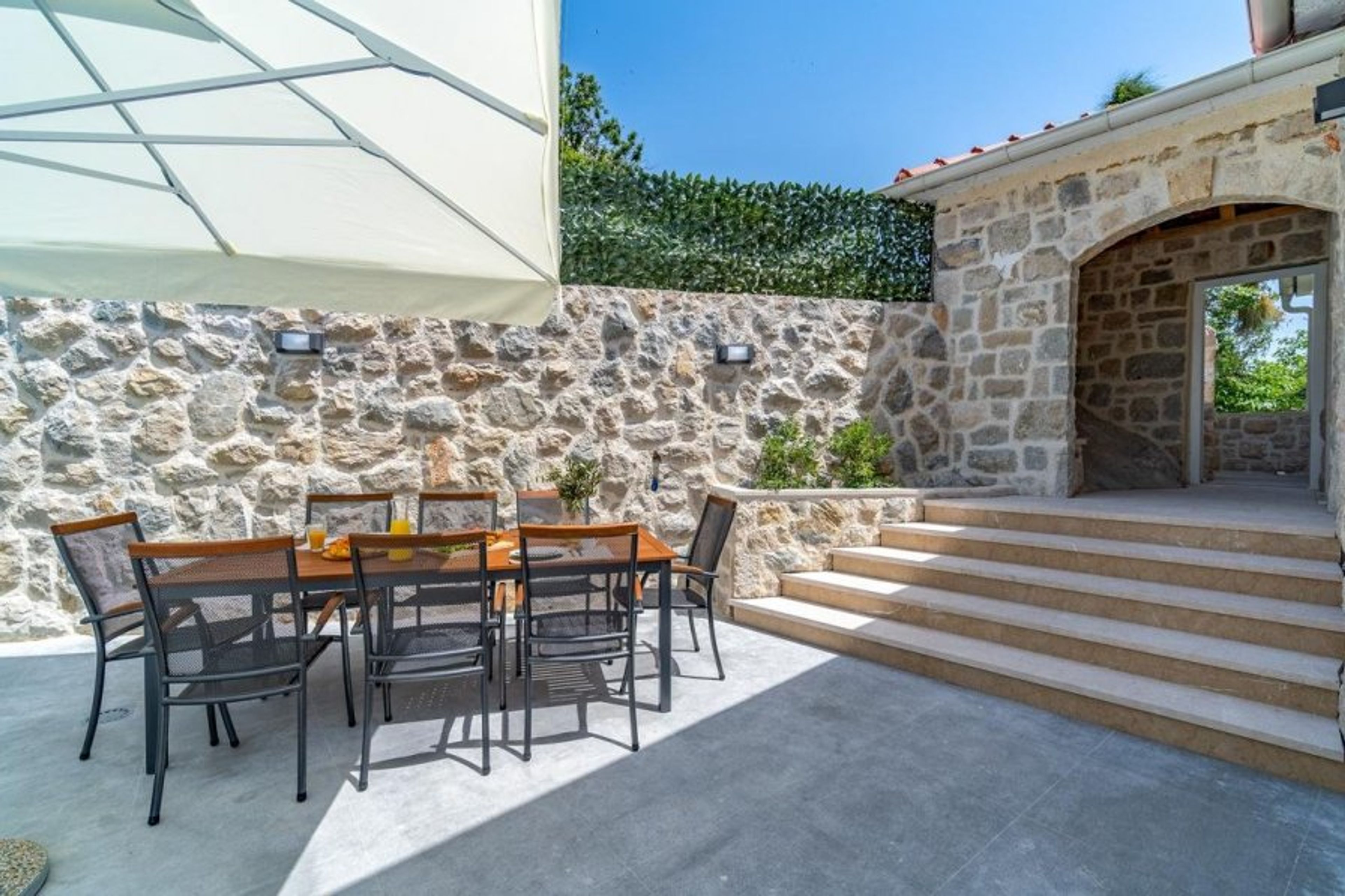 Next to the outside eating area, close to the villa's main entrance, is a typical stone barbeque.