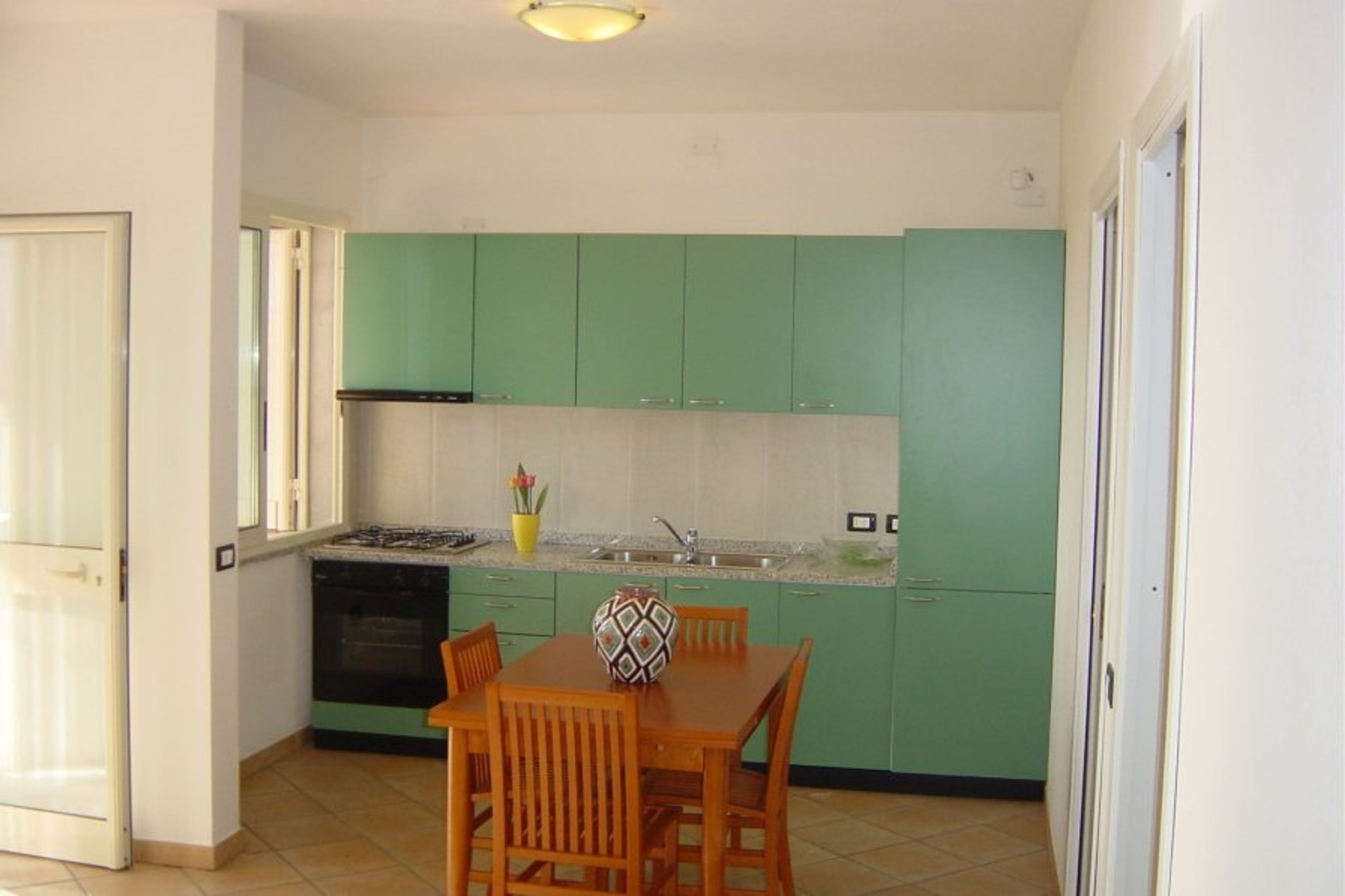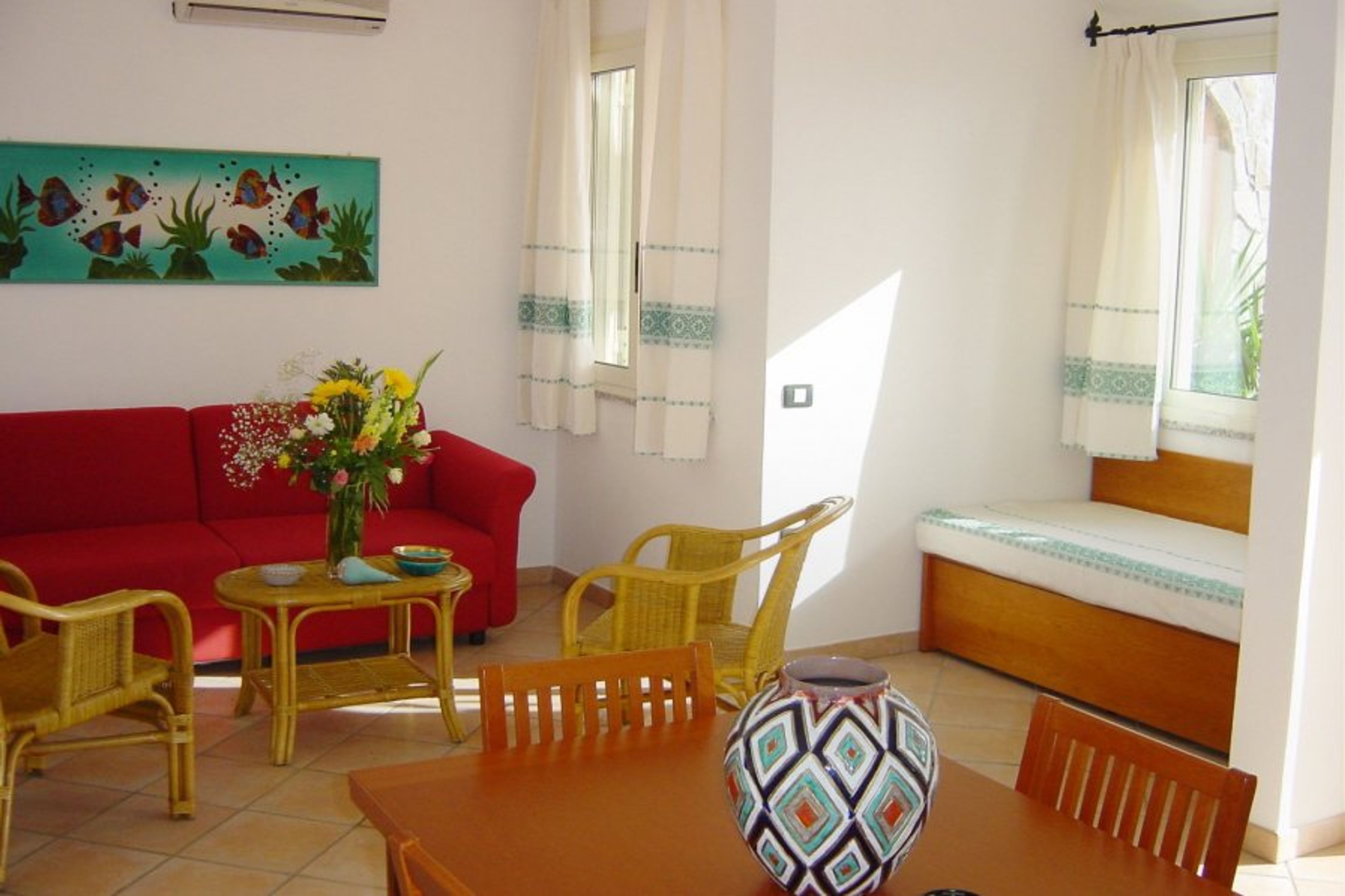 The this apartment (one bedroom) have a private garden; a veranda, with possibility of dining outdoor and with view of the sea; a double room; a living-room with a sofa–double bed and a single bed, an open kitchen with fridge, freezer, stove and a complete endowment (included cooking pots, frying pans, cutlery, iron, hair-dryer, satellite television); bathroom with shower.