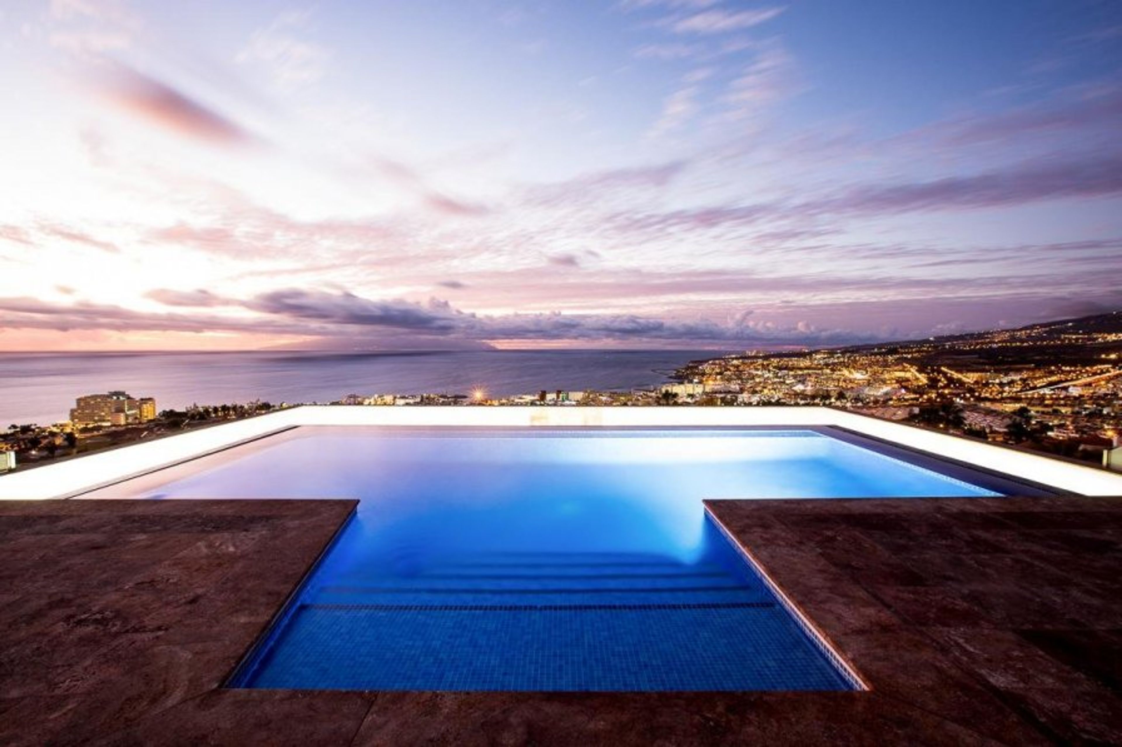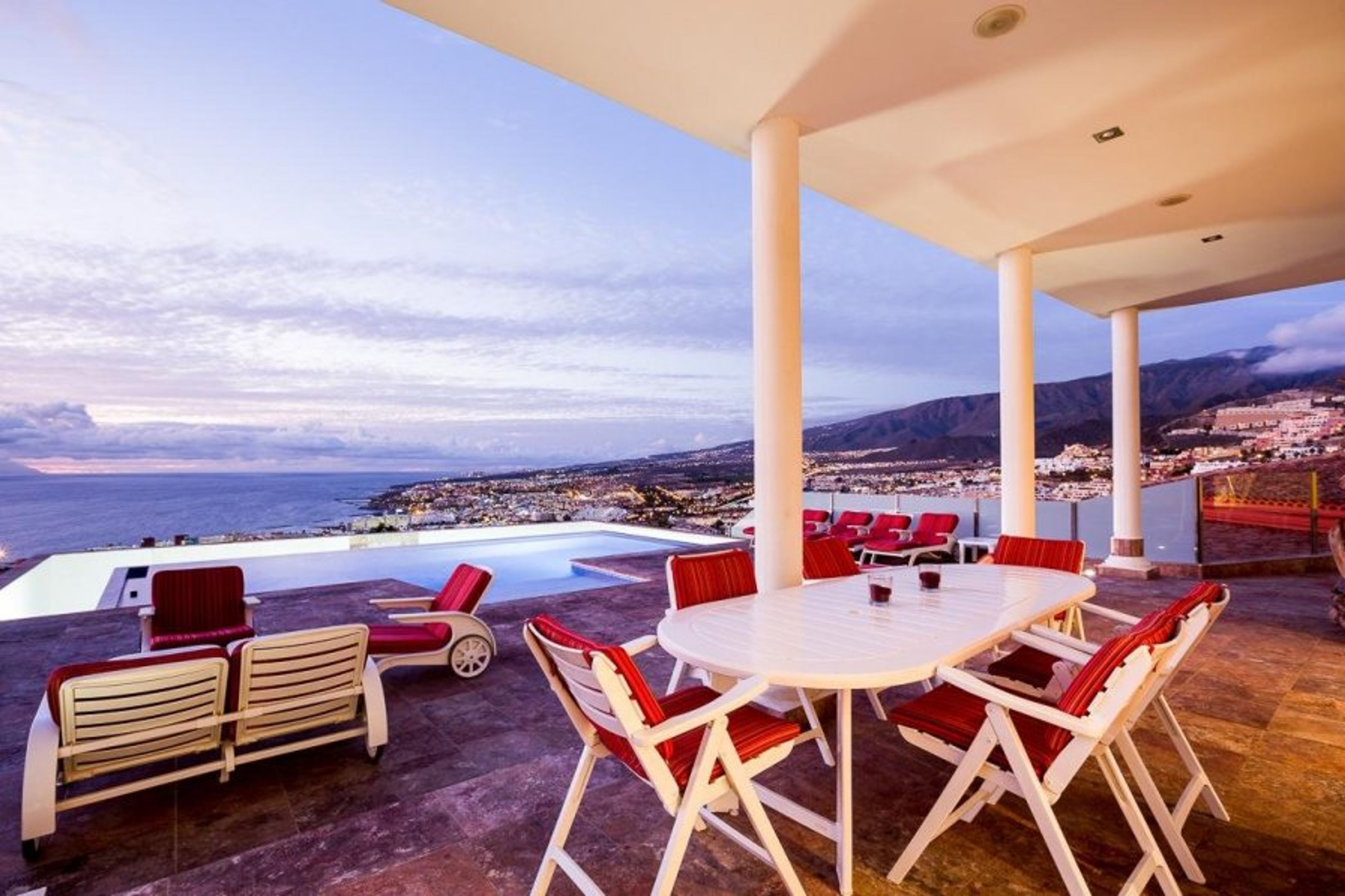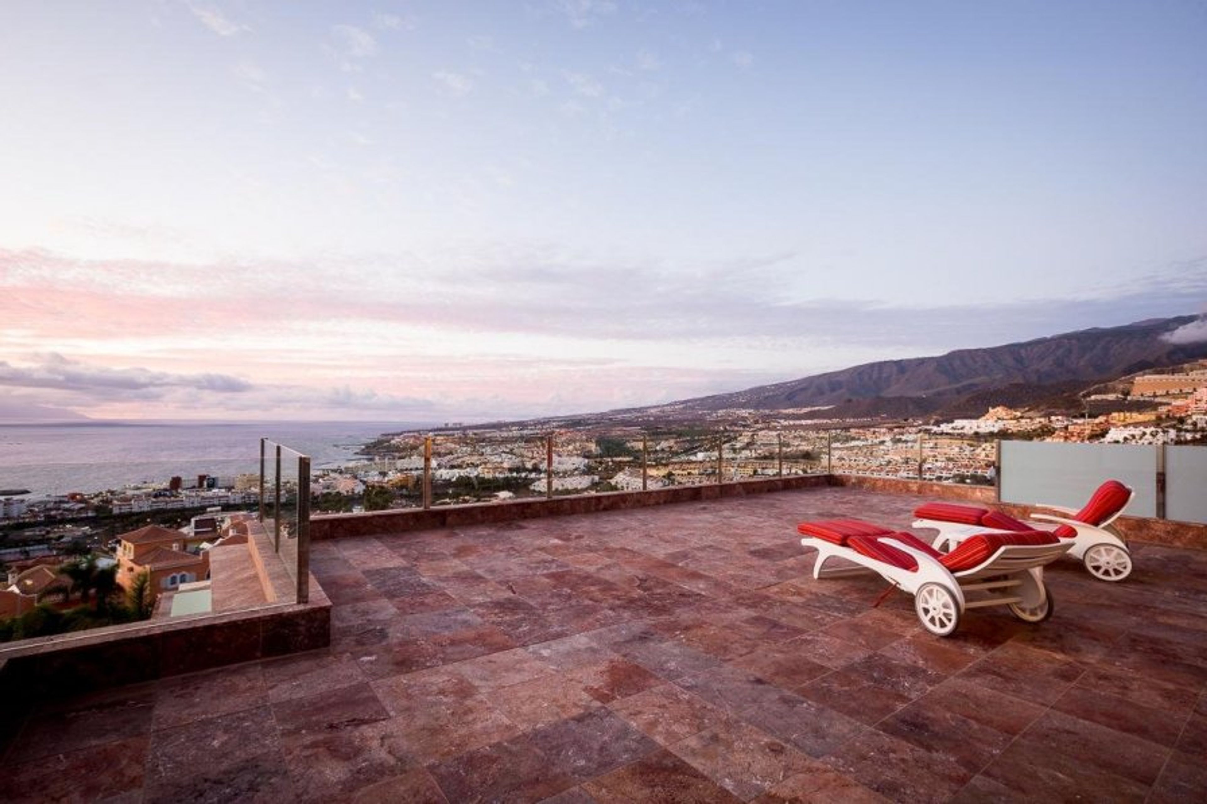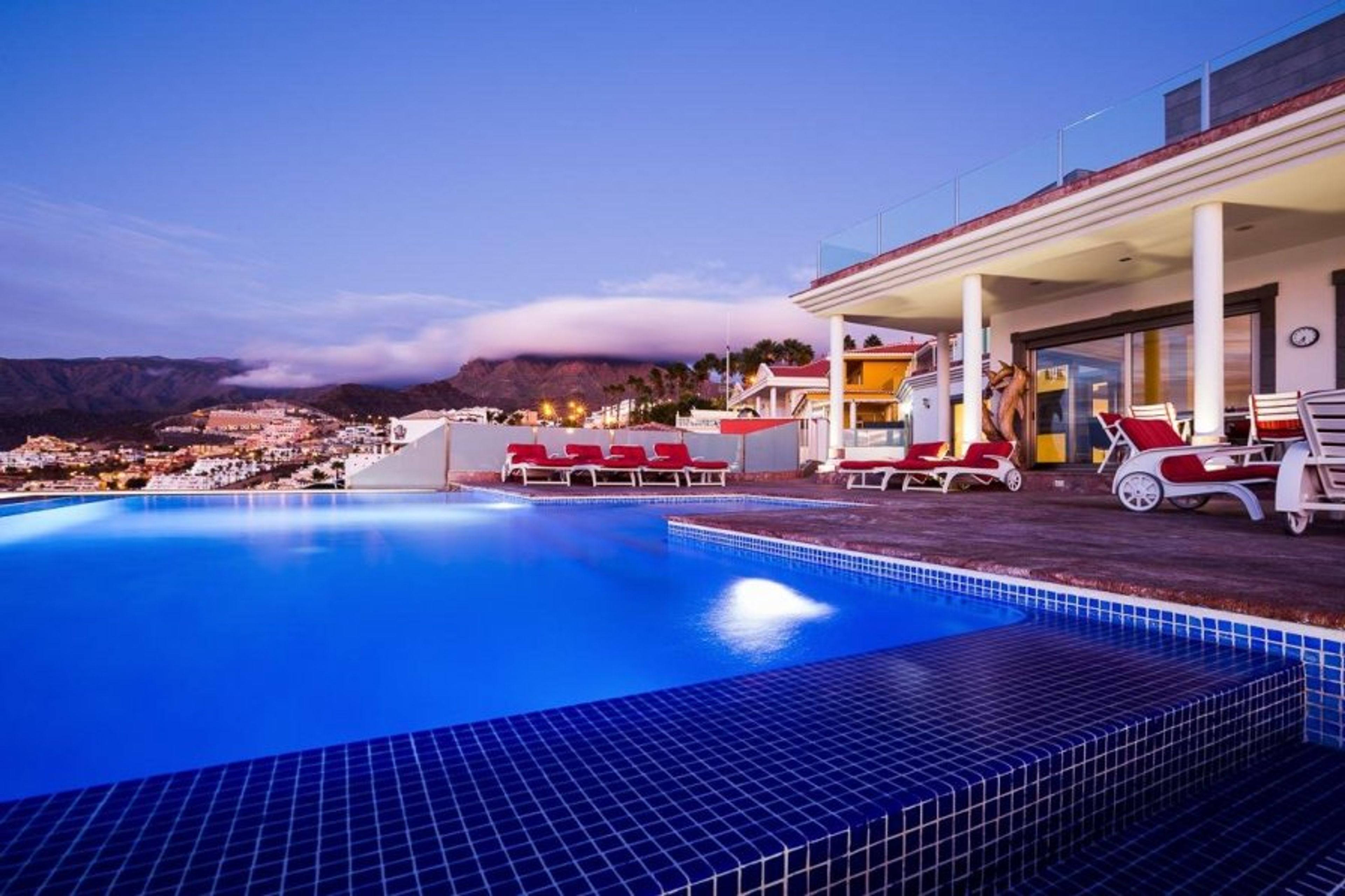 This luxury villa has stunning views over the Atlantic to the Island of La Gomera. There are 4 bedrooms and 6 bathrooms, and it can accommodate up to 8 people