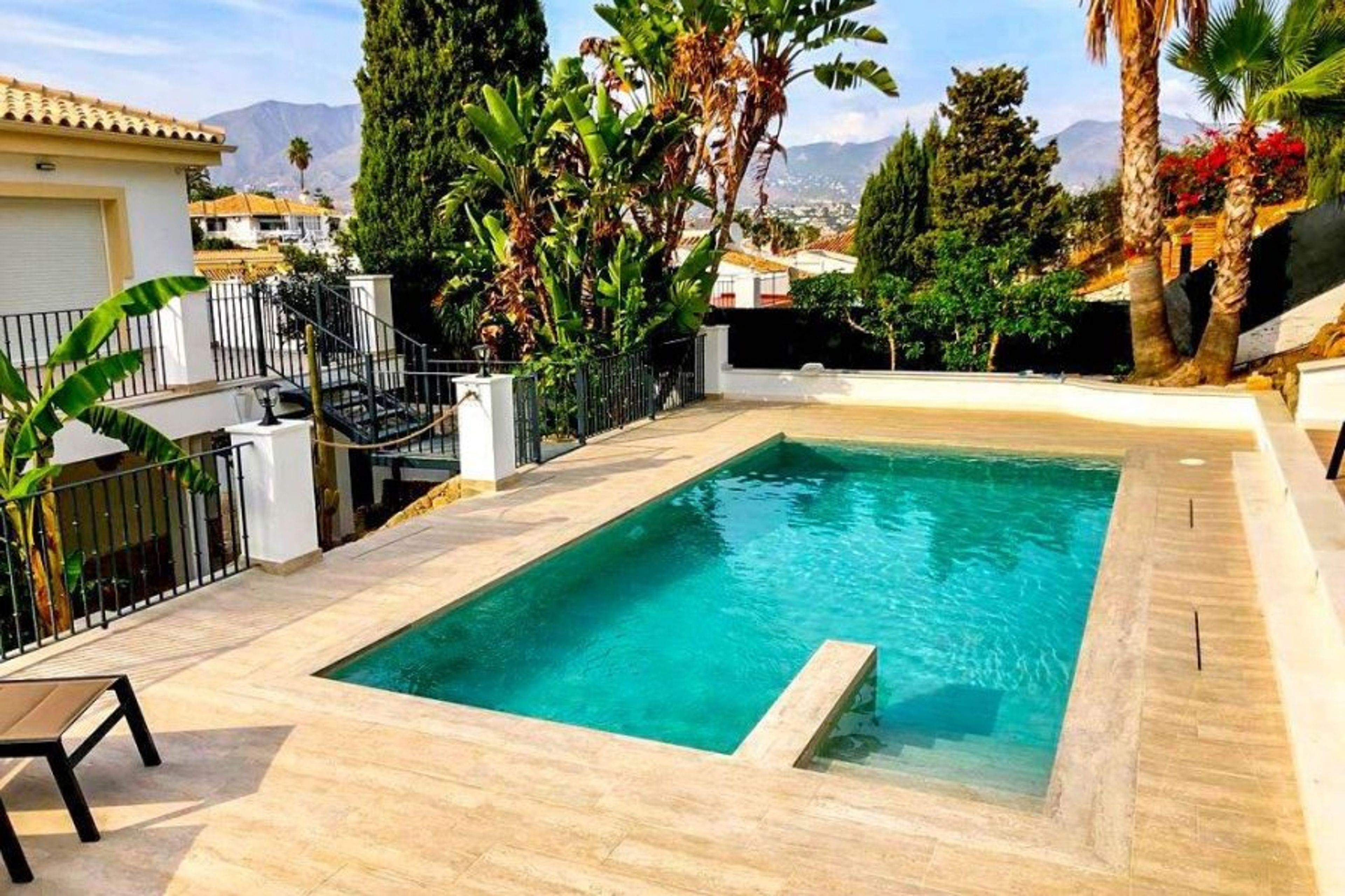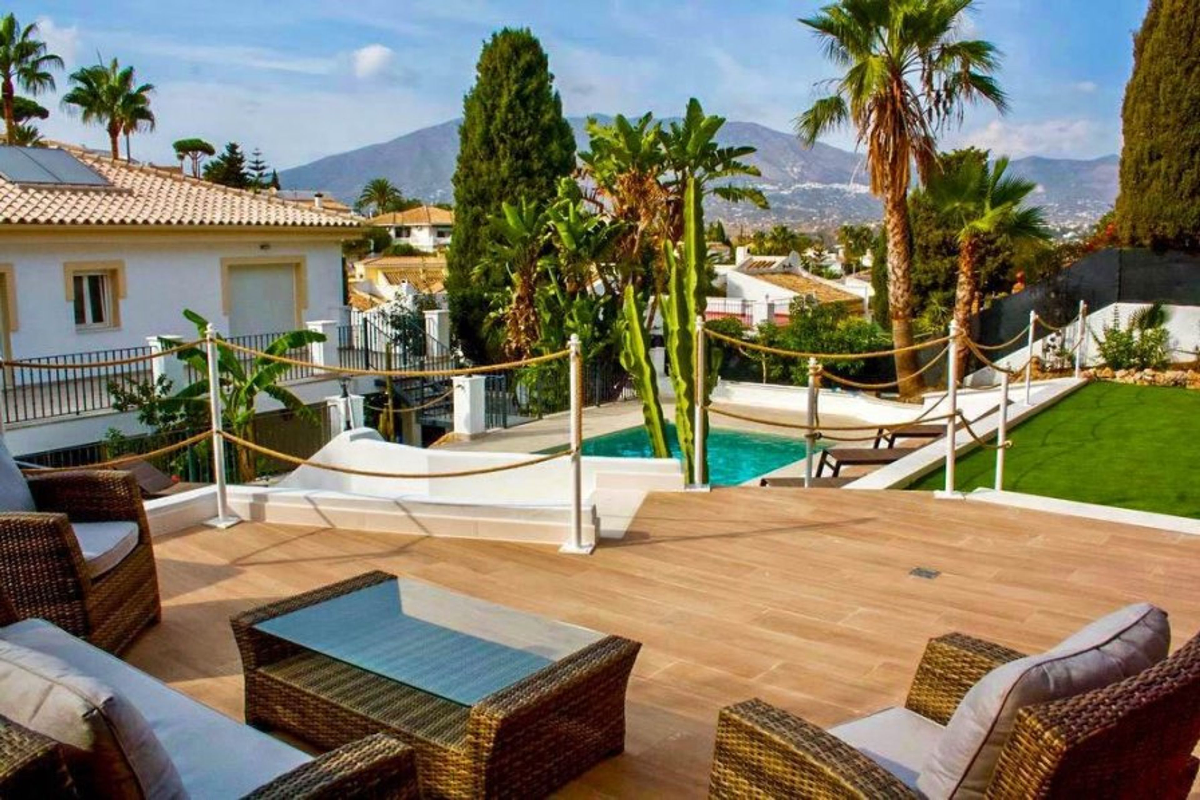 Here, guests can enjoy the views of the soaring Mijas mountains and swaying palm trees from the pool. The elevated saltwater pool is in a plunge design, surrounded by lots of decking space and tropical plants. It is separated by golden ropes from one of the alfresco dining areas. Take a refreshing dip and bask in the sunshine. There is also an outdoor lounge with stylish bamboo furniture with white cushions - perfect to enjoy a glass of wine at sunset.
