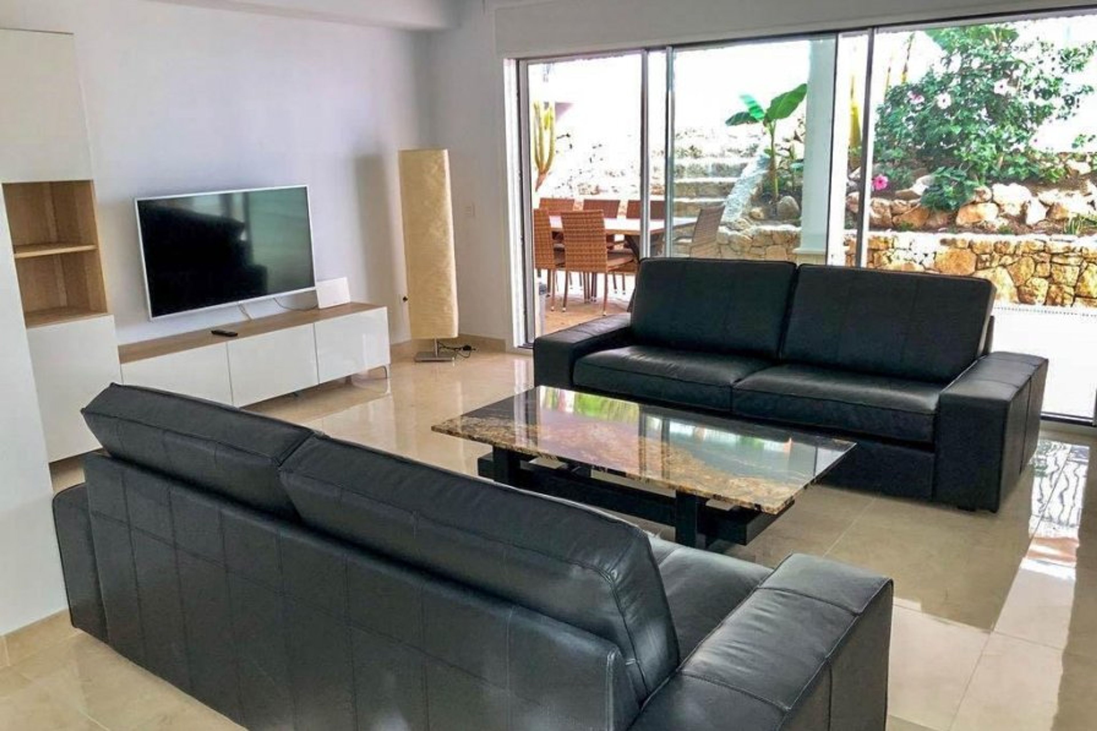 The well-equipped yet compact kitchen has everything guests will need to create delicious family feasts. A granite dining table matches the beautiful coffee table and seats ten guests. State-of-the-art appliances have been used throughout at this villa, to ensuite a quality experience. A side door leads straight out to the patio.