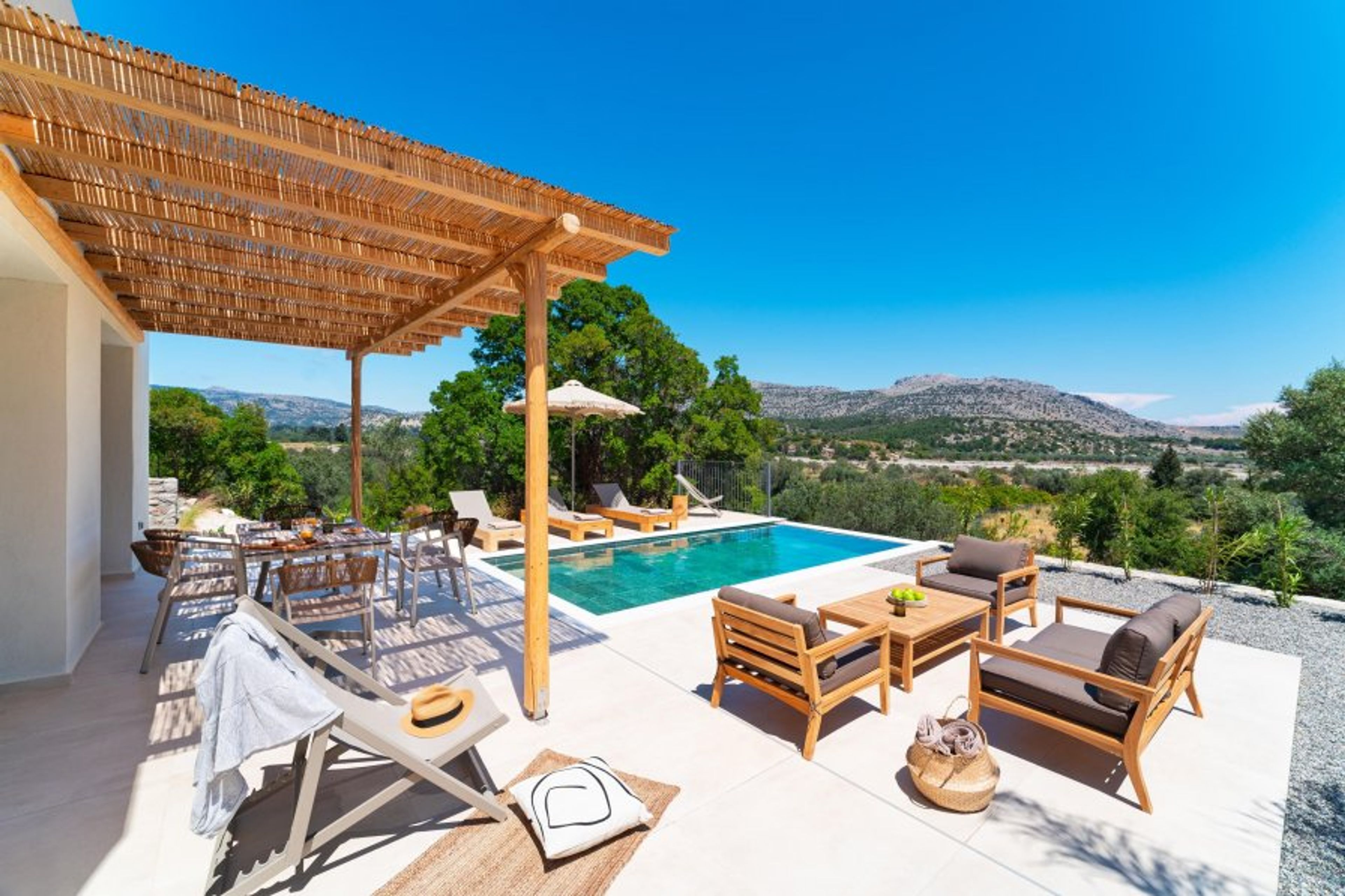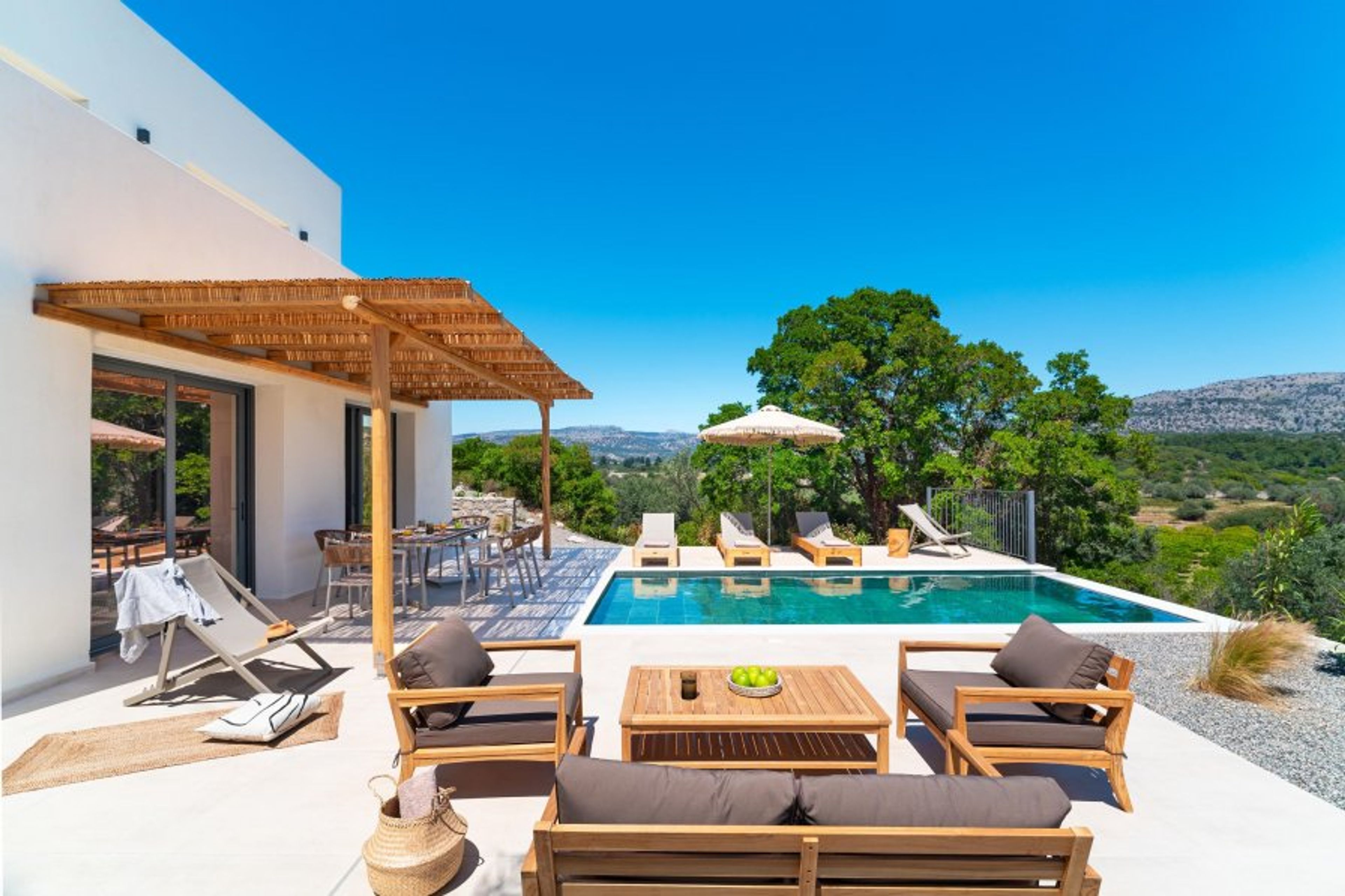 Massari Hills Luxury Living are 15 fantastic brand-new properties designed in unique minimal architecture with unique warm-colored details. They are located in Massari, only a 5-minute drive from Charaki beach. All of the modern villas provide you with all comforts, private swimming pools and patios in a unique design. There is an outdoor sharing gym and each villa offers a BBQ installation. Each property accommodates up to 8 guests.