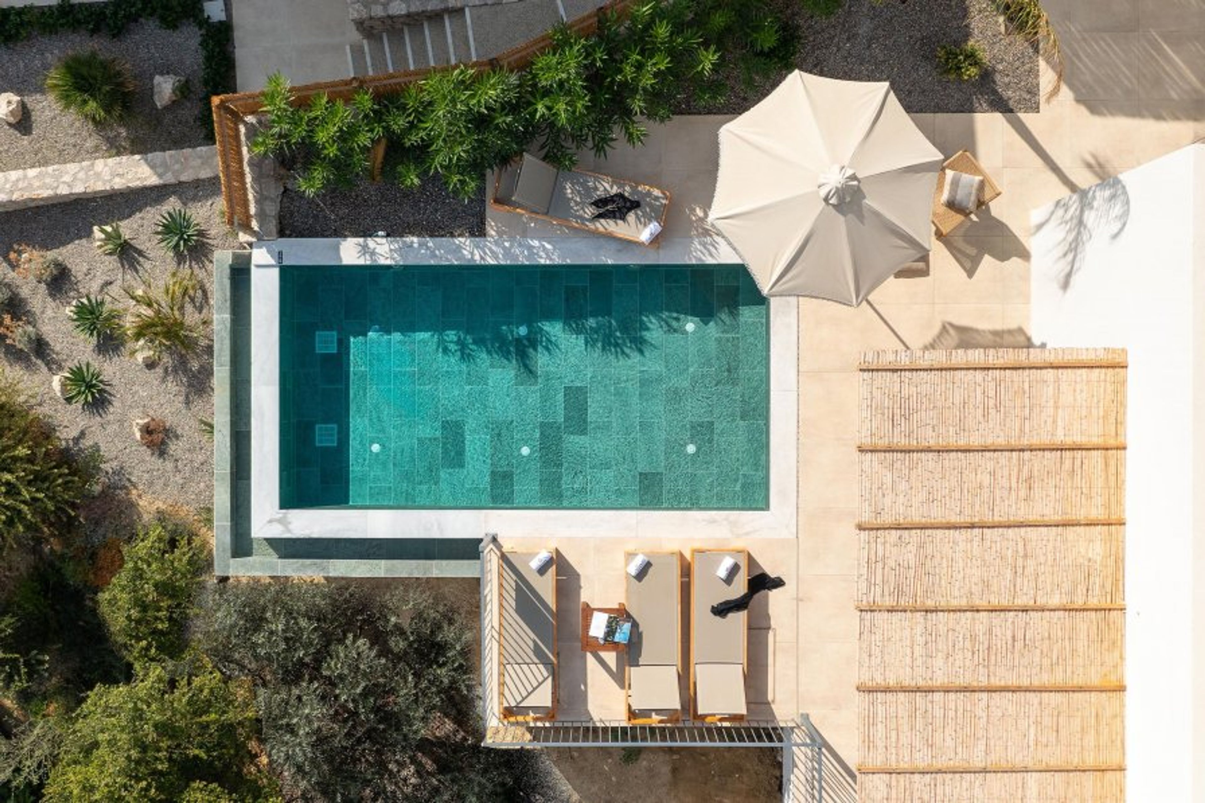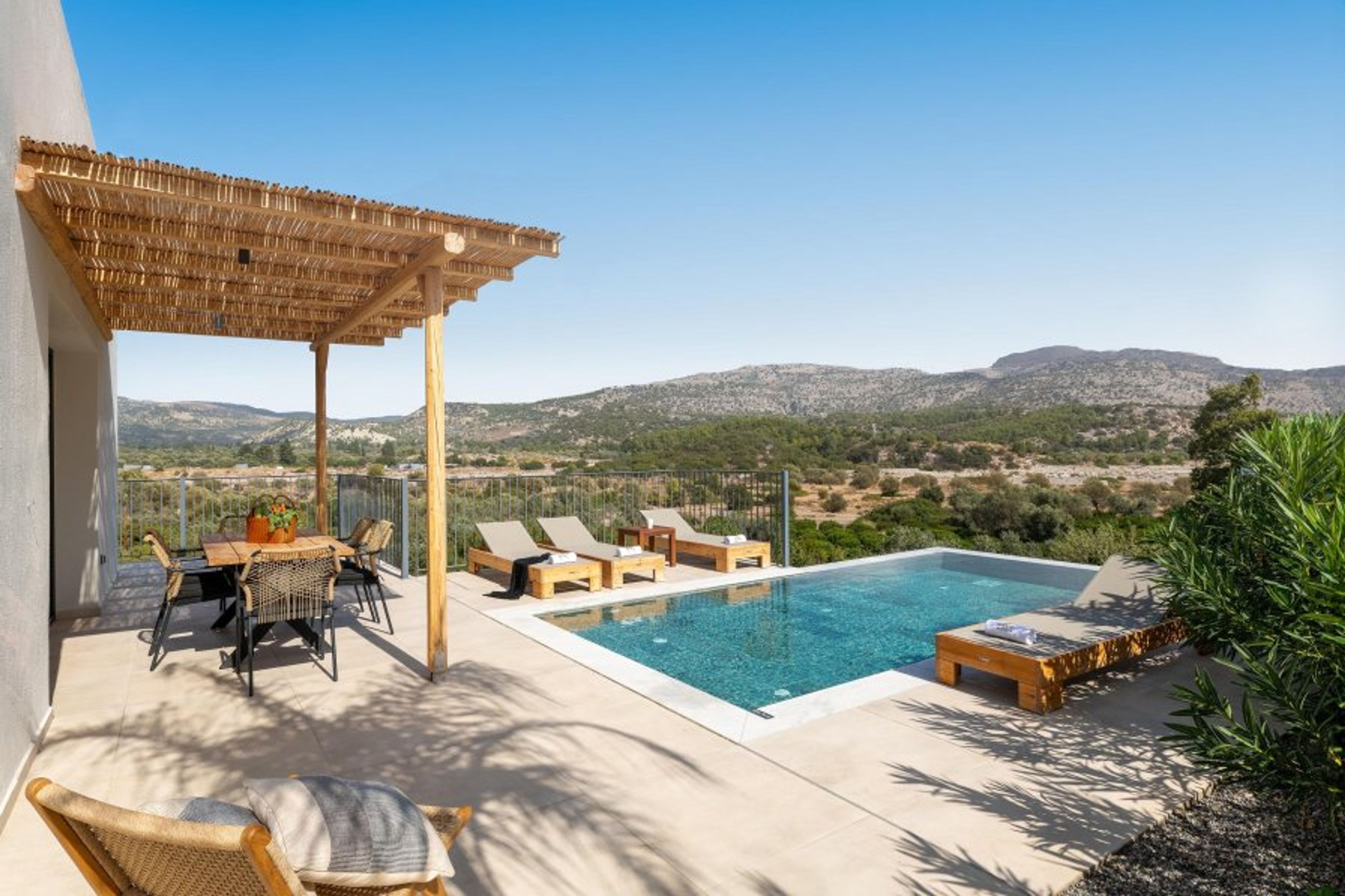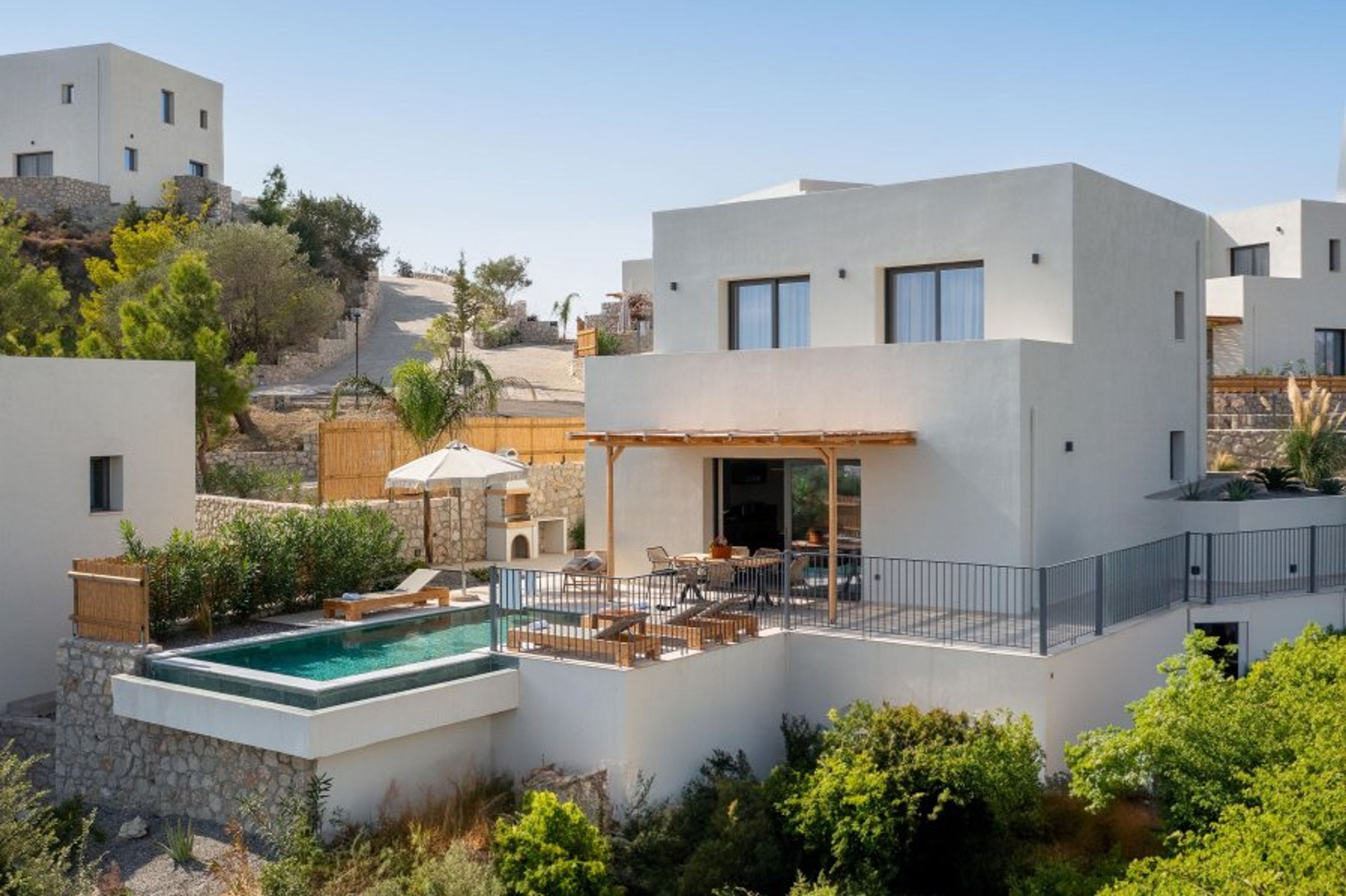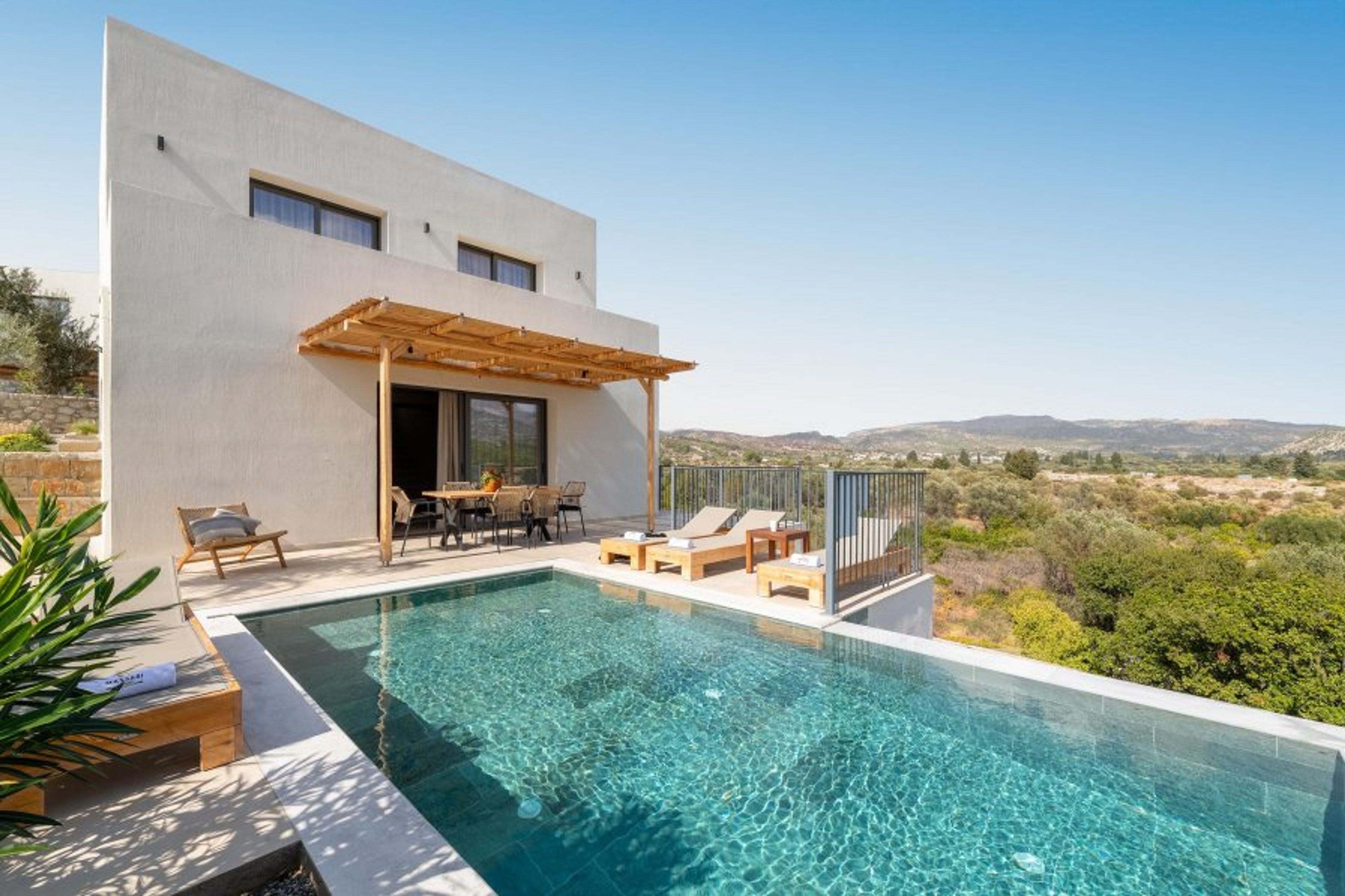 Massari Hills Luxury Living are 15 fantastic brand-new properties designed in unique minimal architecture with unique warm-colored details. They are located in Massari, only a 5-minute drive from Charaki beach. All of the modern villas provide you with all comforts, private swimming pools and patios in a unique design. There is an outdoor sharing gym and each villa offers a BBQ installation. Each property accommodates up to 8 guests.