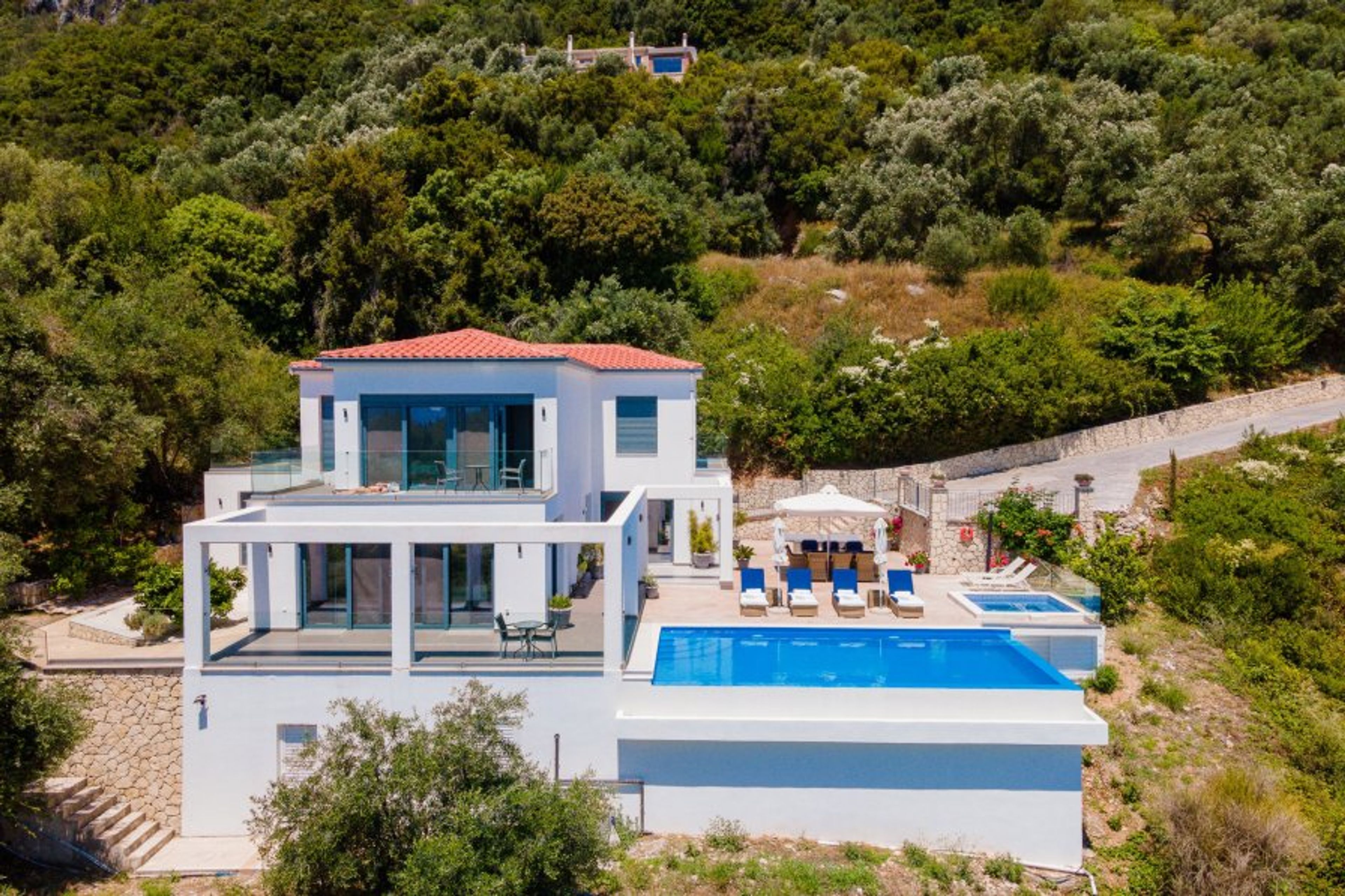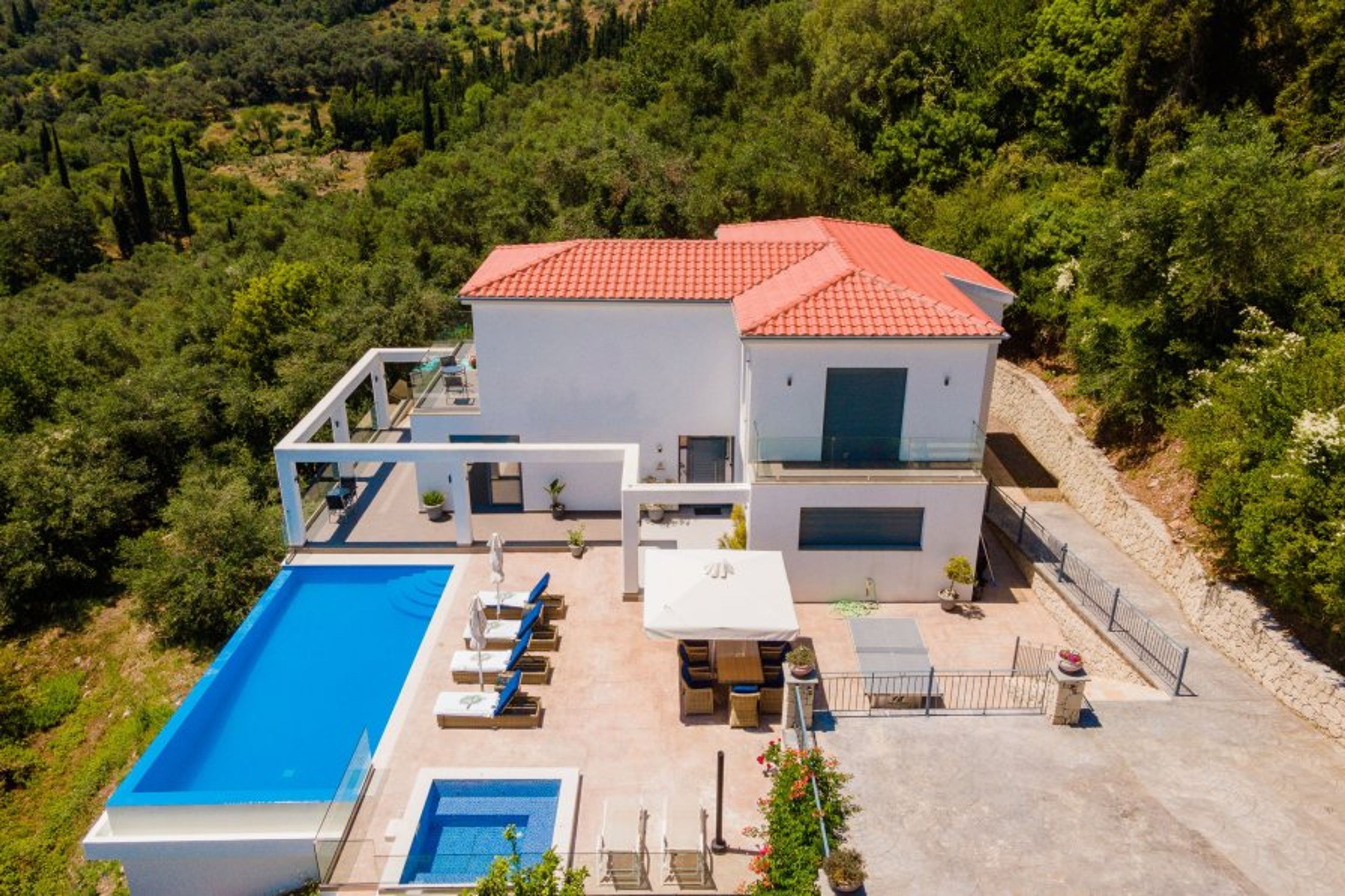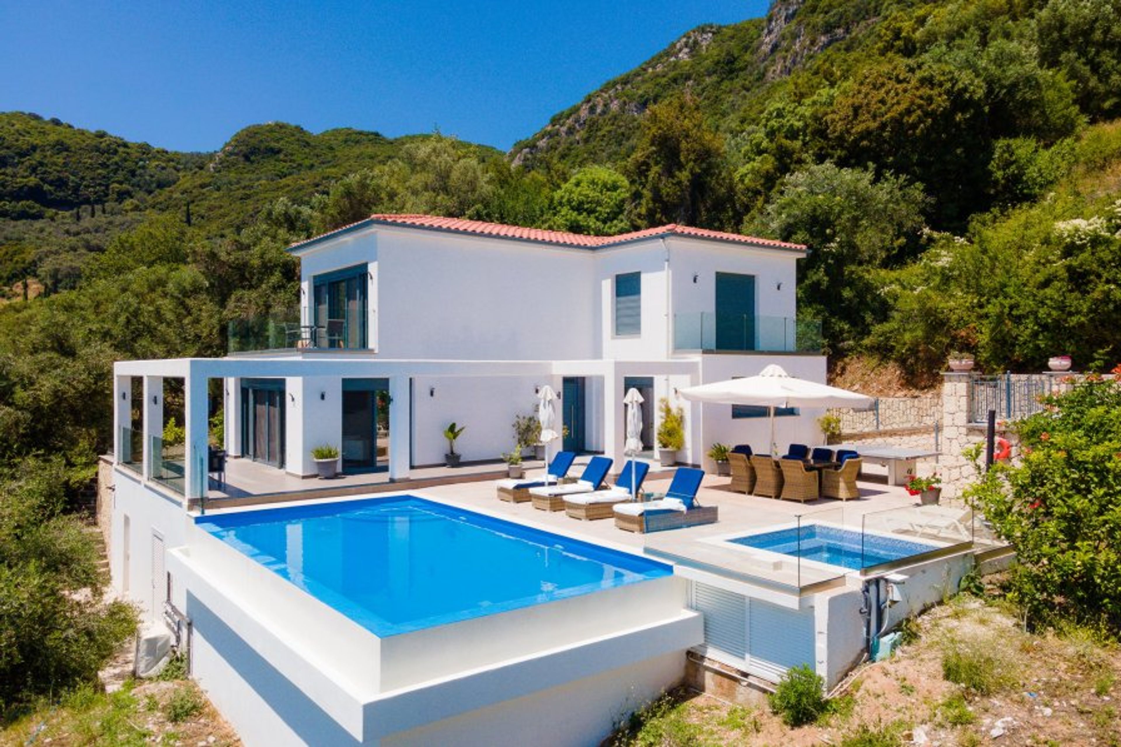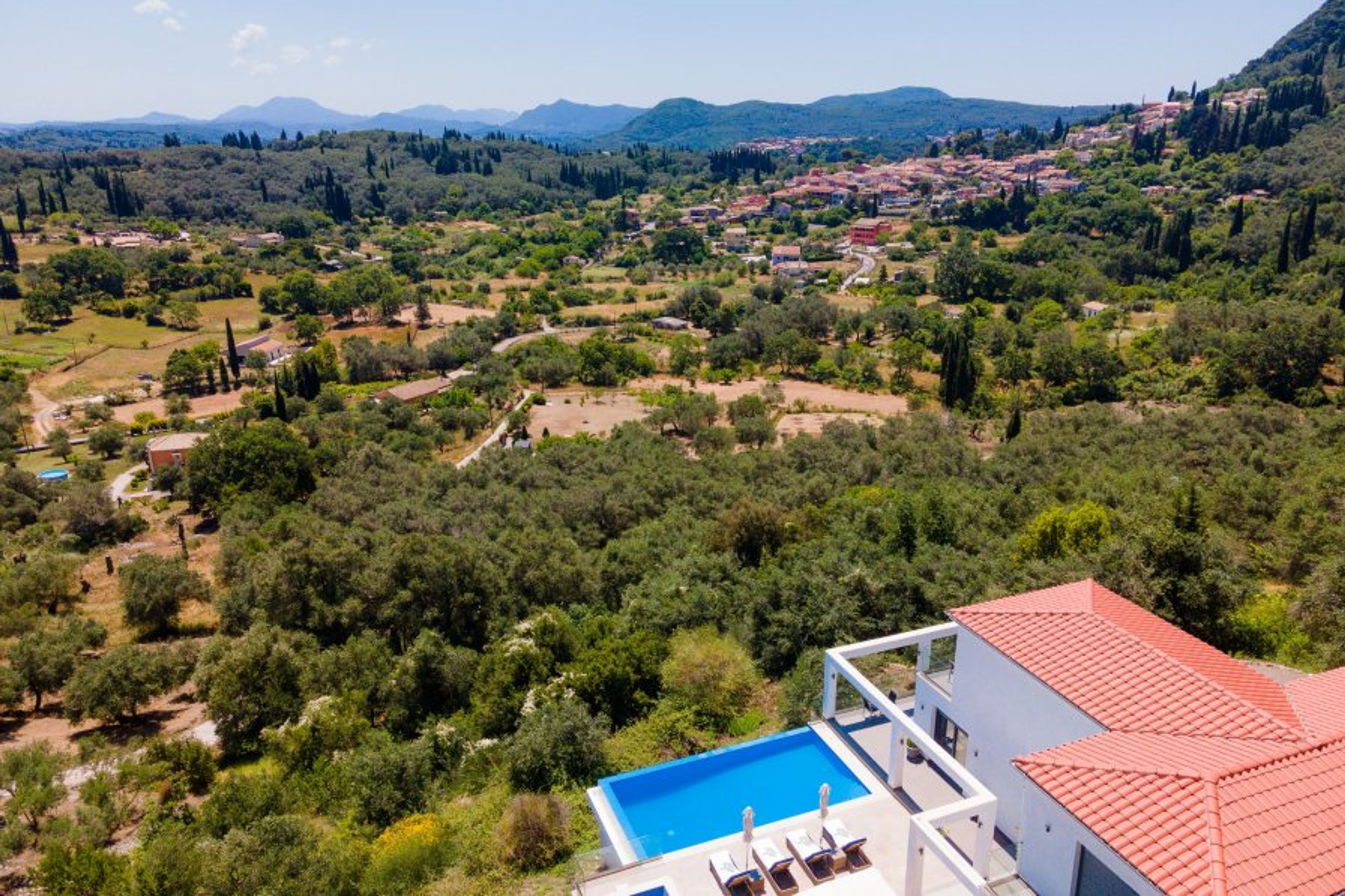 A stunning 4 bedroom property overlooking the valley and hills of the Ionian island of Corfu. Sleeps 10 • Heated Infinity Pool • Jacuzzi