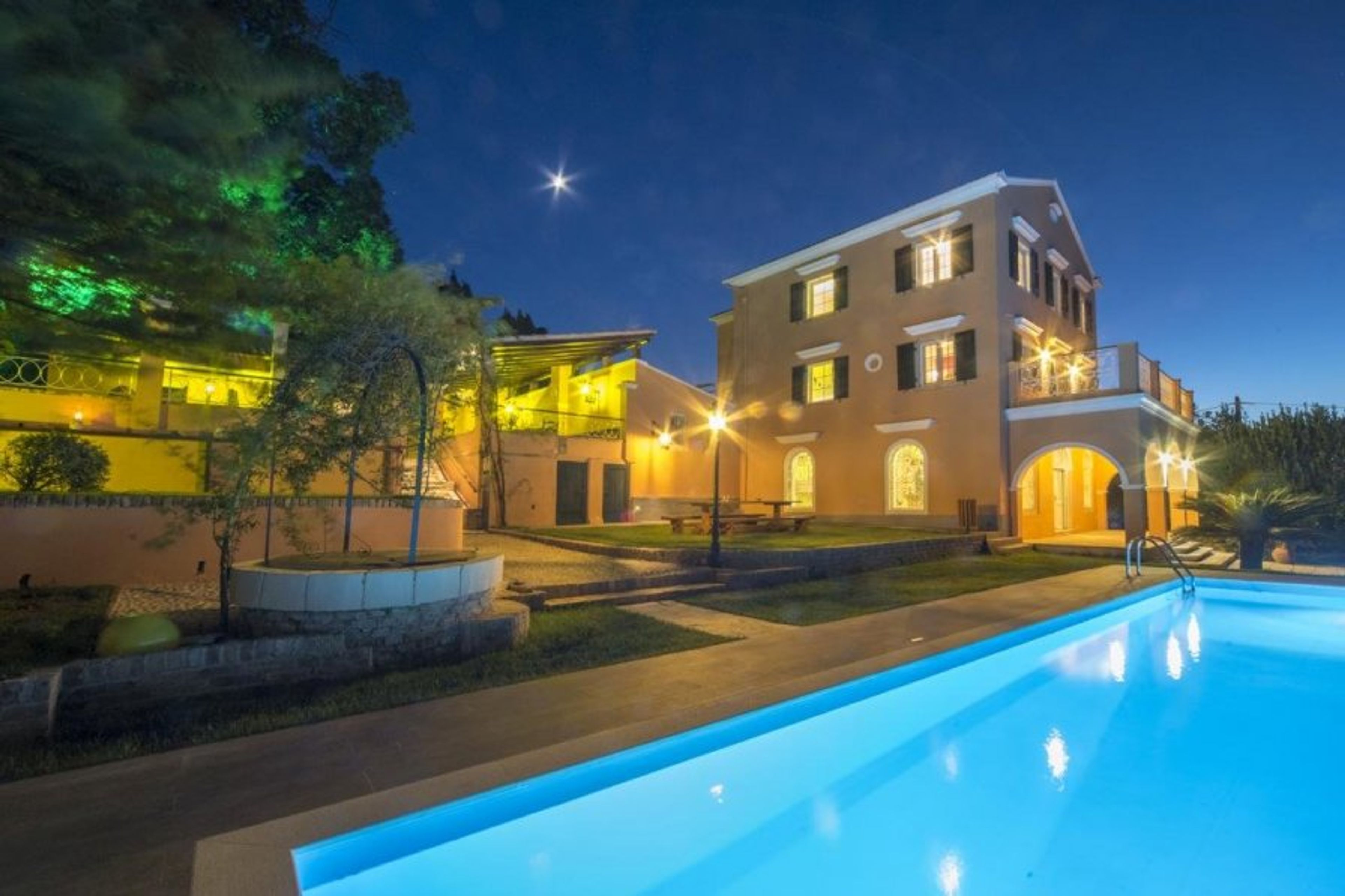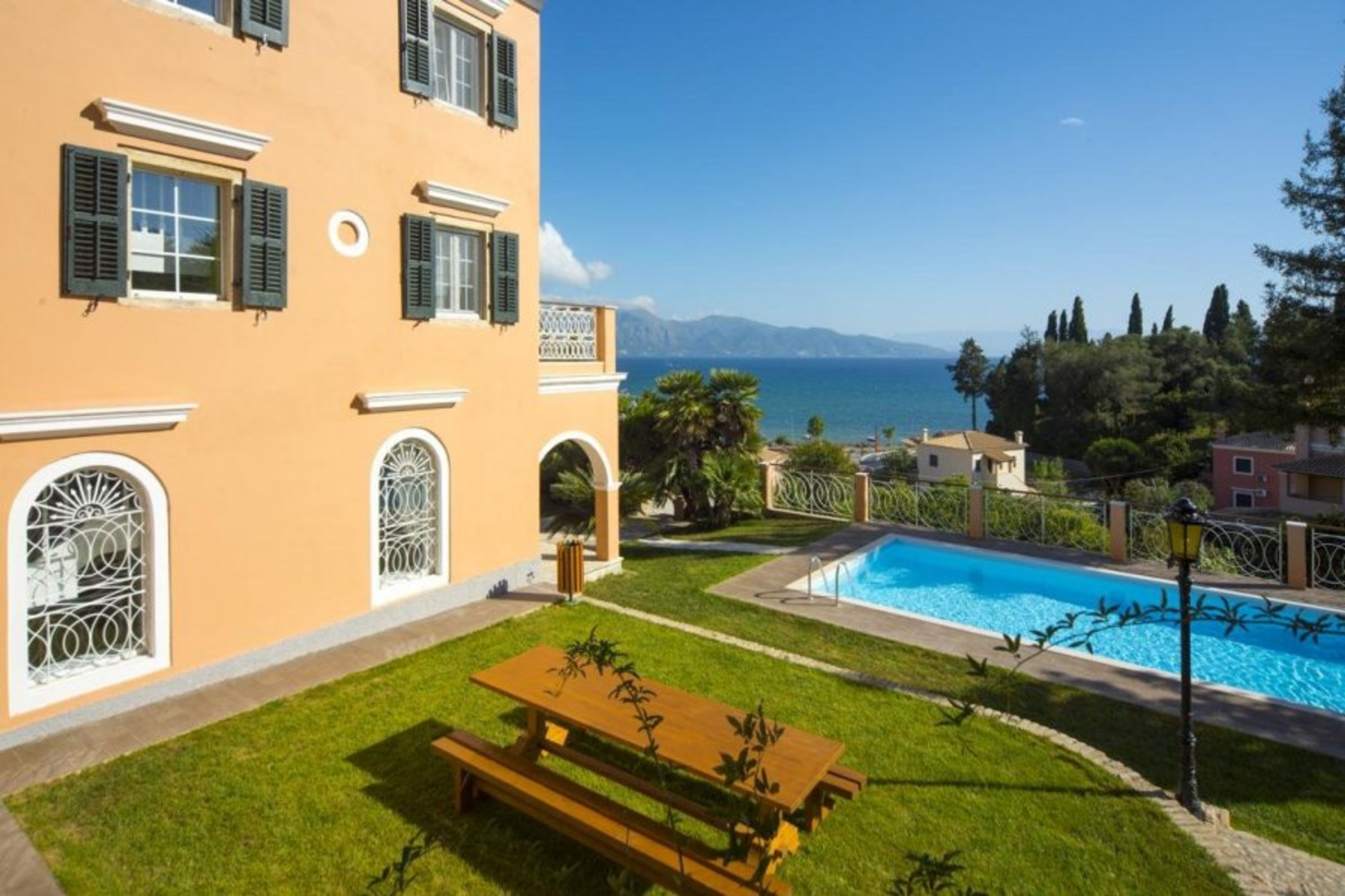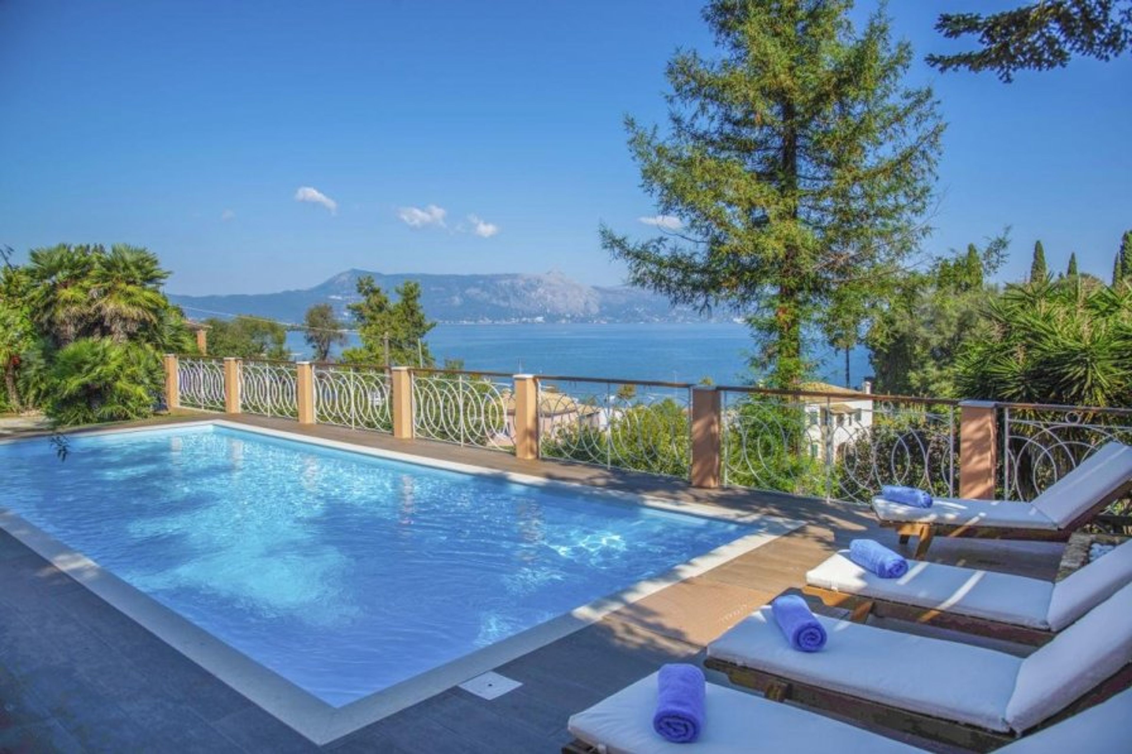 The villa is located in Corfu's Kefalomantouko district, a short distance from the historic Corfu Town. There are six bedrooms and five bathrooms, and it can accommodate up to 16 people