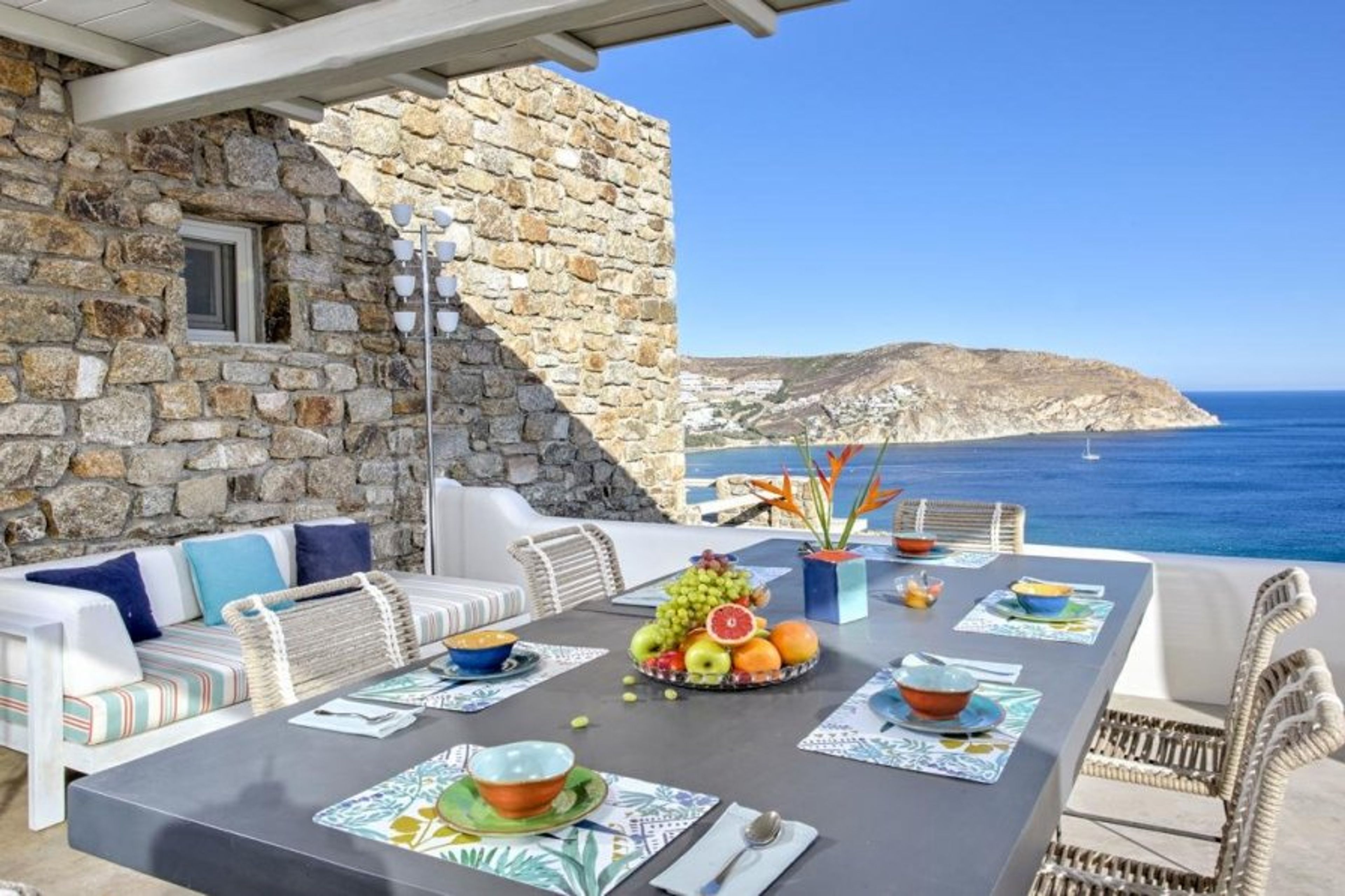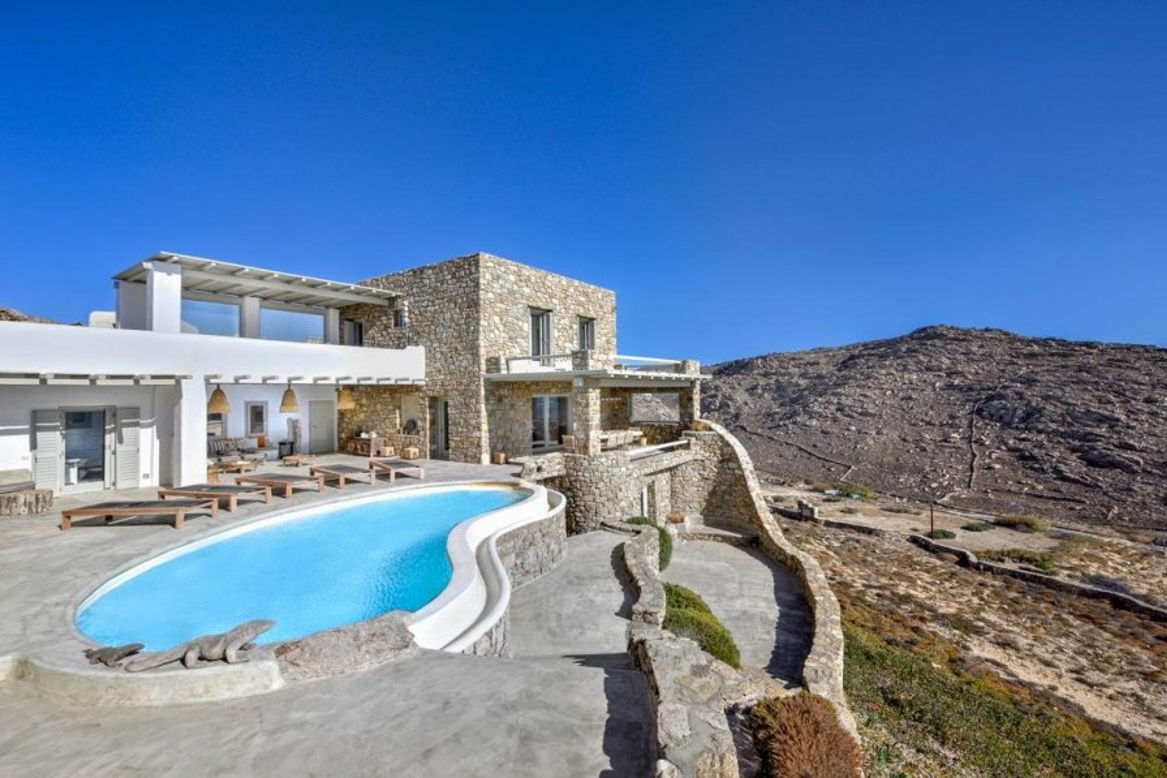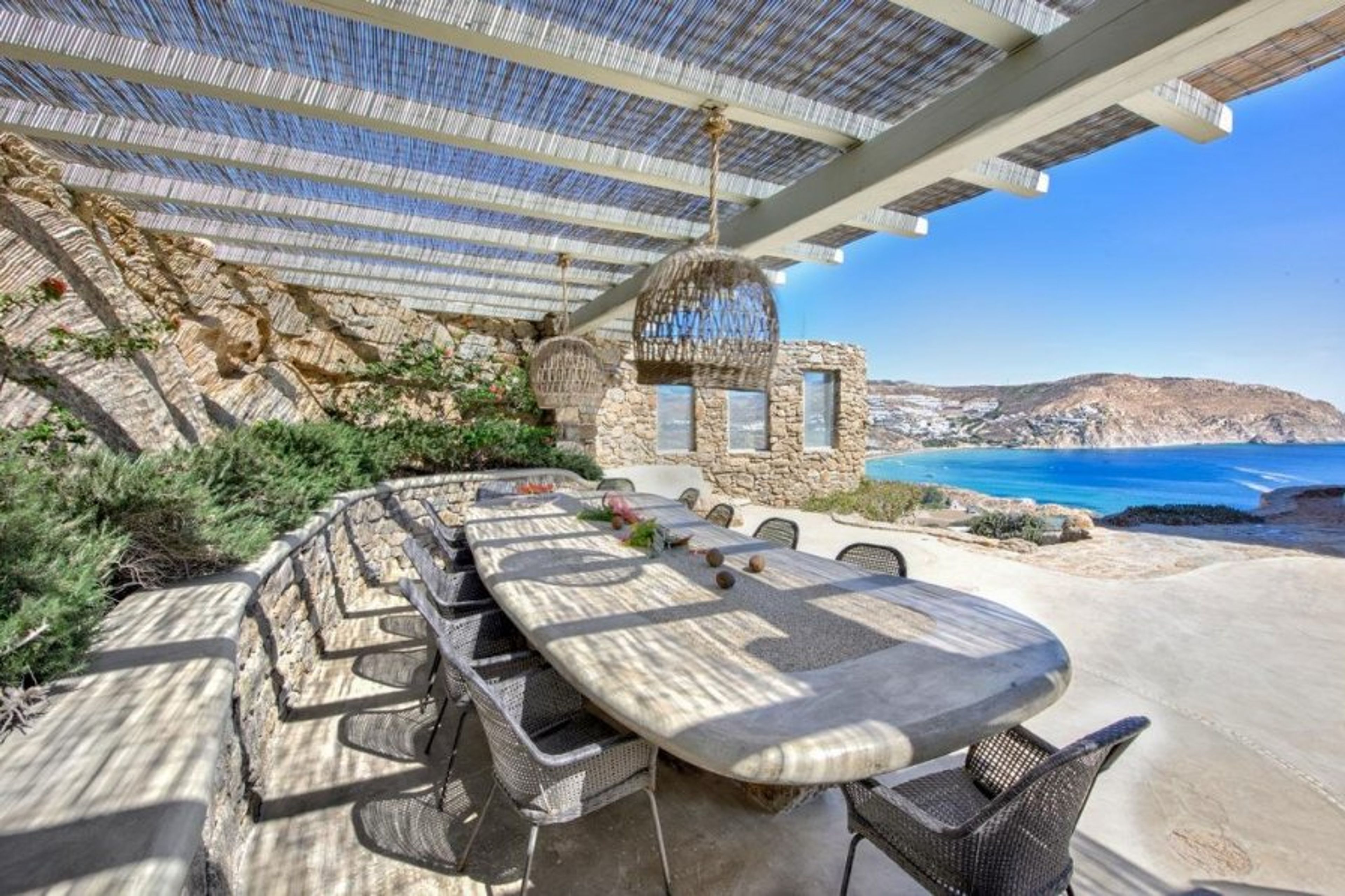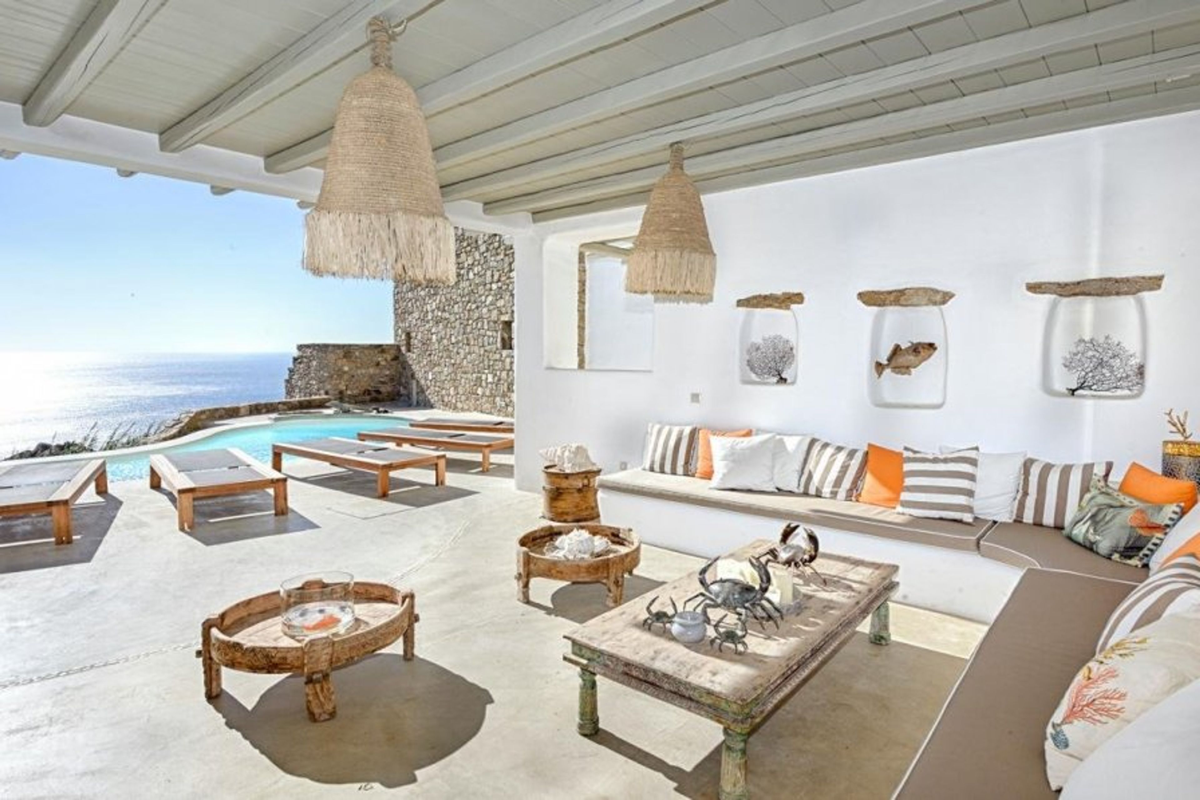 On the southernmost point of the opulent jet-set island of Mykonos, the villa is situated on a plot of ground about 4,500 square meters.