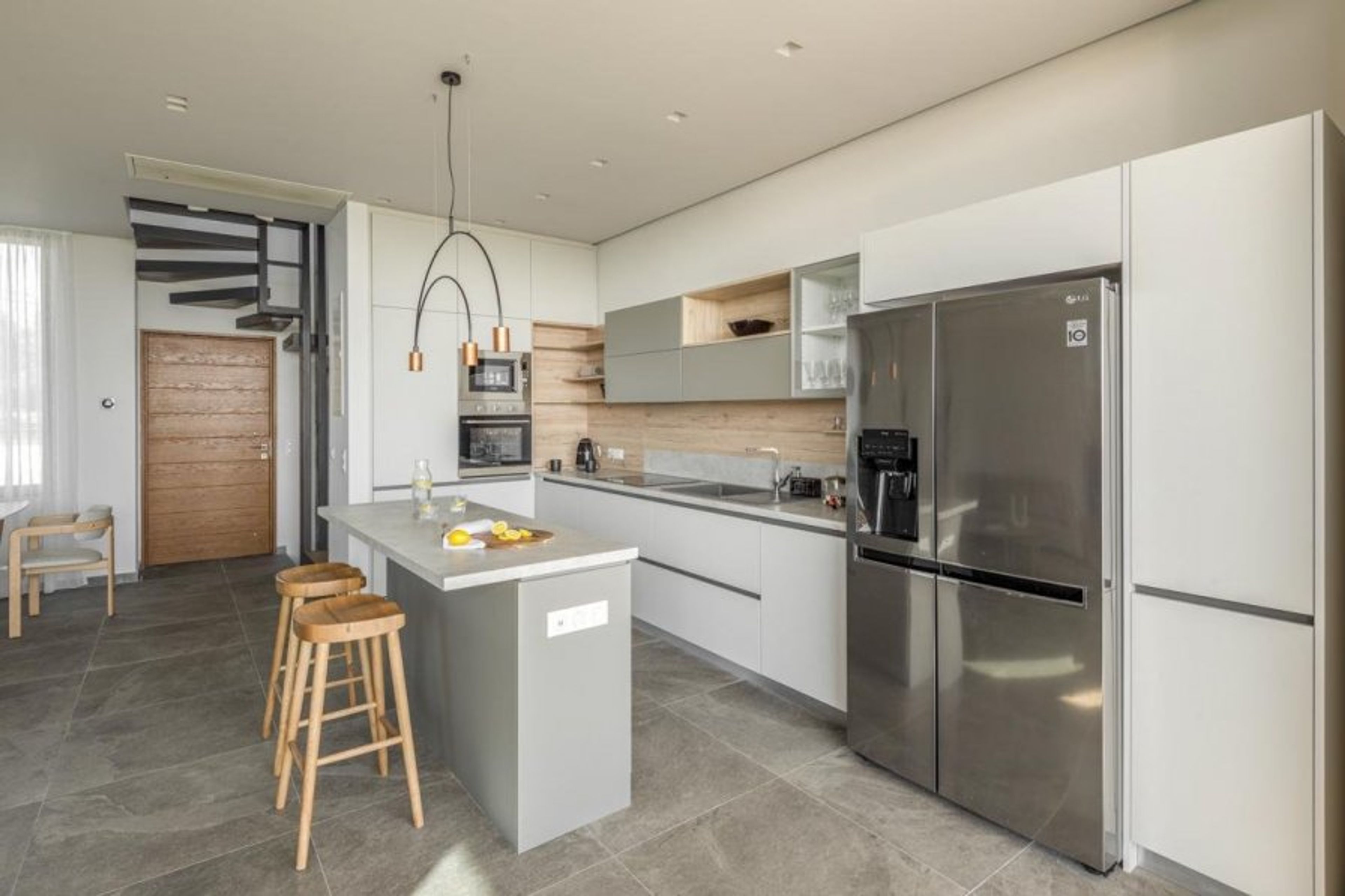 A wall of glass opens to a spacious balcony, providing beautiful views of the Toronean Gulf and the island of Kelyfos, as well as views of the Kassandra peninsula and the towering peaks of Mount Olympus.