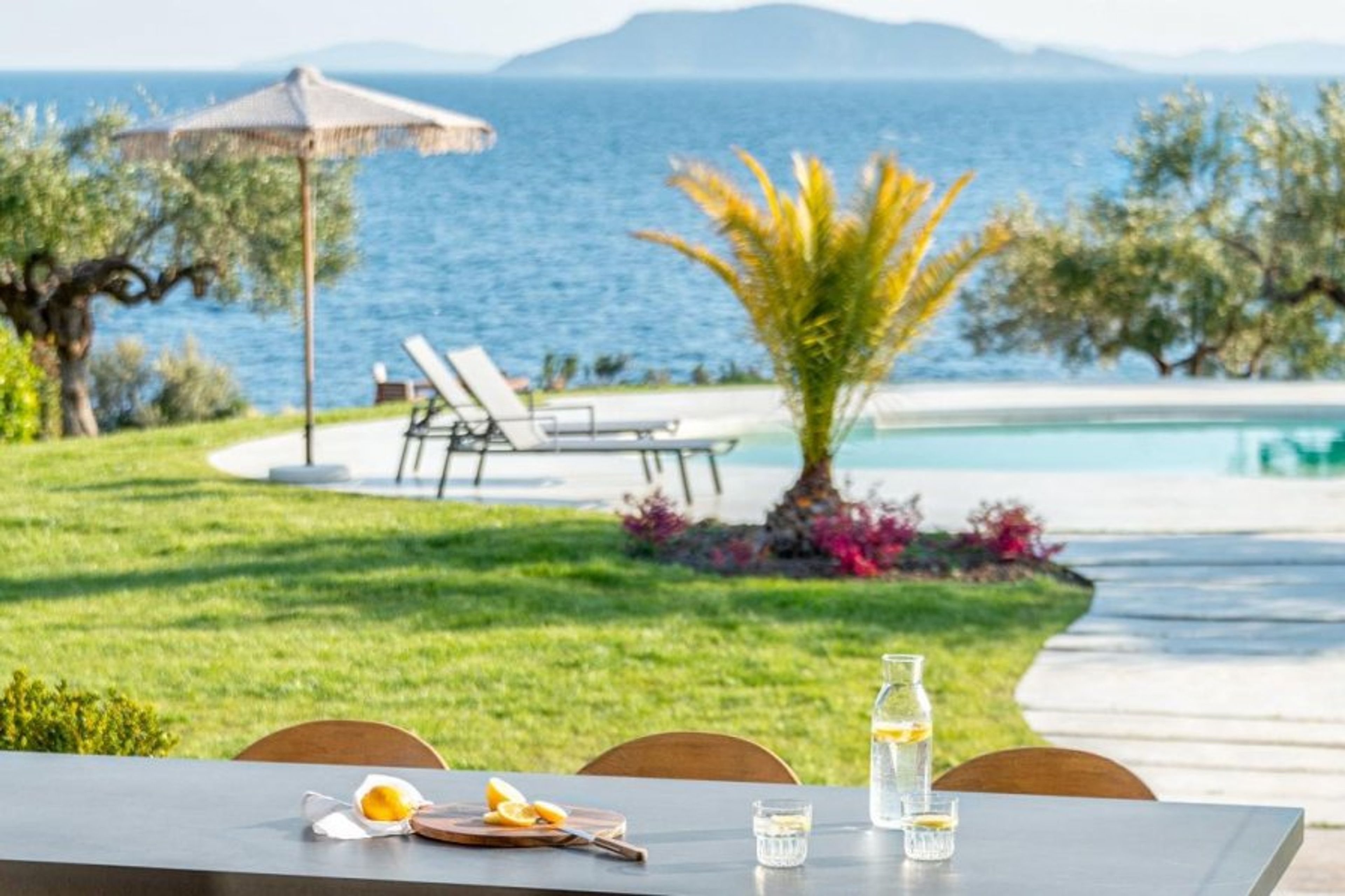 This stunning home offers amazing views of the Aegean Sea's sparkling blue waves and Sithonia's towering Mount Athos.