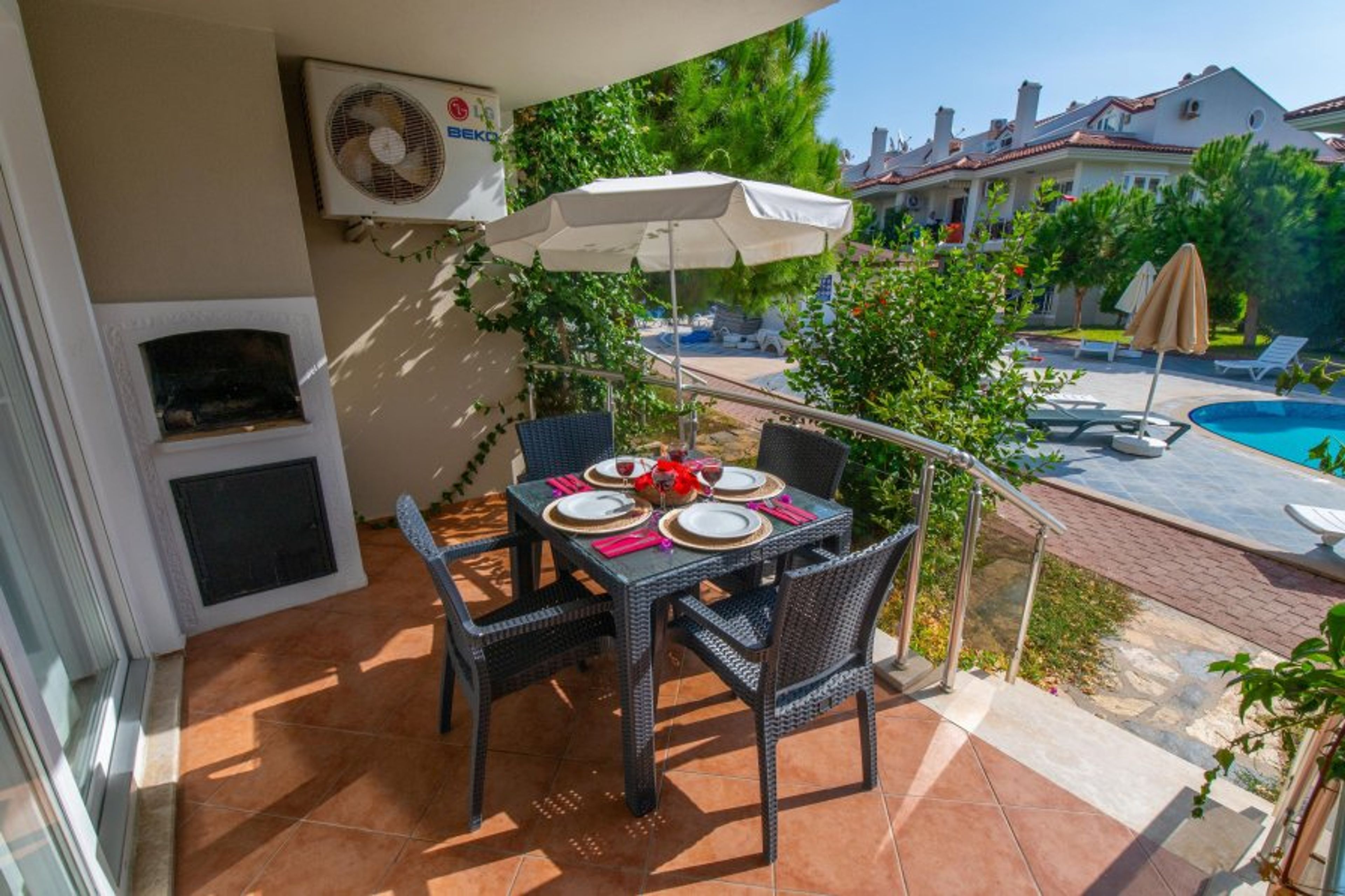 This fully air-conditioned 1 bedroom ground floor apartment has an open-plan kitchen which leads out onto the balcony, 1 bedroom and 1 bathroom (Extra bed/baby cot available). Sunset Beach Club provides you with a fun, family and relaxed atmosphere which will make it a holiday to remember. With a large balcony dining area, you can enjoy your BUİLT-İN BBQ or a cocktail whilst watching the poolside or chill out sunbathing around one of our many pools with beautiful sea views.