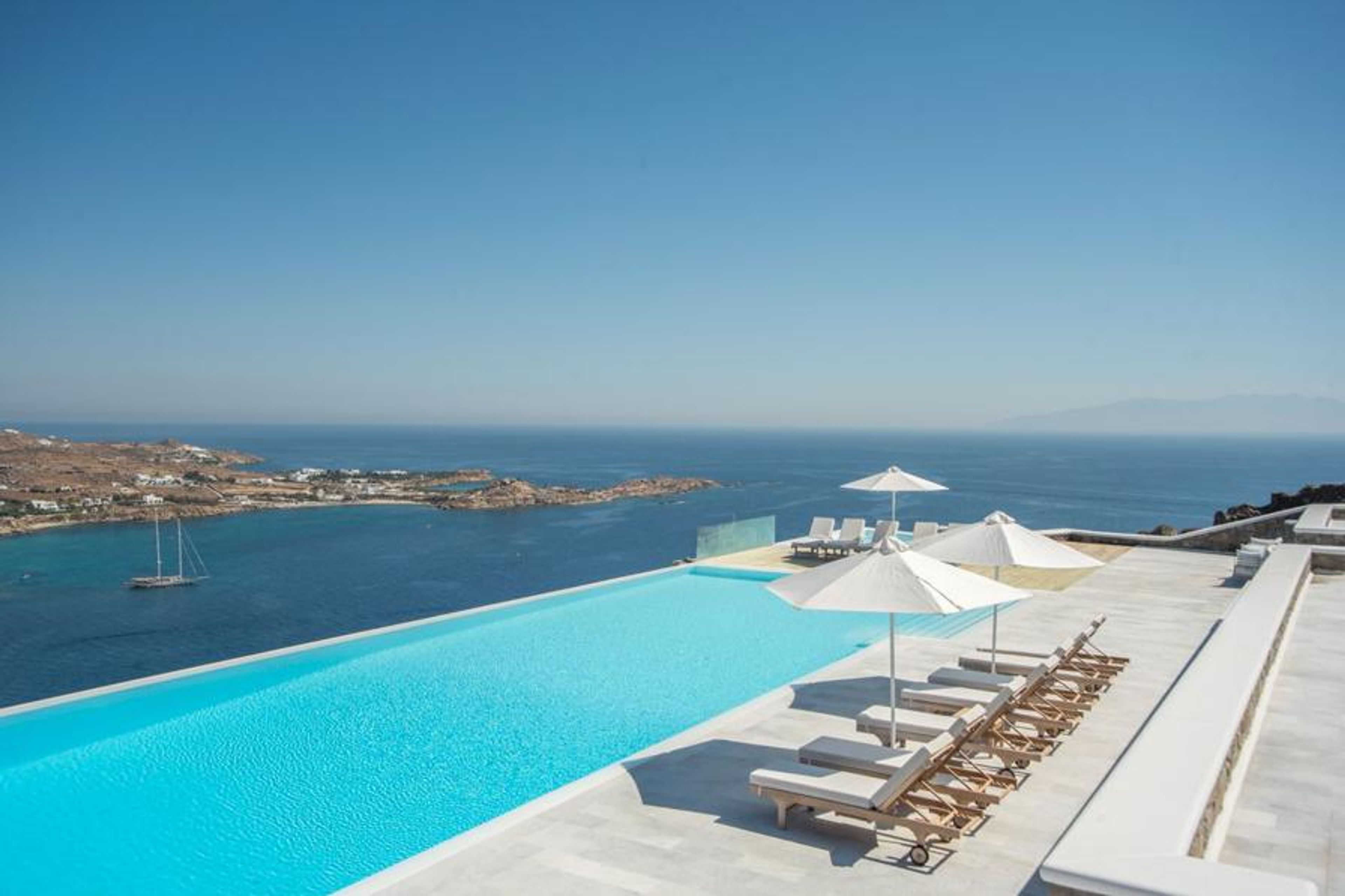 The property features private parking for up to six cars, complimentary air conditioning, Wi-Fi throughout, and flat-screen televisions in each bedroom. Its Cycladic sculpted staircase and internal elevator provide access to different levels, while the villa itself offers sweeping panoramic views of the Aegean Sea from various vantage points such as the terrace, balconies, infinity pool, and Jacuzzi.