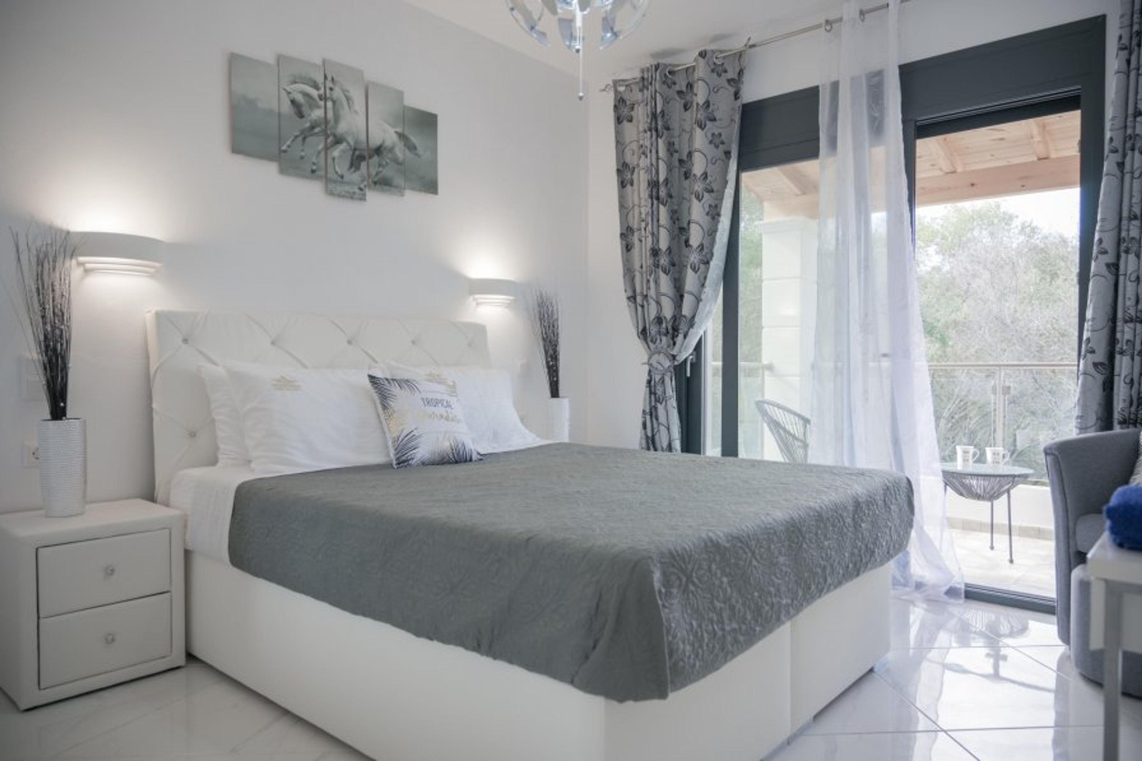 The villa has 4 double bedrooms and one room with 2 singles beds. In total the villa can comfortably sleep 10 adults, we have also extra beds for kids and baby cot.A unique villa in Corfu Island which guests can enjoy a lovely and luxurious hospitality. The elegant interior decoration fits into a very modern and functional home. he owners reside at as short distance from the villas, and personally attend to the rental of the villas as well as the customer service ensuring that their guests’ stay is as comfortable and pleasant as possible. Newly built contemporary villa, with a minimalist design, build with of the best materials and equipped for all your needs to enjoy your beautiful vacation.Get Ready We are waiting for you On the ground floor there is the spacious lounge with stylish modern furniture and atmosphere, Smart led TV, dining room and fully equipped modern kitchen. The large glass window offers plenty of light and coolness. On the same floor exist 1 large bedroom and a bathroom. You can choose between the three bedrooms with super king doubles and spacious wardrobes, each equipped with TV and one with 2 single beds. Also, the first floor has a kitchen and 2 bathrooms. The terrace of the bedrooms offers you breathtaking view and the possibility of being isolated from the rest of the company when you wish.