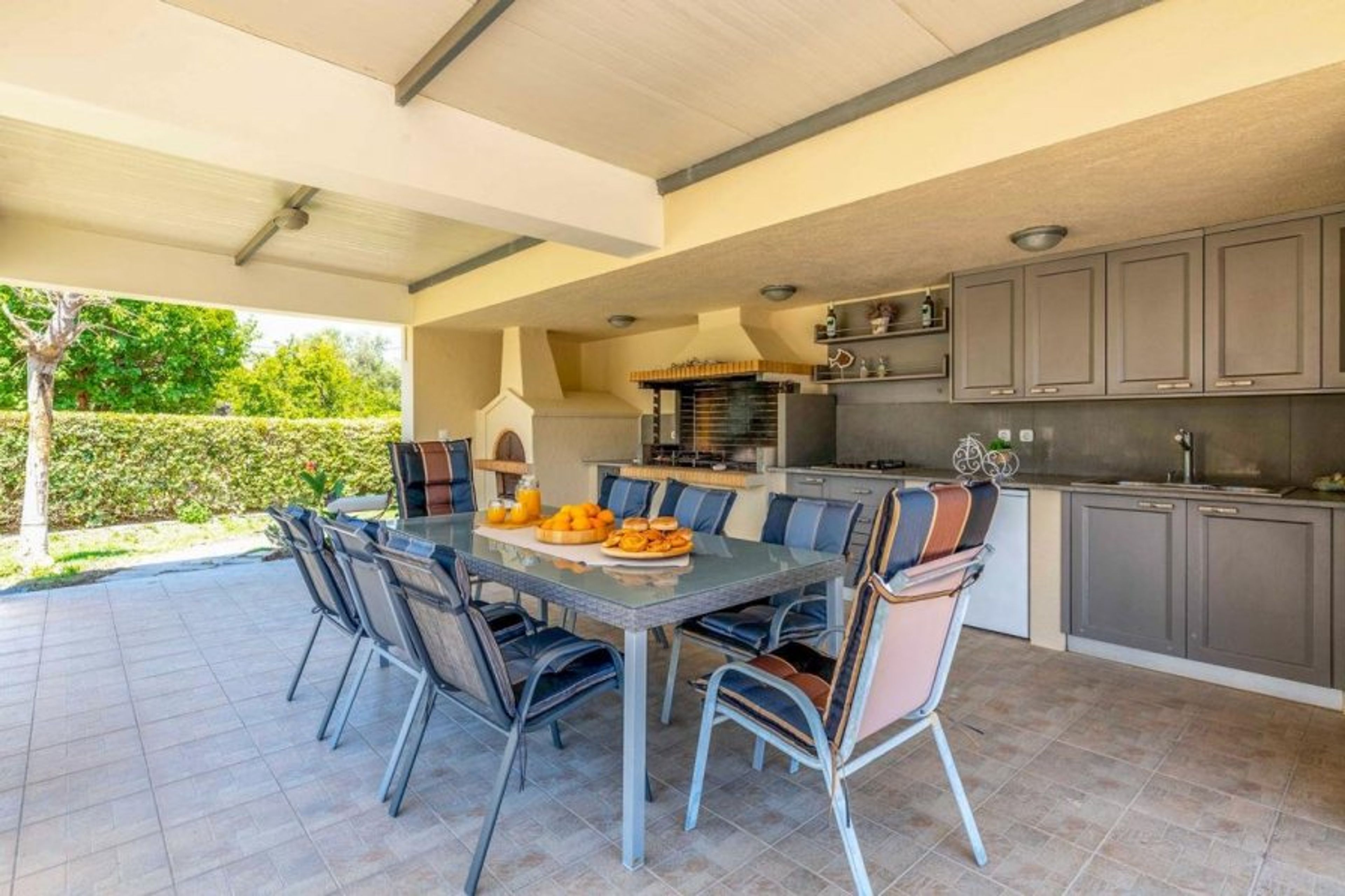 It has a great outside kitchen with a barbeque and pizza oven and is shaded.