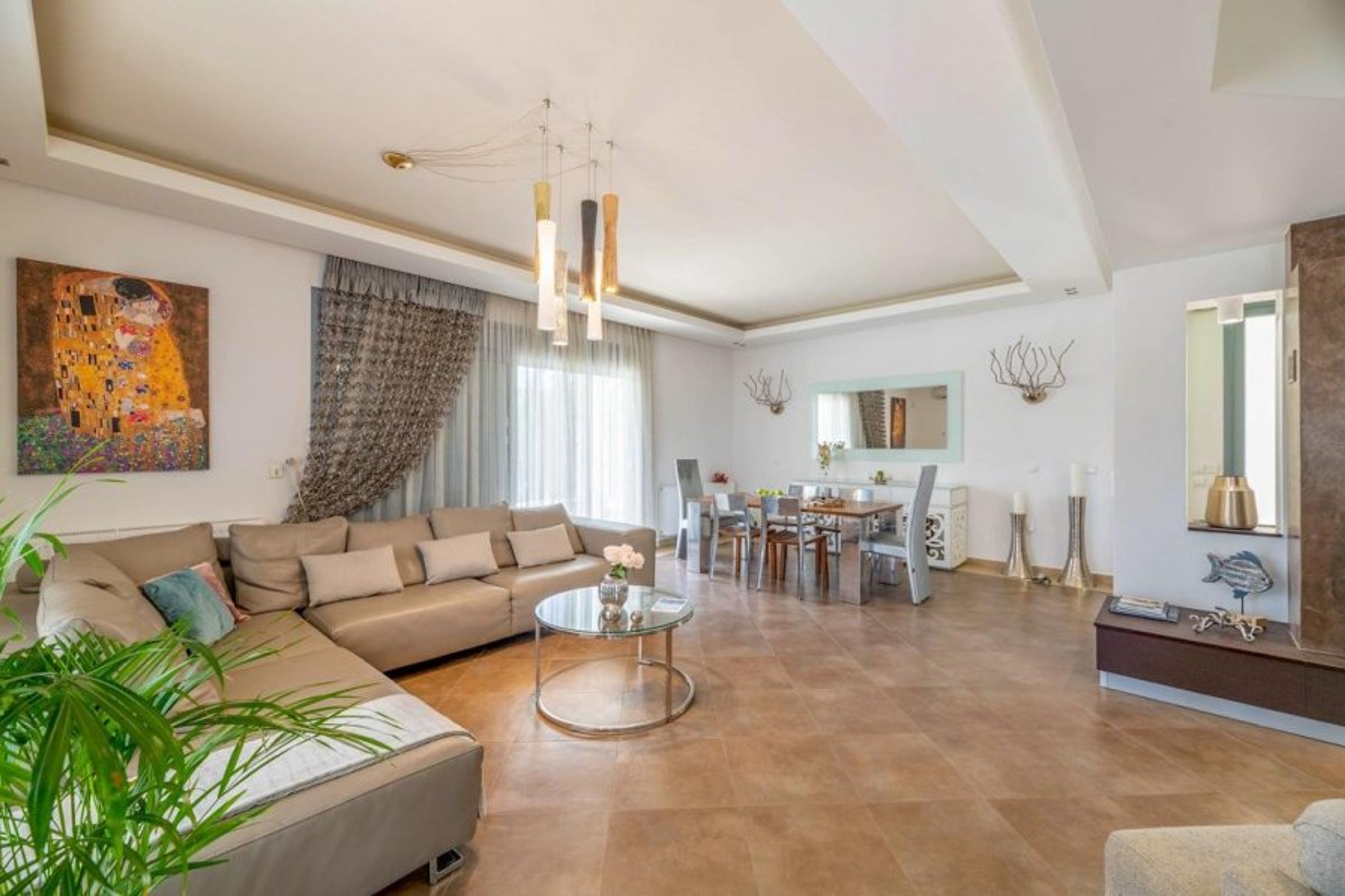 It effectively provides a sizable gathering area with a contemporary corner sofa, dining table, and cosy television nook with additional sofas.