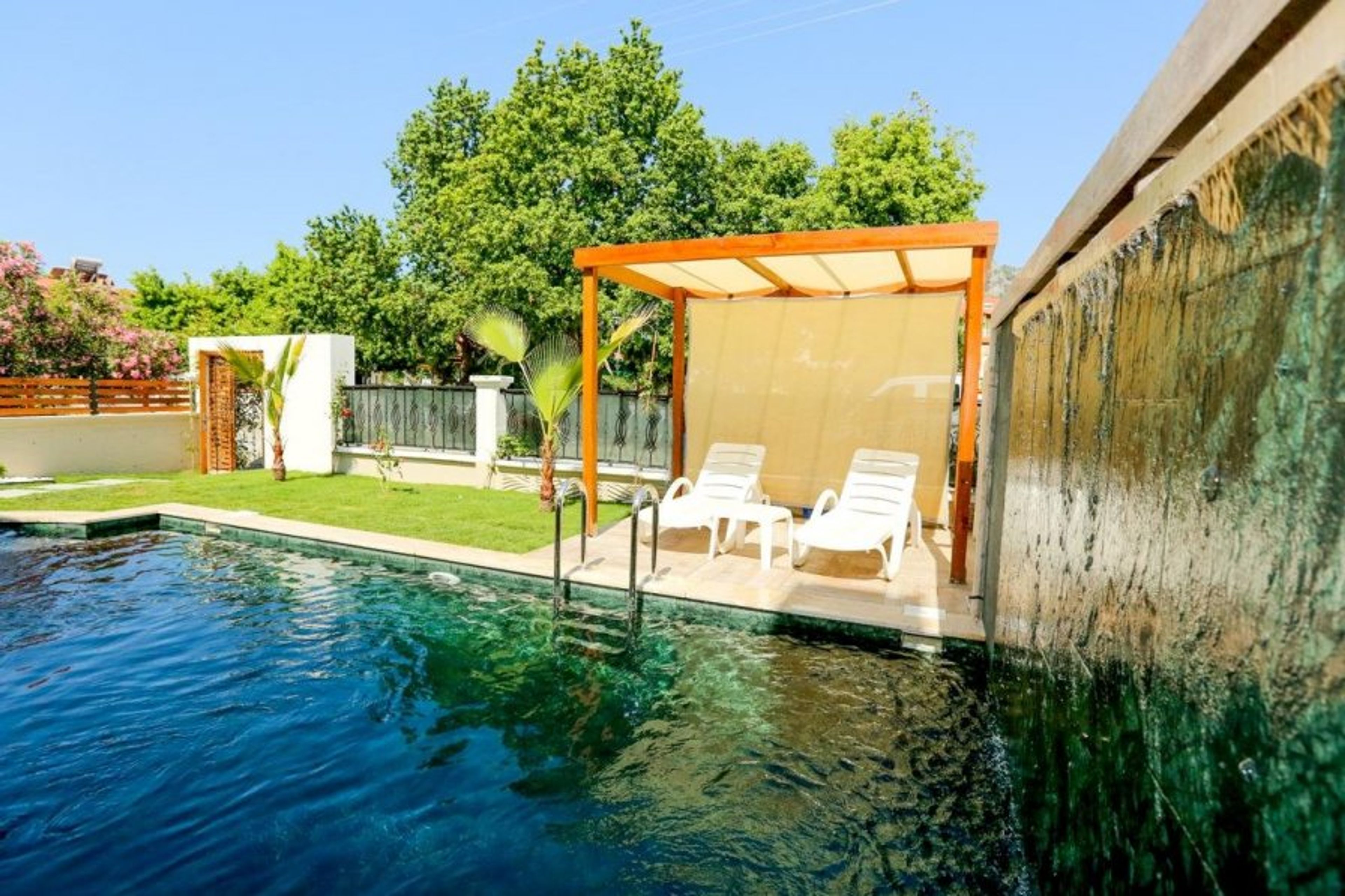 At the front of the villa is a gorgeous ladder-entry pool with a jacuzzi spa for fun in the sun bubbles at one end and a waterfall shower to cool you off at the other.