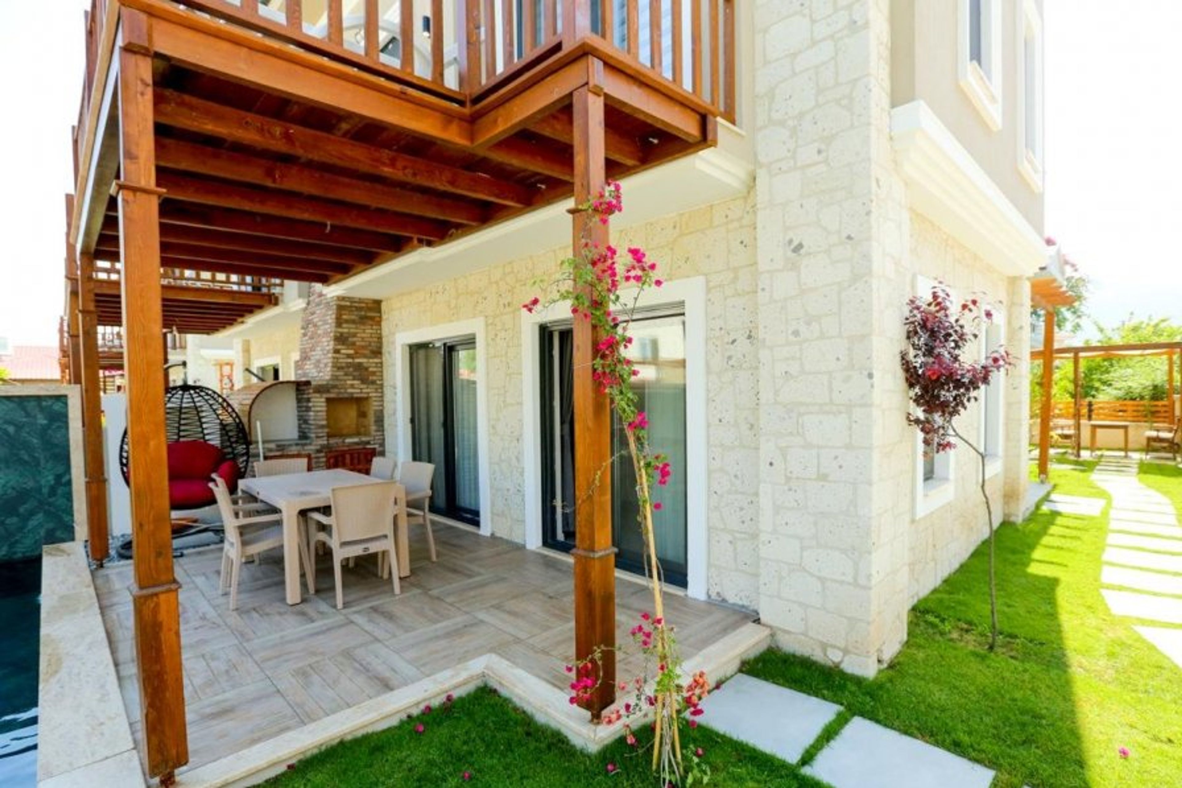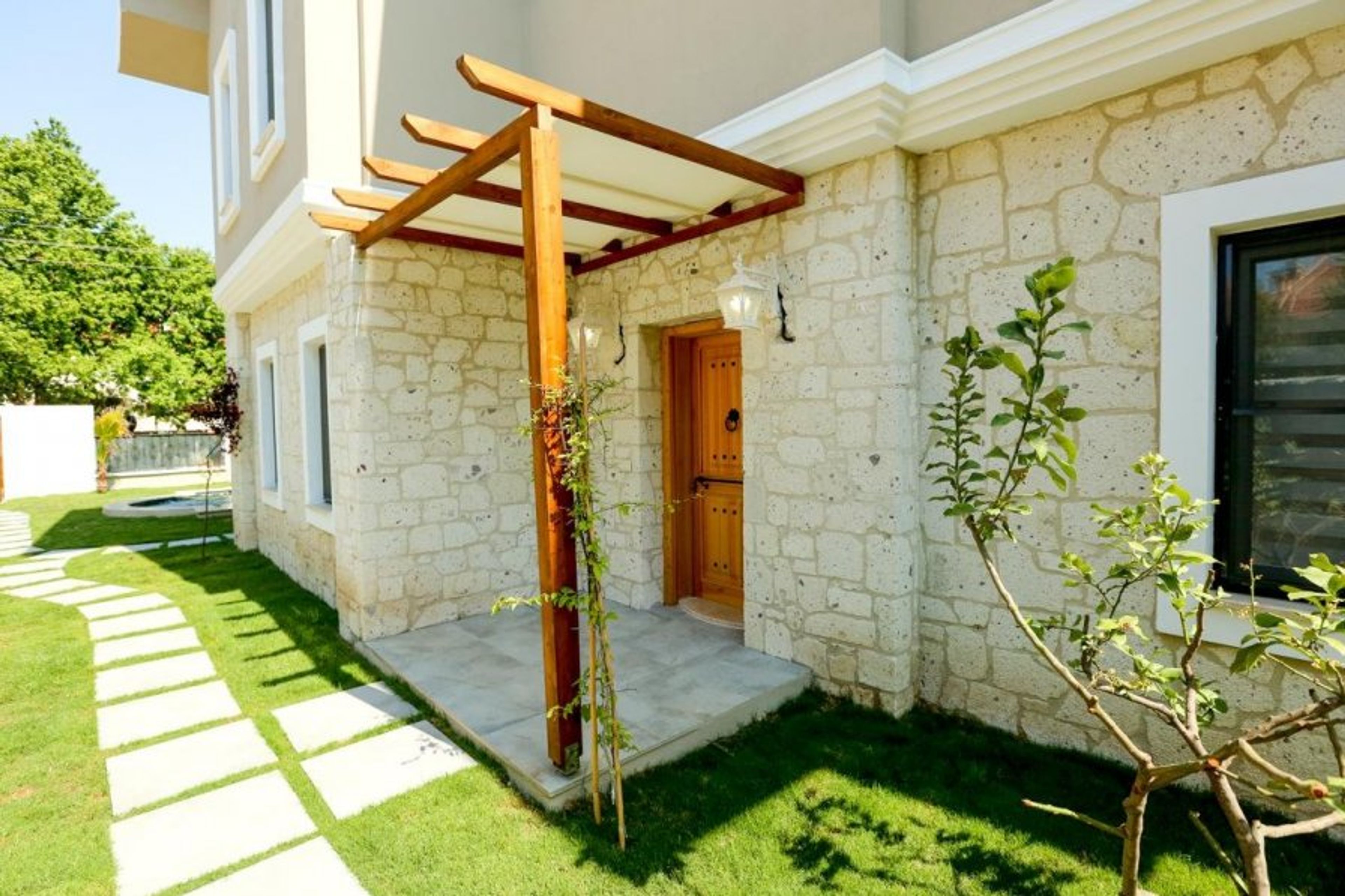 To reach the villa's private garden and lounging area, use the stone pathway that winds through the villa's lush green lawns.