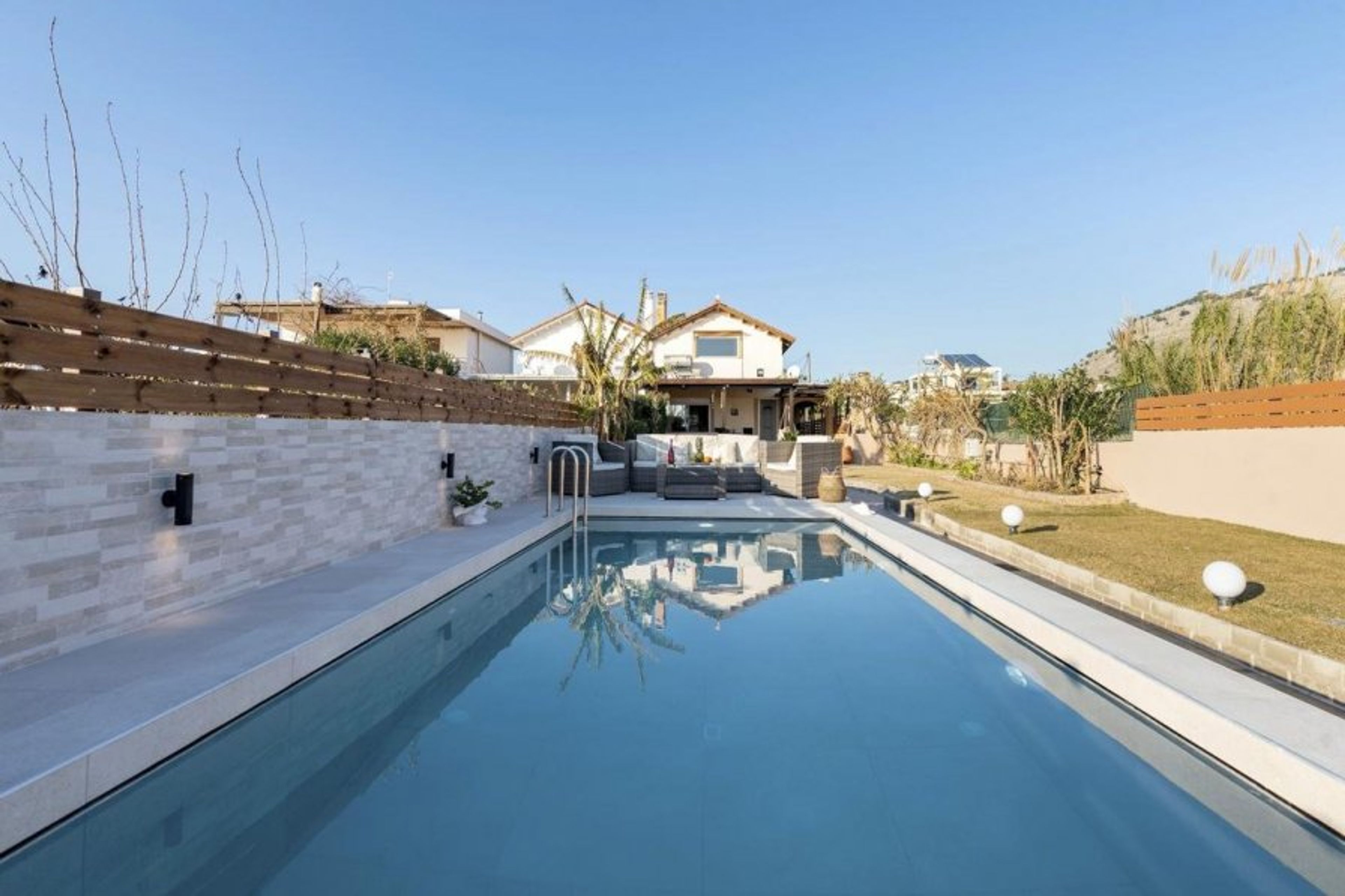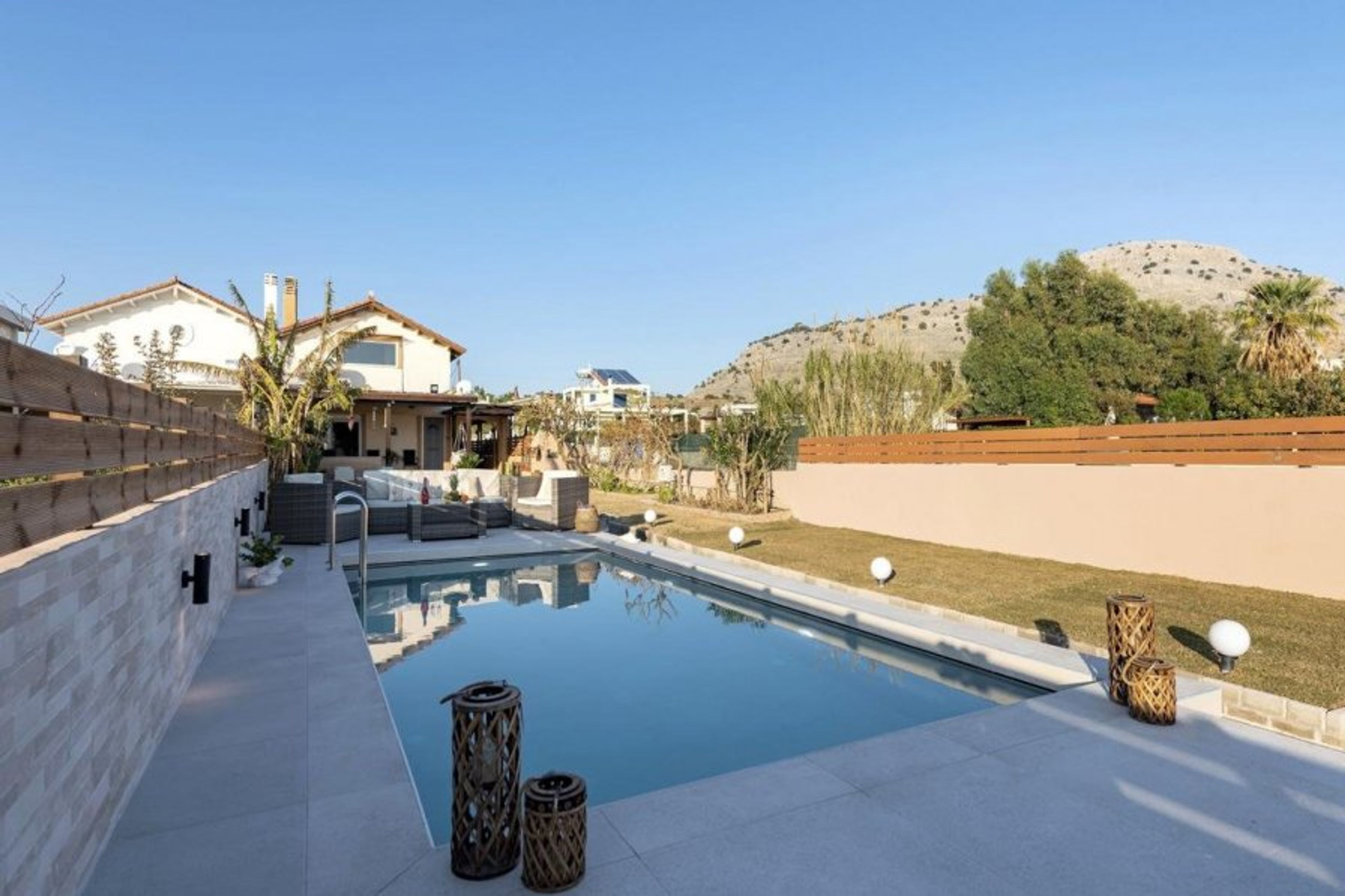 This serene property can accommodate up to 10 people and is located just steps from the beach. You'll adore the huge pool and its wide terrace with lounge chairs facing the ocean. On Rhodes' southern coast, there are sun loungers, parasols, a sizable BBQ, as well as a covered dining area.