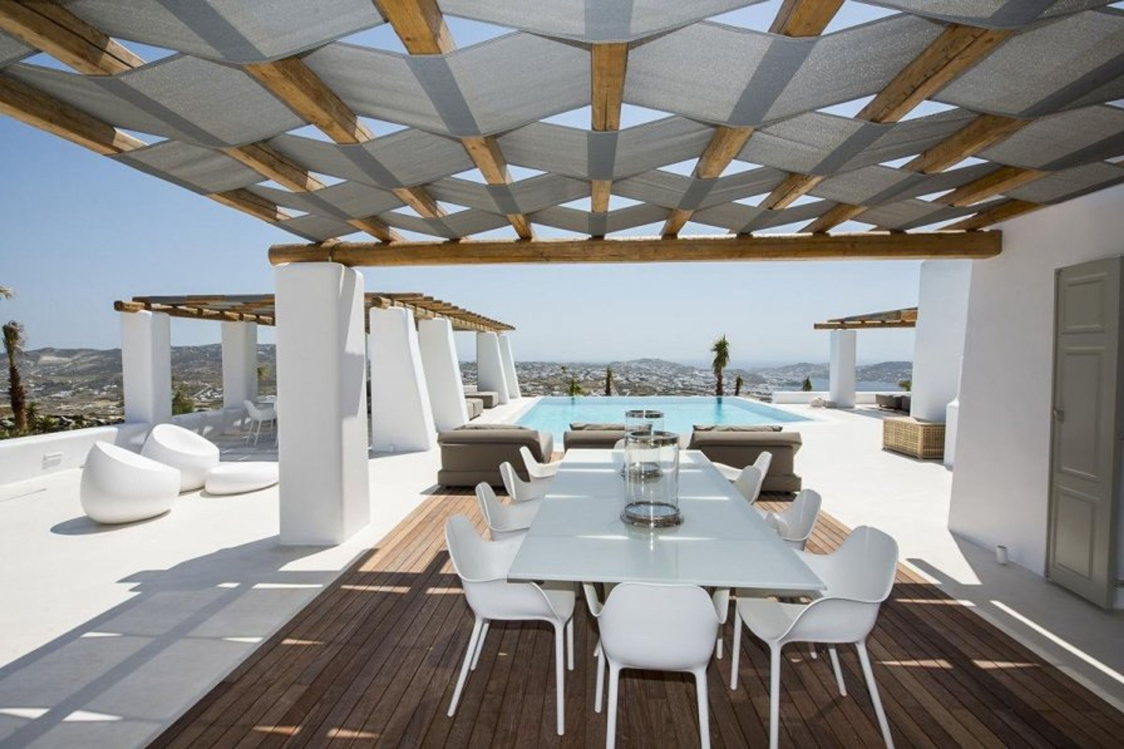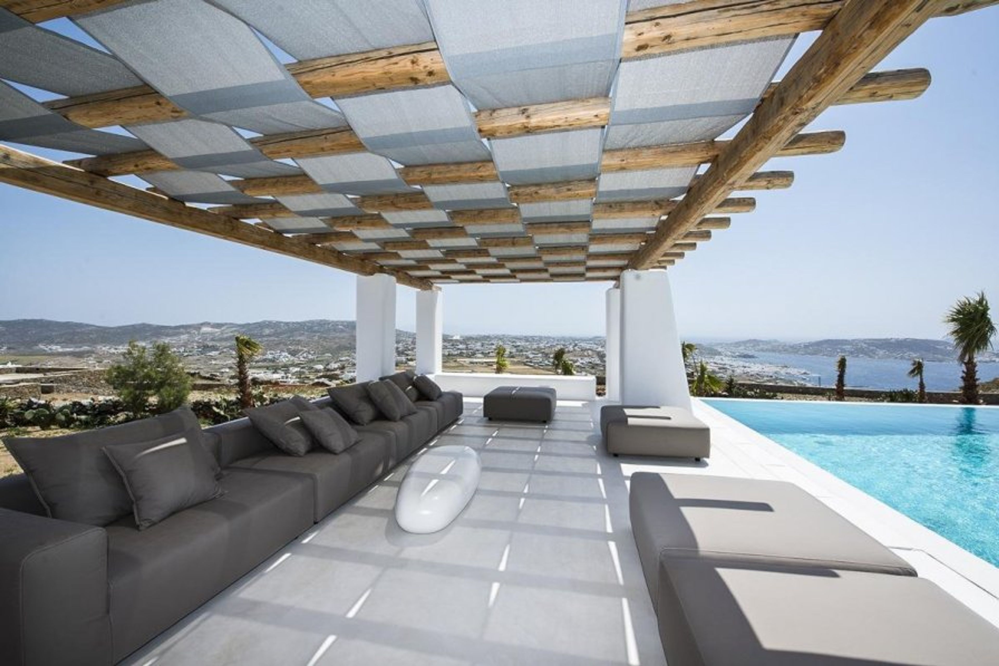The villa's stunning infinity pool is located outside, where it wonderfully complements the Aegean Sea's deep blue colour as well as the whitewashed and stone facade. Beautiful outdoor seating and dining areas are shaded from the sun by modern sail gazebos. The patio furniture is stylish and incredibly hip. The expansive views are truly breathtaking. The allure and exciting nightlife of Mykonos are just around the corner, but guests hardly ever want to leave this magnificent property!