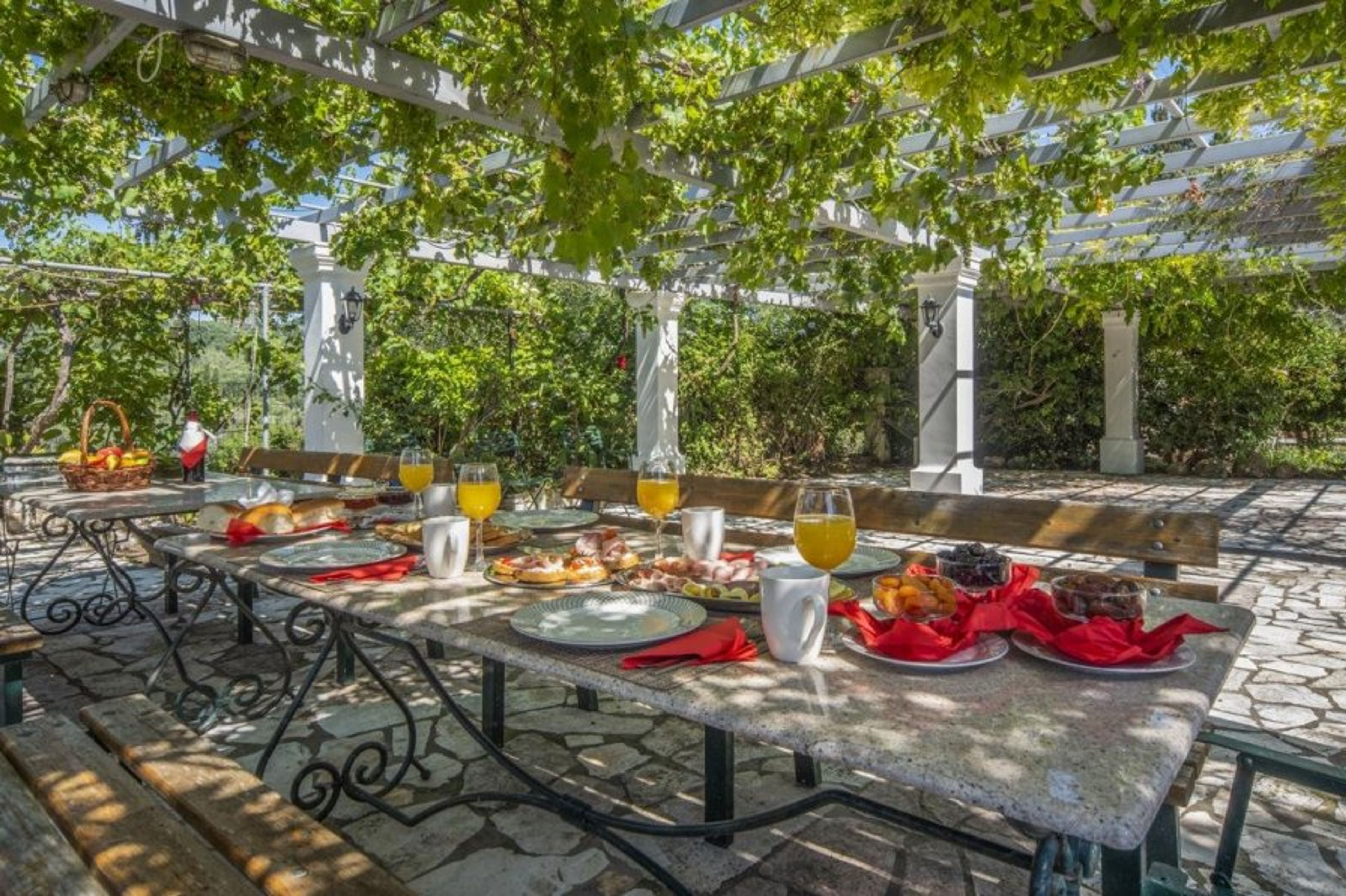 The vine-draped pergola provides welcome shade during your meal.