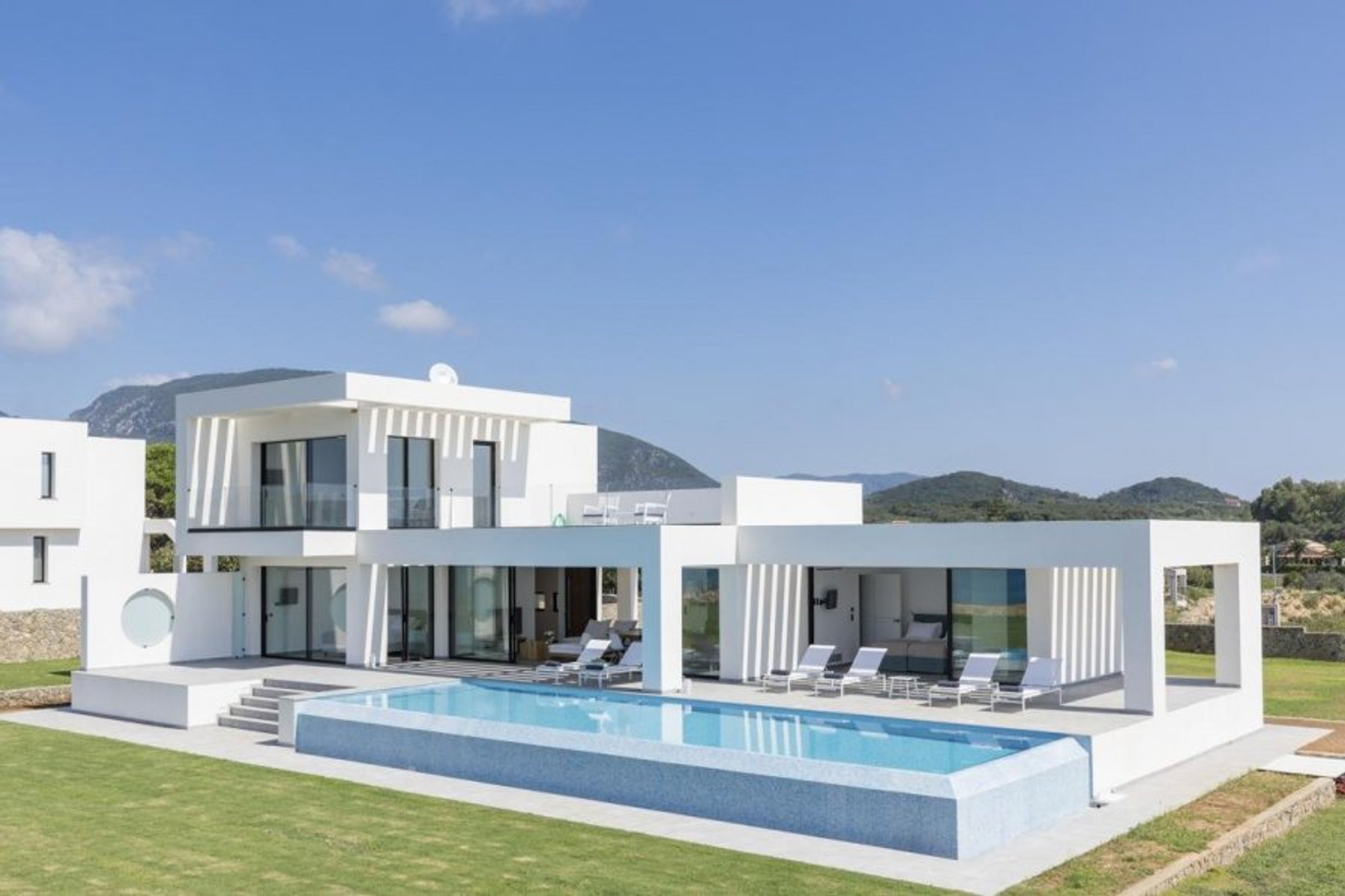 Its sprawling, gleaming white architecture is sure to impress, especially when set against the lush green lawns that surround the villa.