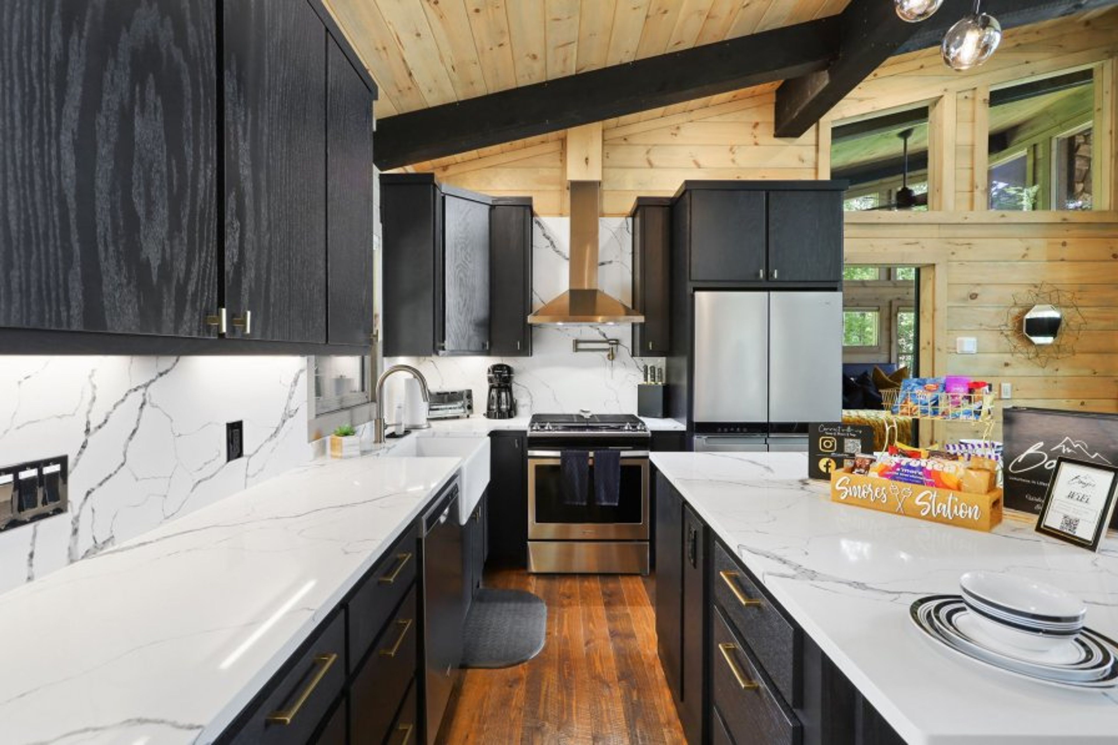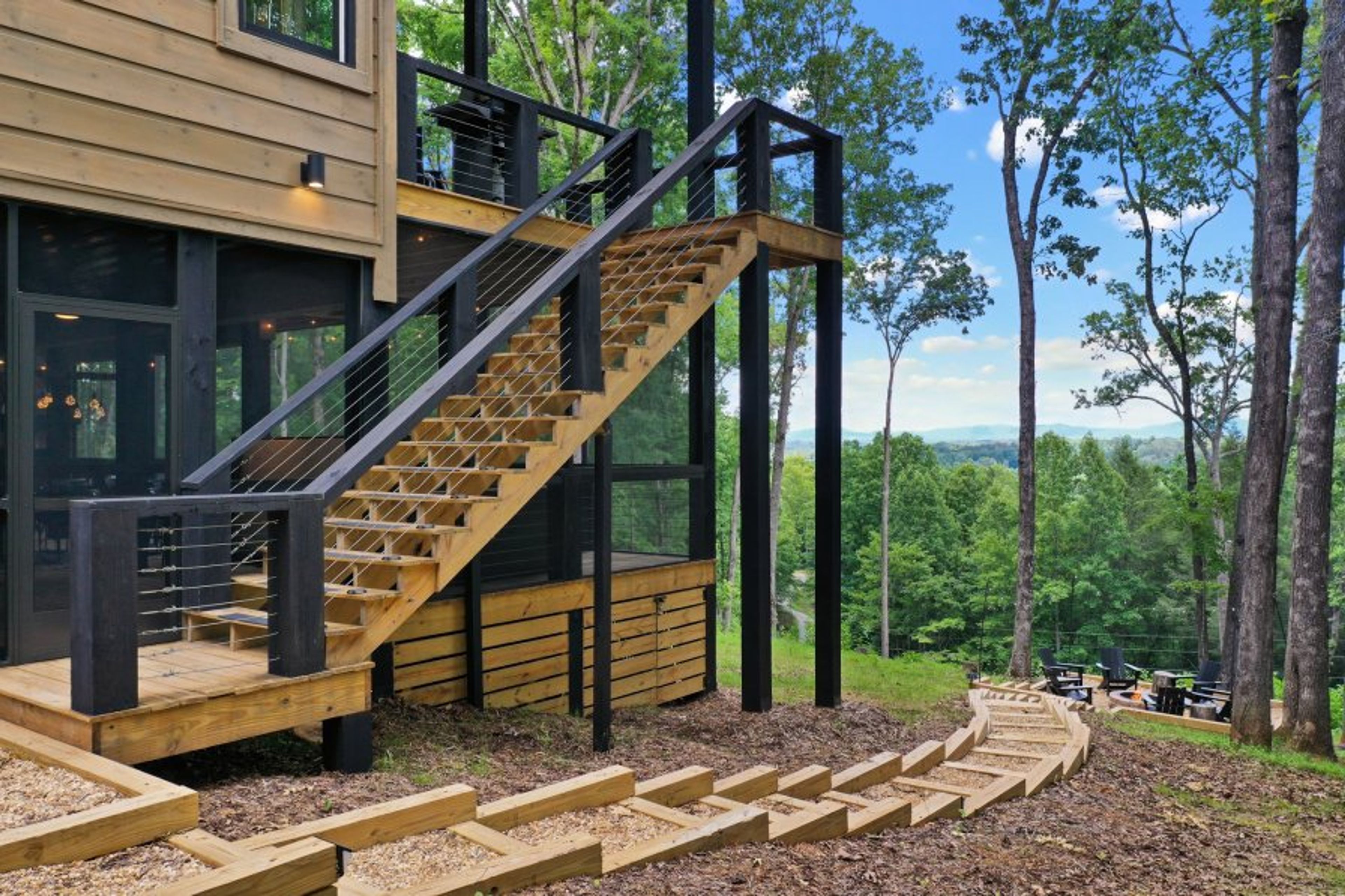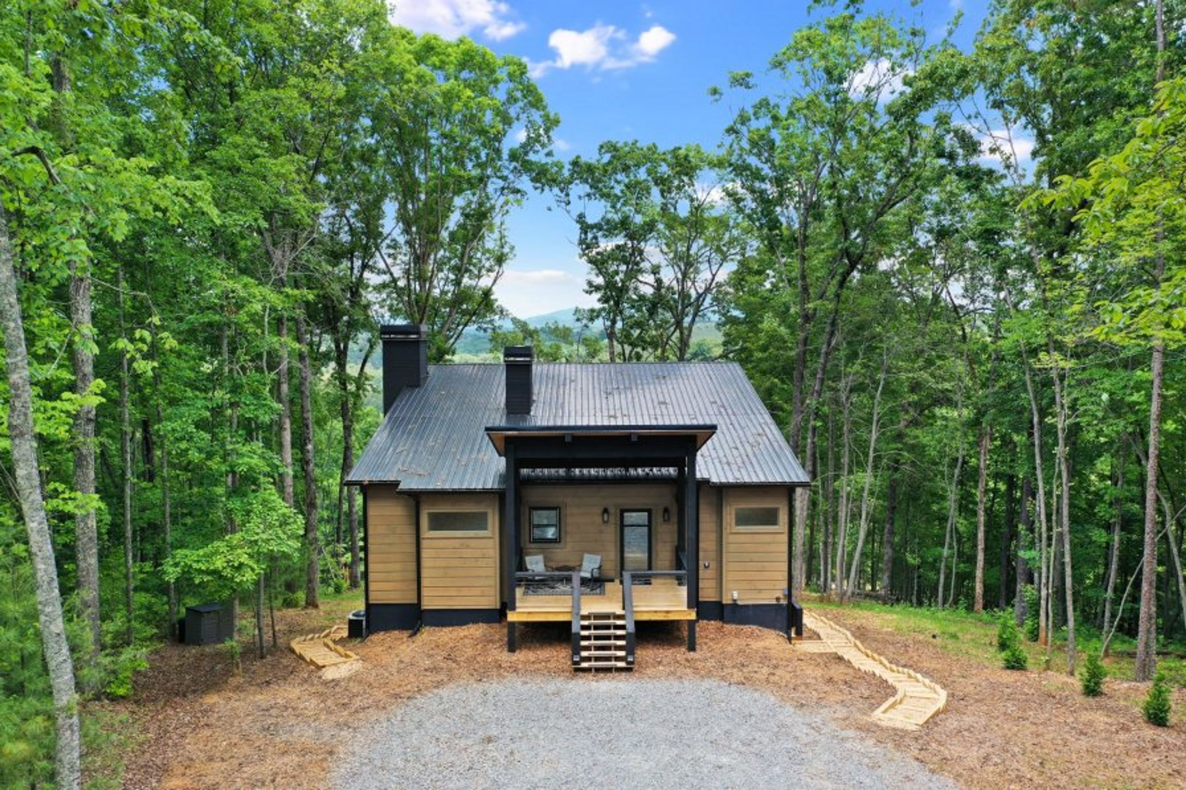 Serenity awaits at this charming cabin nestled in the mountains of Blue Ridge, Georgia. This newly built ultra-trendy, modern-rustic luxury retreat overlooks breathtaking layered mountain views which are perfectly showcased by an abundance of floor-to-ceiling windows implemented into the home’s exquisite architecture. Start your morning with a peaceful walk at sunrise, or simply unwind on the full-size swing bed by the wood-burning stone fireplace while enjoying the beauty and serenity of nature. Renew your spirit on a day hiking to local waterfalls or horseback riding on forested trails, followed by a tranquil soak in the hot tub boasting spectacular views.