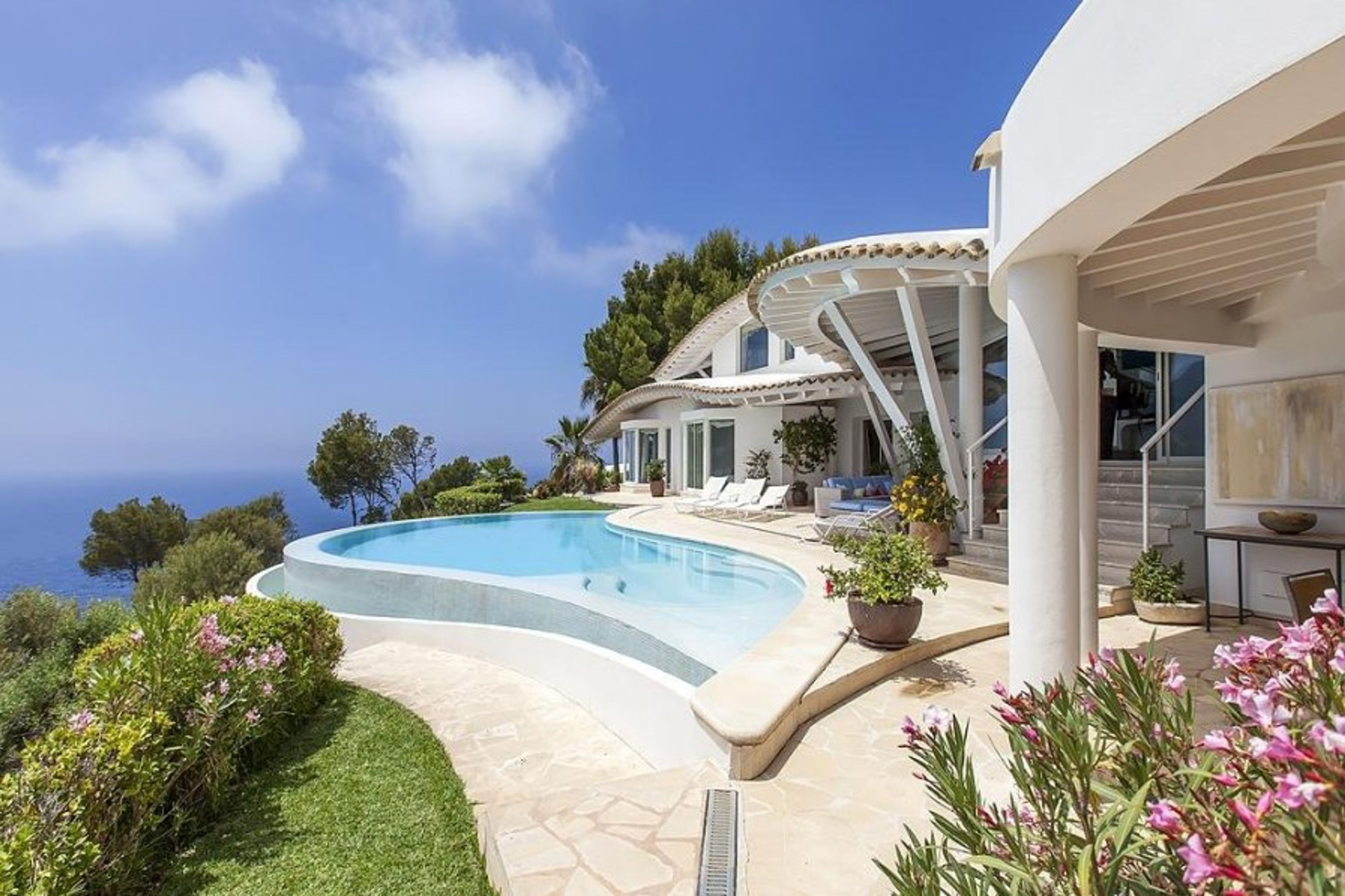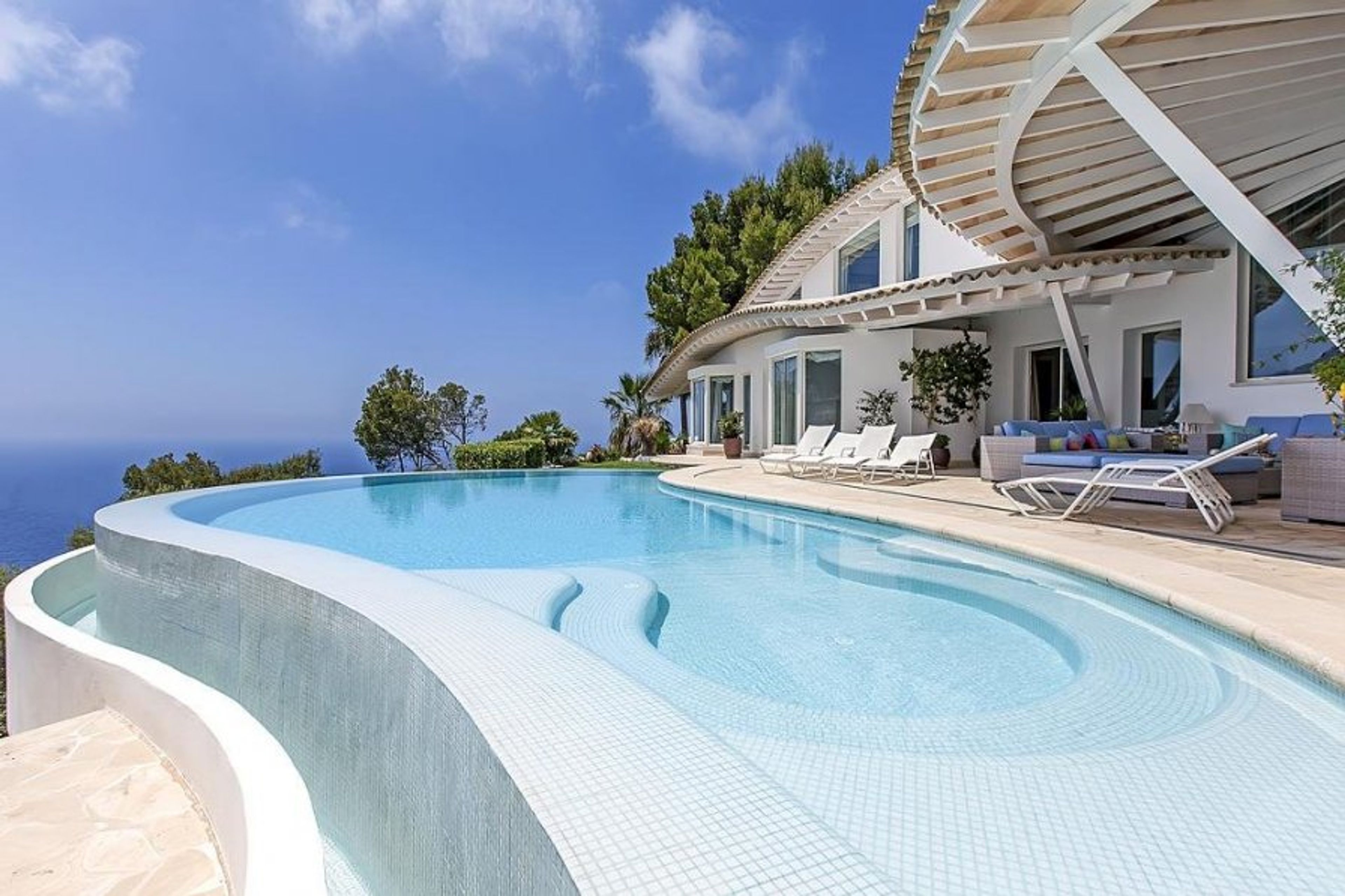 The infinity pool with views of the ocean, which is the centerpiece of this opulent property and is flanked by lovely terraces, is the outside attraction.