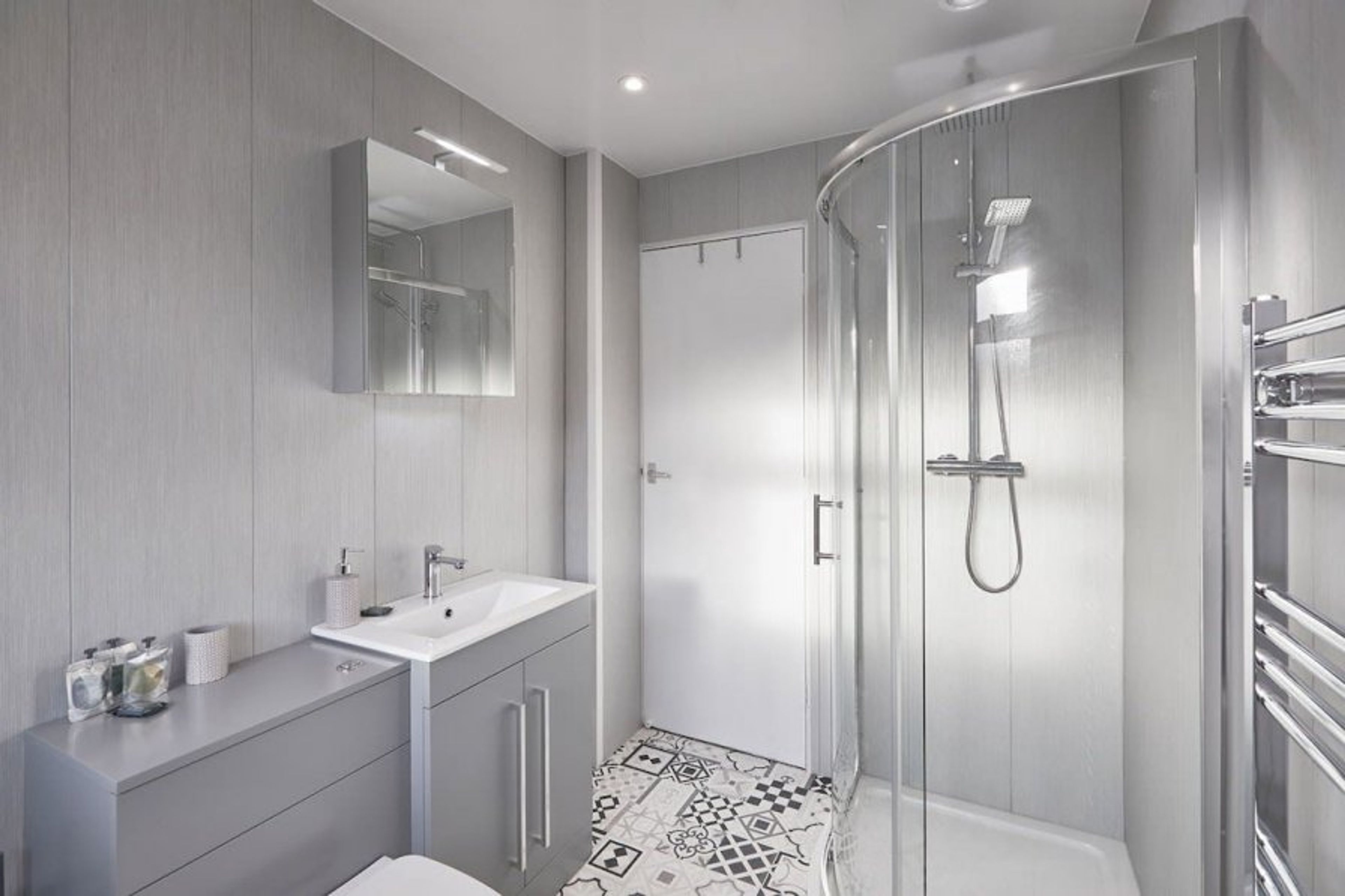 The bathroom at Station Cottage has a bathtub, separate walk-in shower, WC and wash basin, all in amongst a light grey colour scheme.