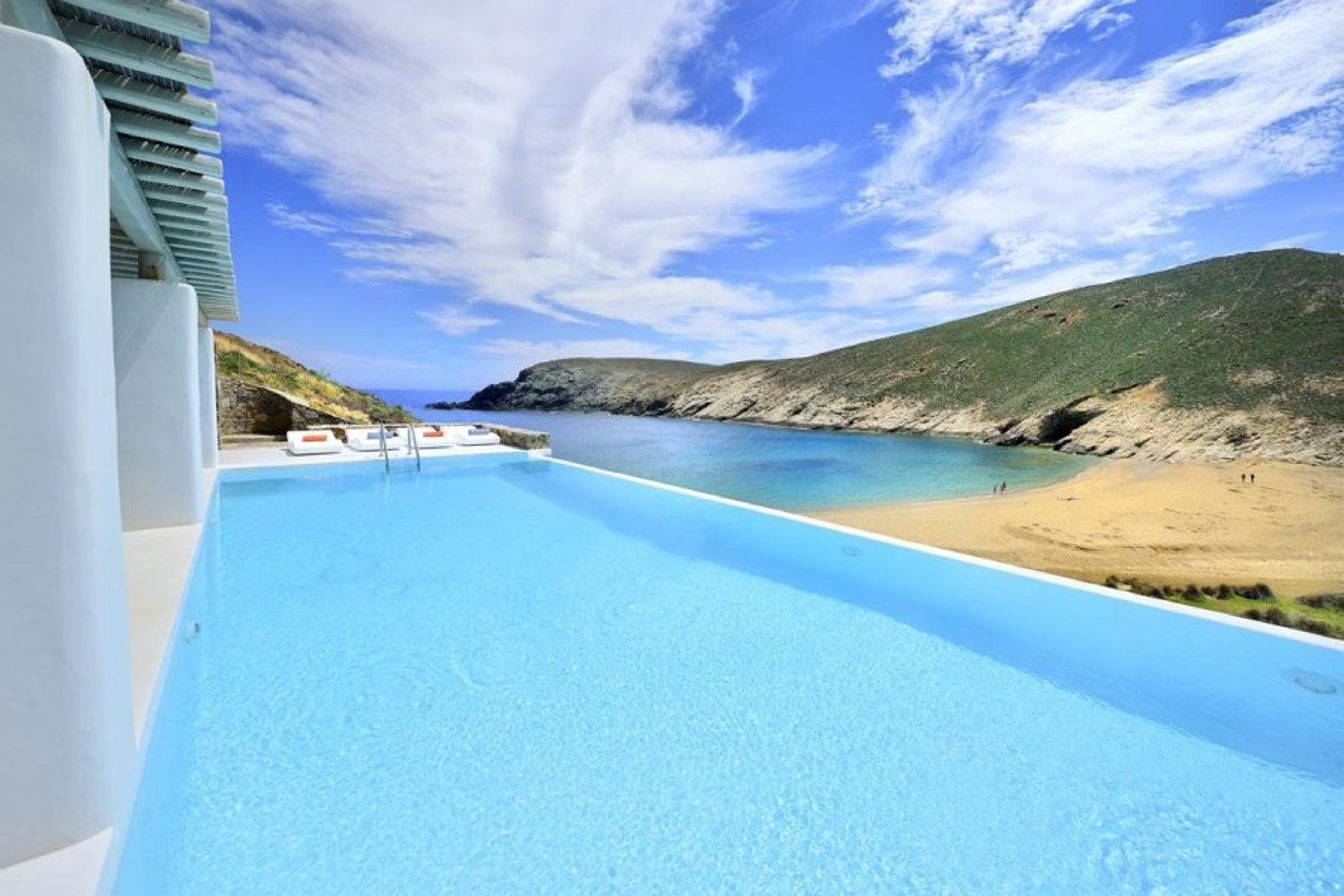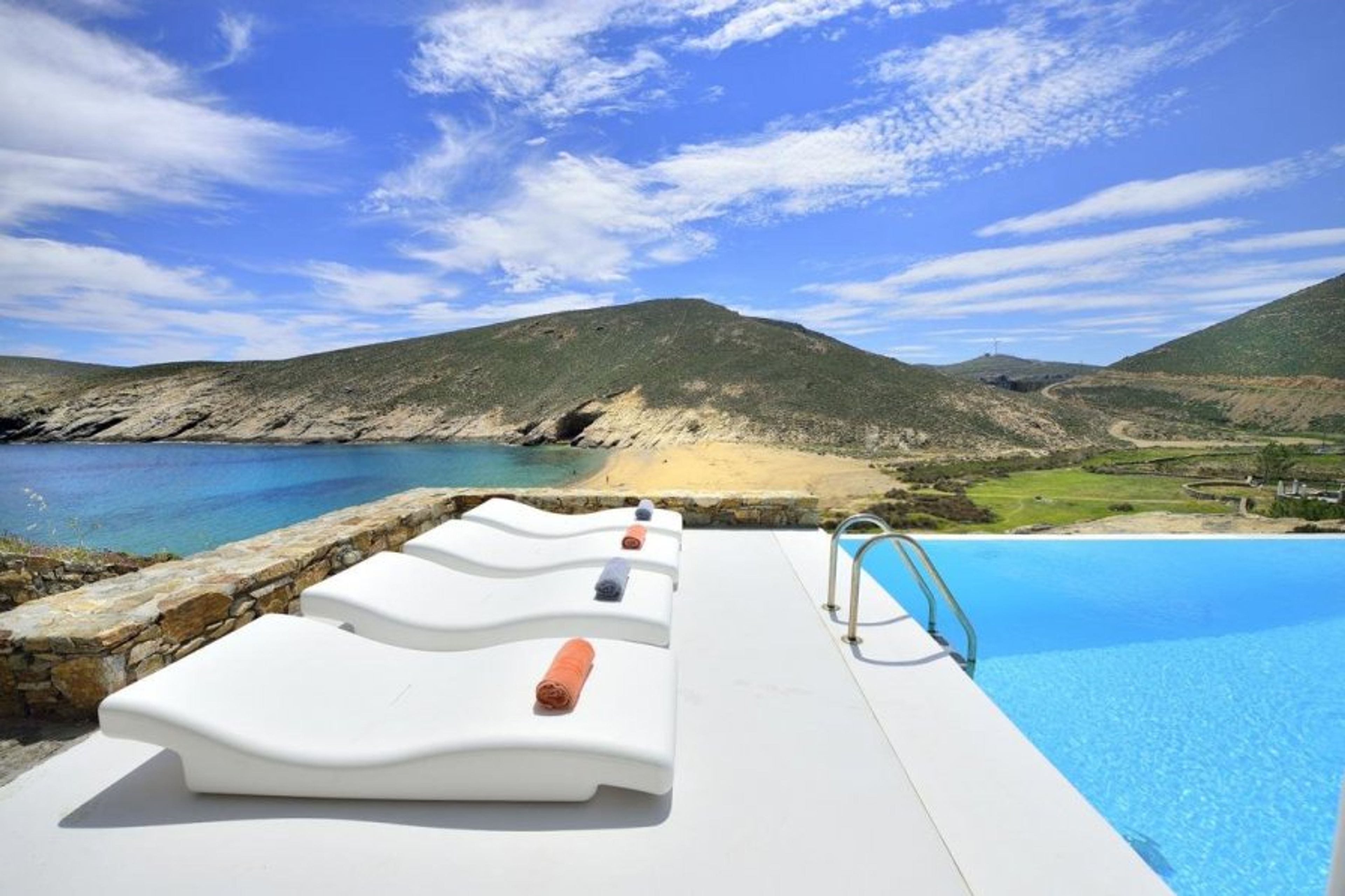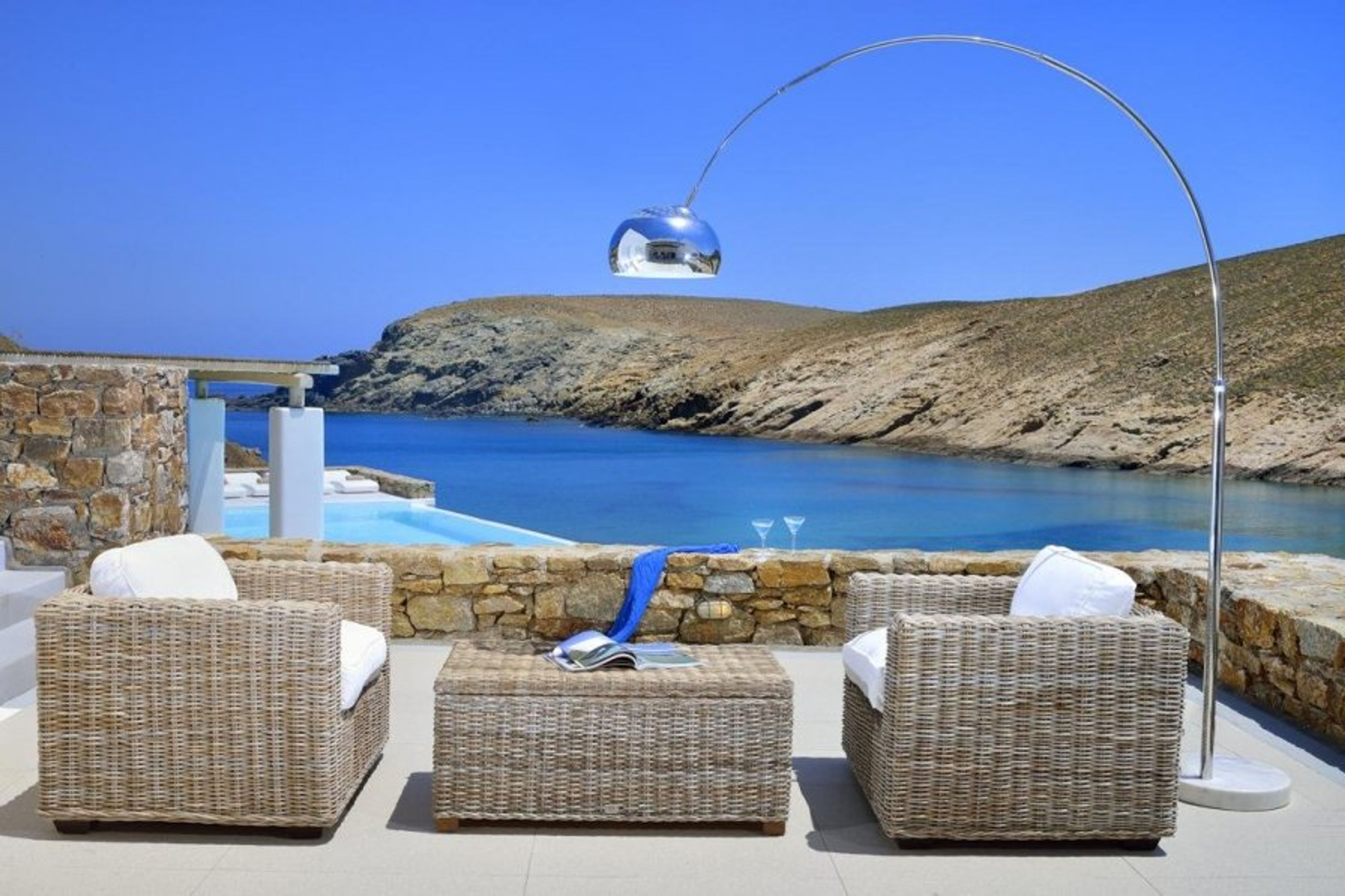 This opulent villa is offered by Cosmic Villas in a breathtaking setting where it enjoys natural light and breathtaking views of Mykonos's untamed and undeveloped Fokos Beach.