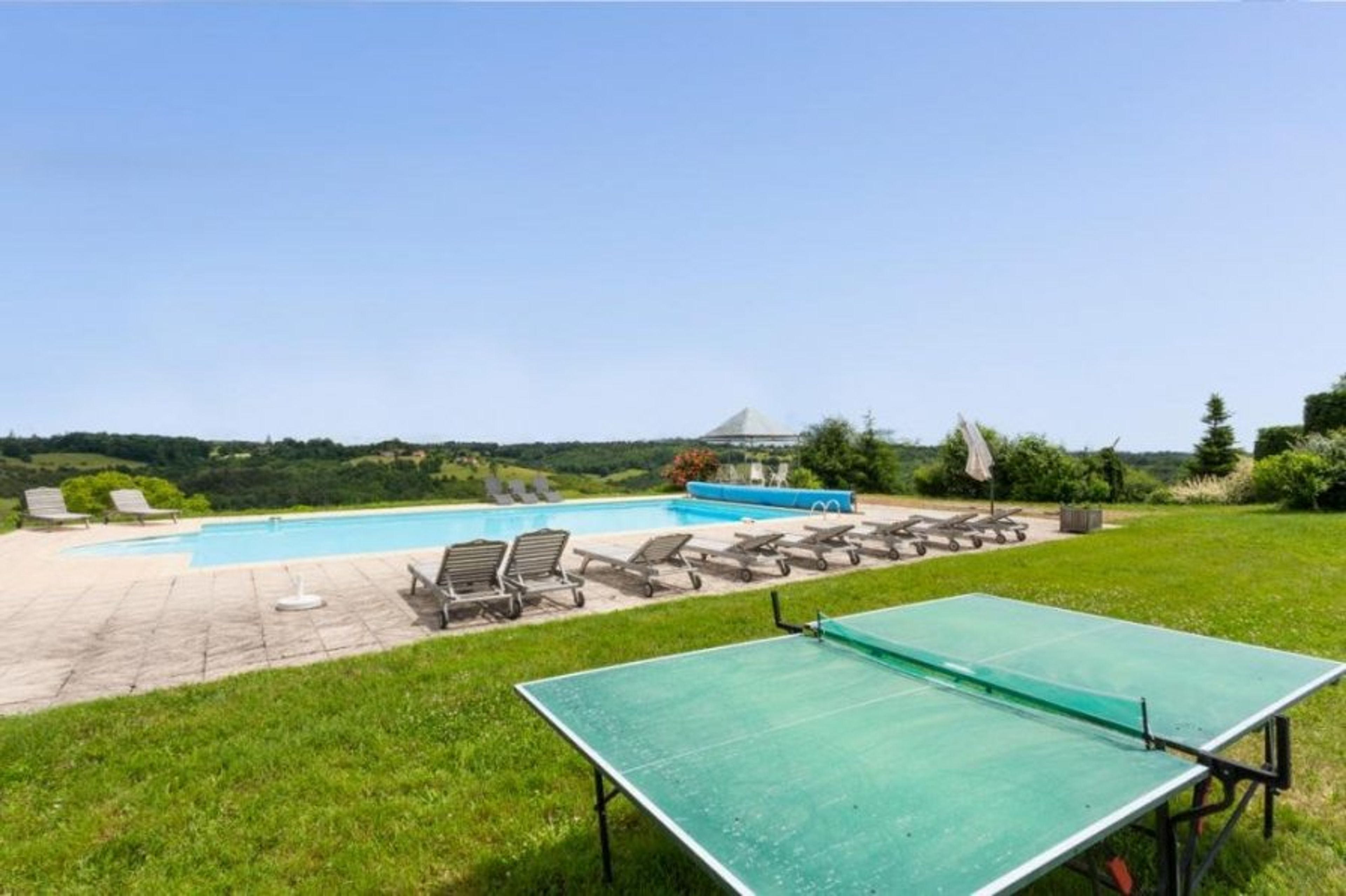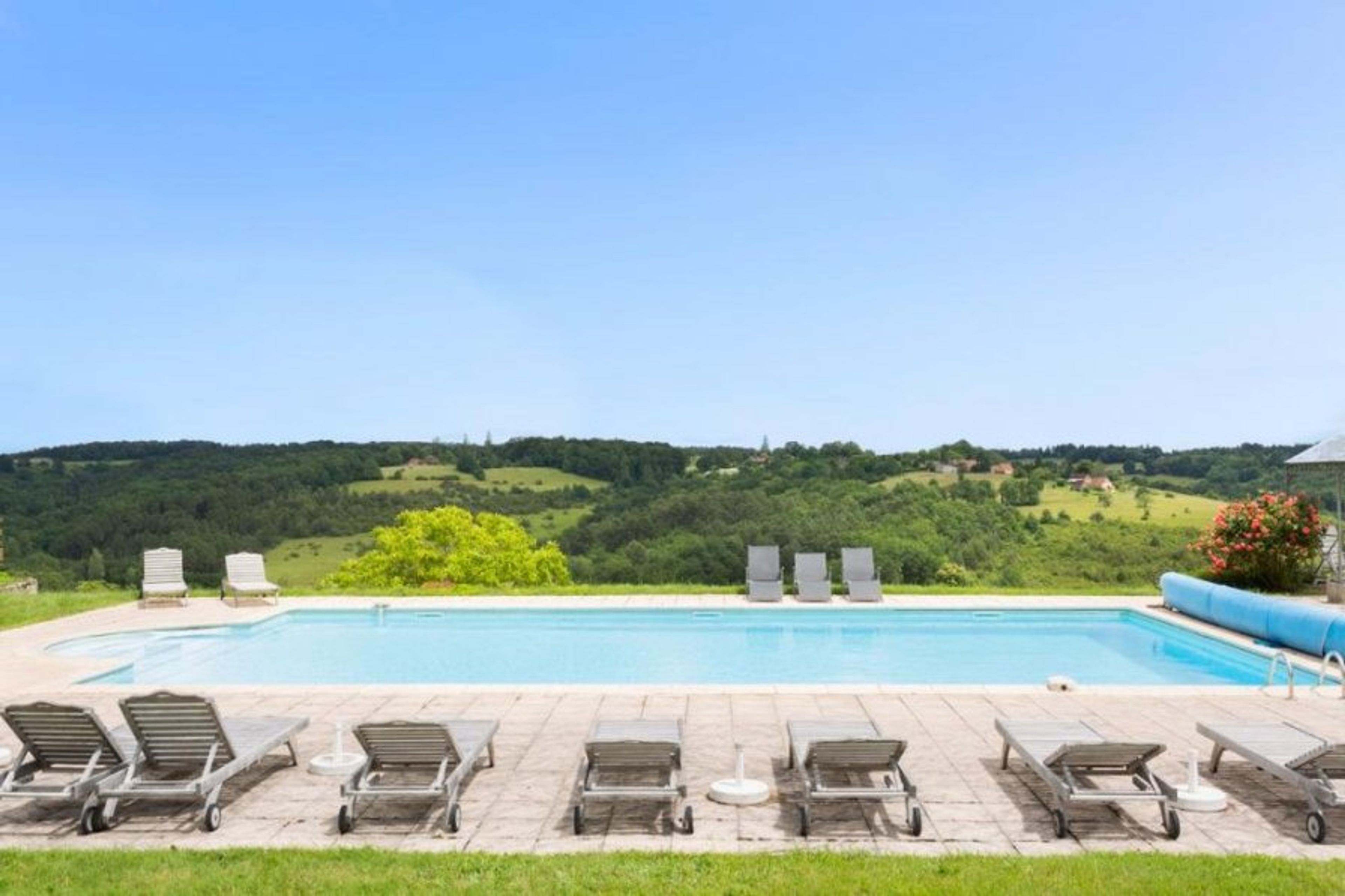 The glorious outdoor swimming pool boasts beautiful views over the surrounding valley.