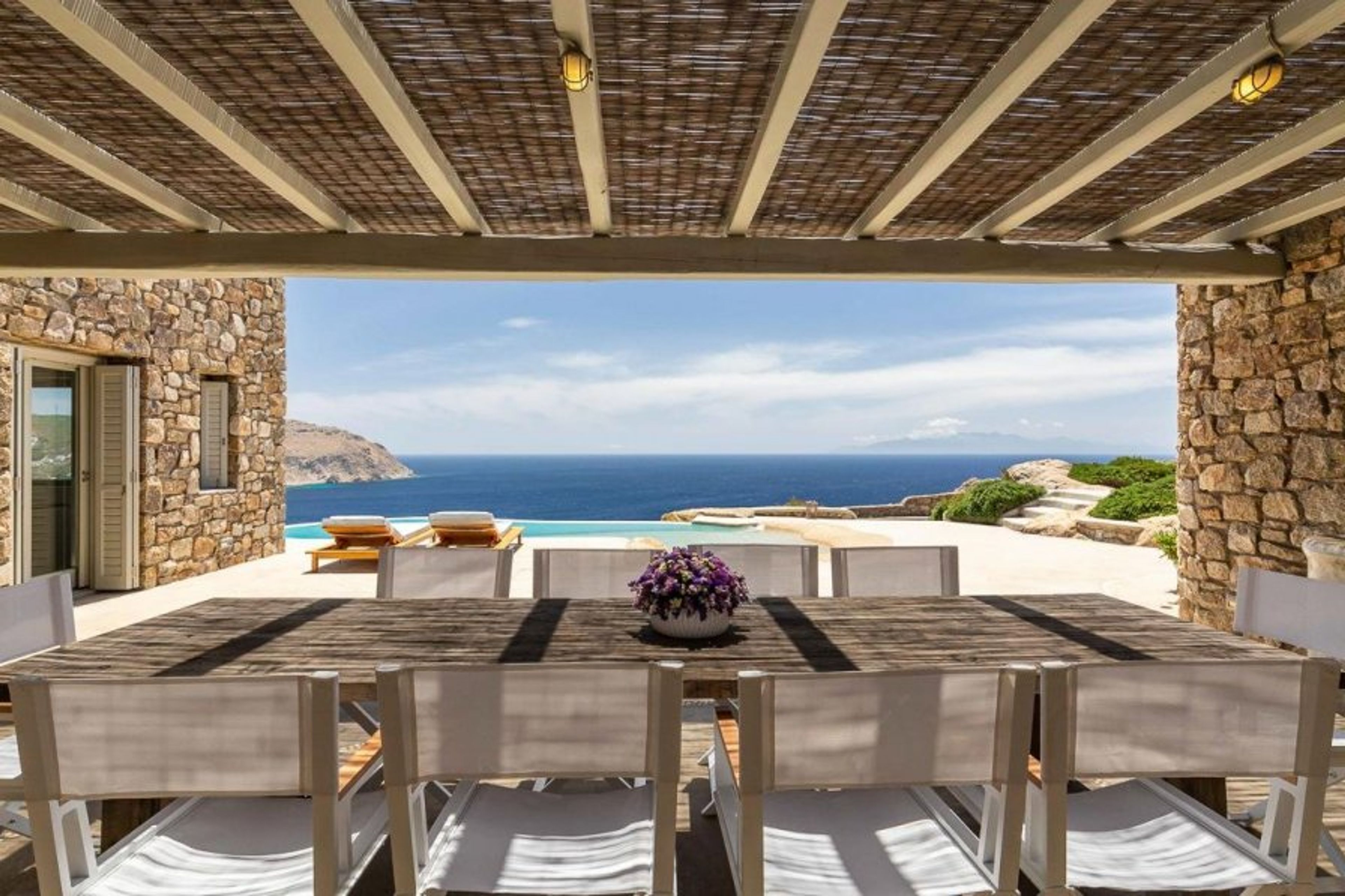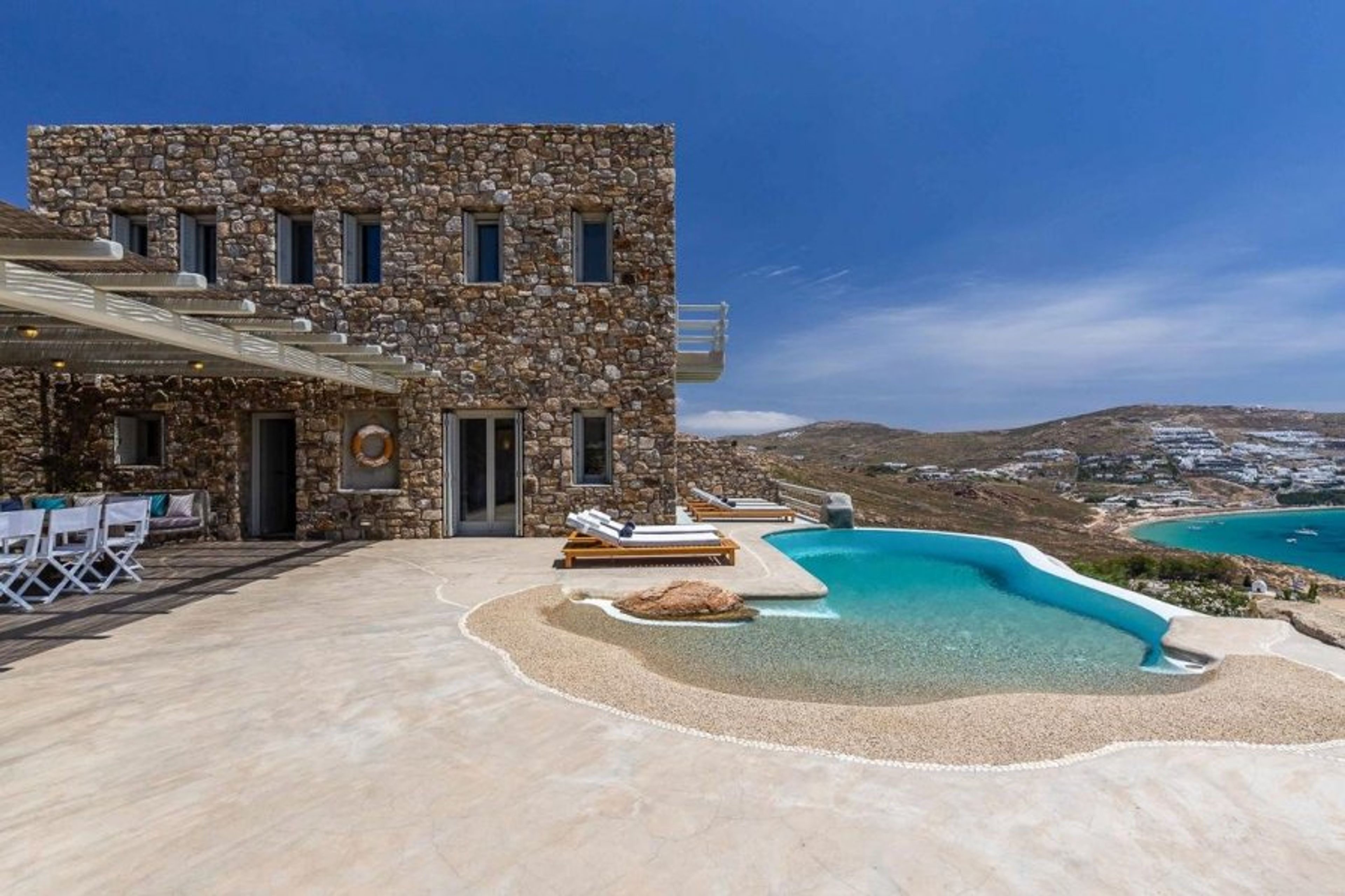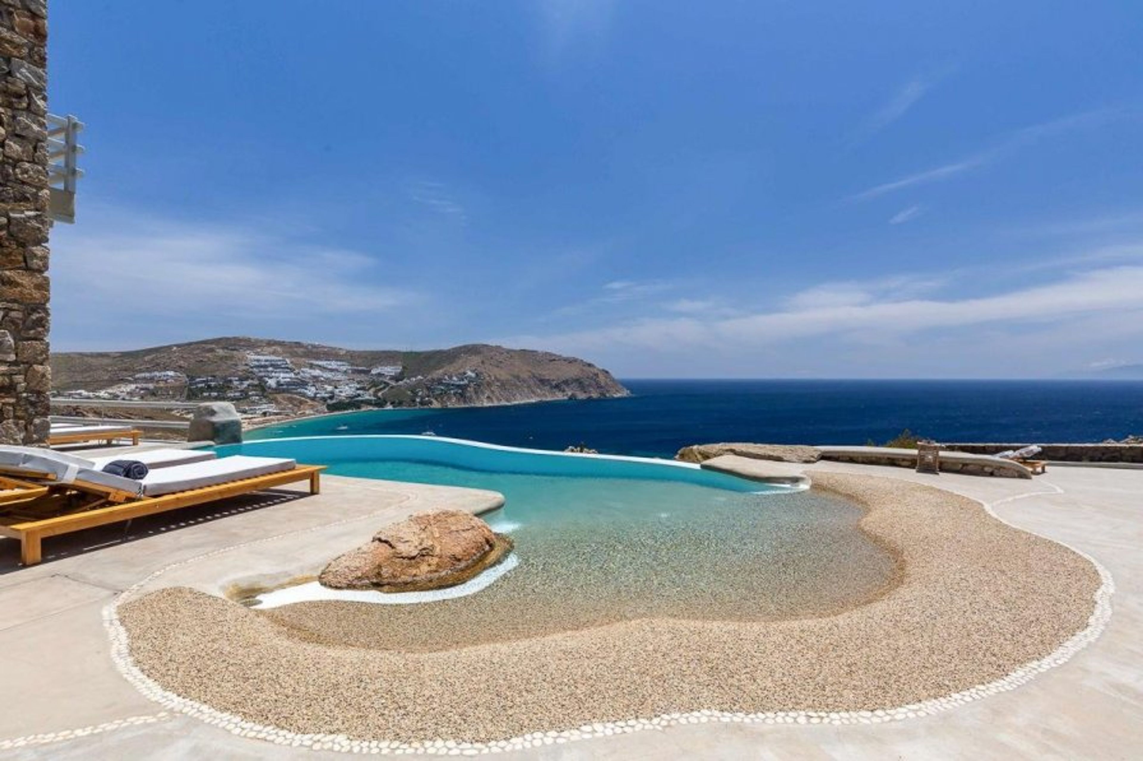 The property was built in a vast, totally private plot overlooking the stunning azure waters of Mykonos towards the nearby islands of Naxos, Paros and Antiparos, a 5-minute walk down a private path to the beautiful Elia Beach. Elia is a family-friendly long stretch of silver sand offering watersports and beach dining. It is very popular. Close by are the lovely beaches of Kalo Livadi, Kalafatis and Agrari.
