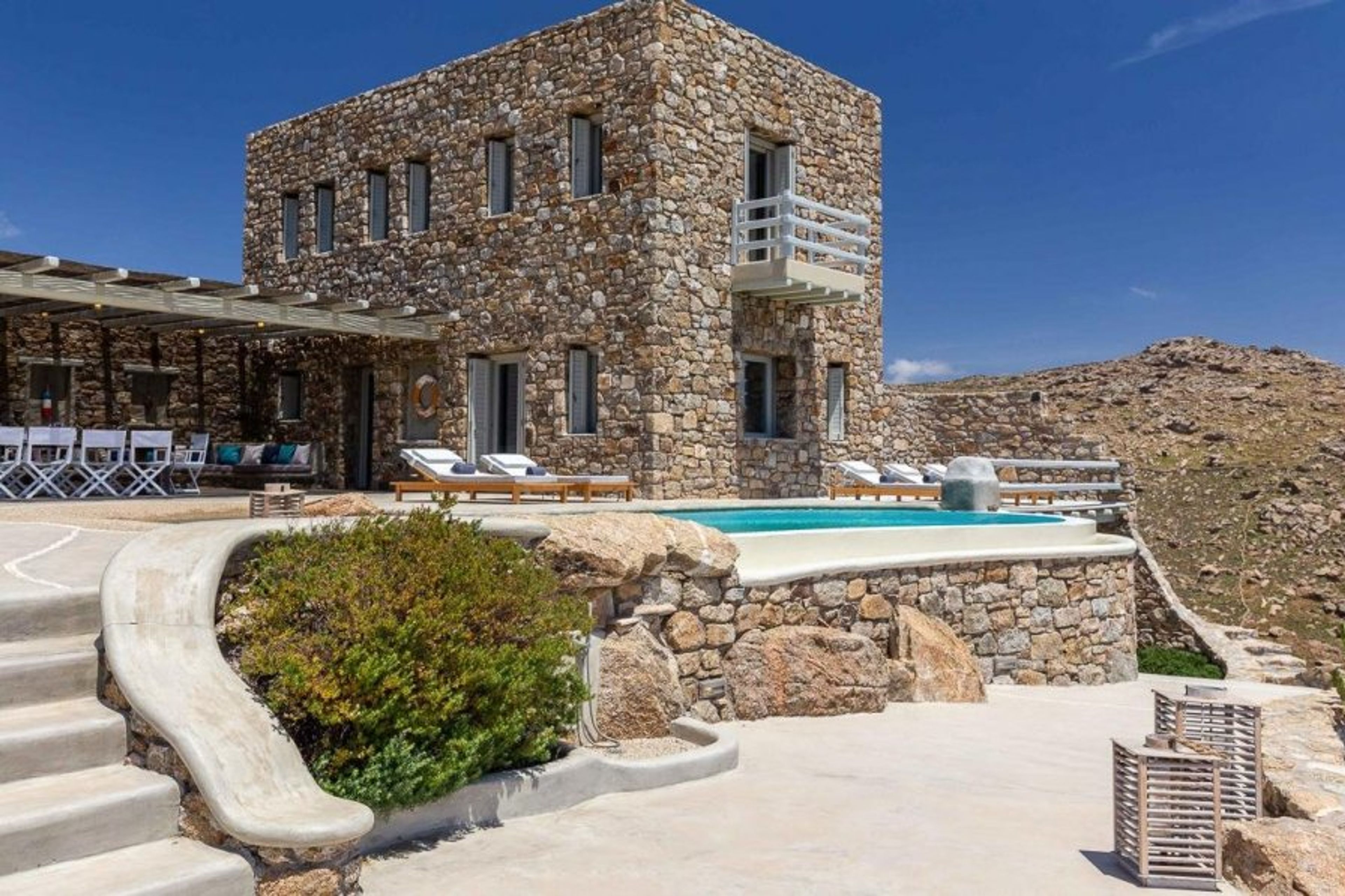 It was constructed in 2011 using lovely honey-colored stone, and its distinctive design makes the most of its stunning, private setting overlooking the lovely Elia Beach. The beach is reached by a private route.