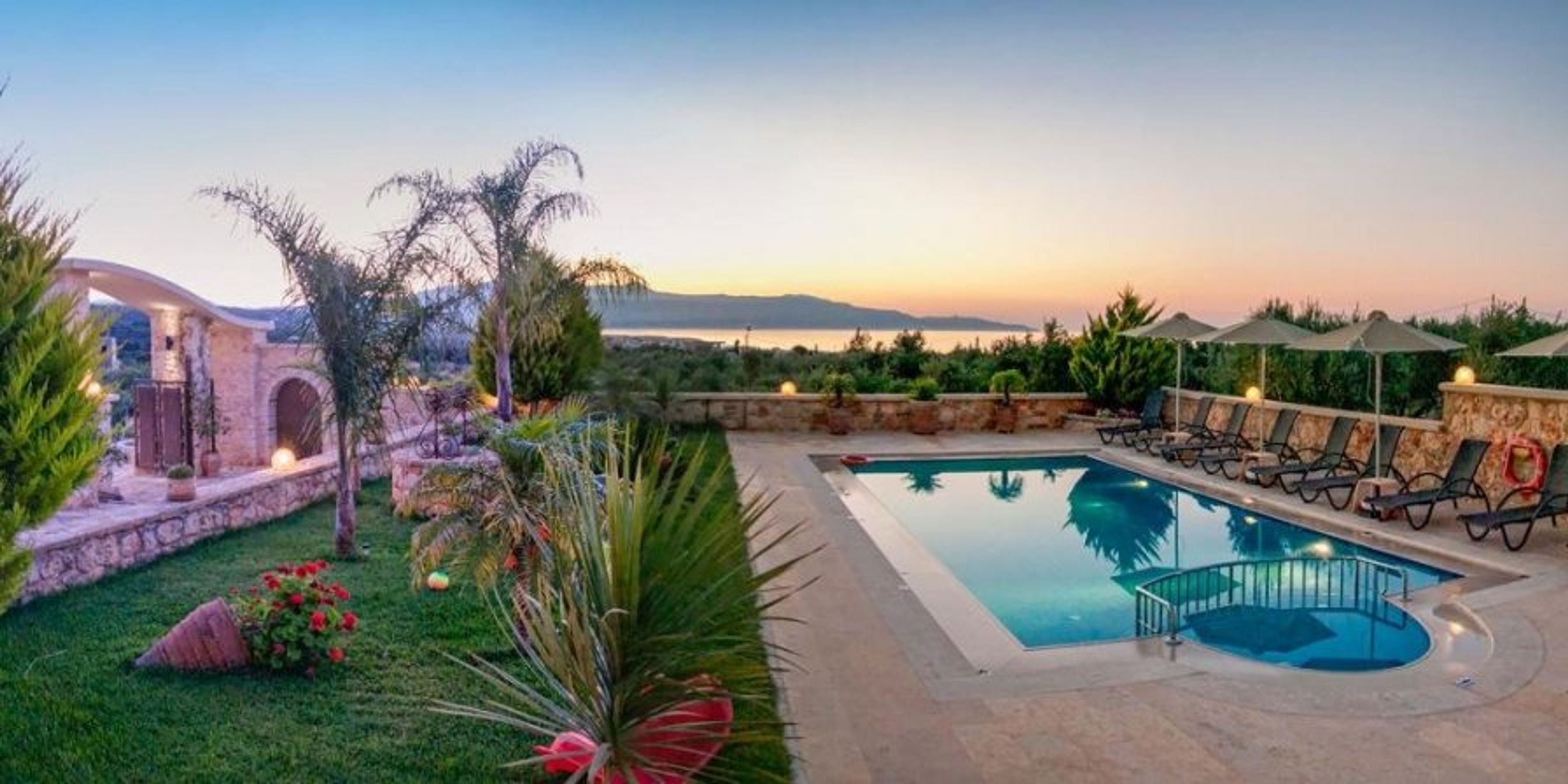 Located on a gentle hillside above the charming beach village of Kontomari, this spectacular and opulently decorated home offers almost infinite views across the Cretan Sea to the Kissamos Peninsula and beyond. It is proudly offered by Cosmic Villas. Here, the sunsets are breathtaking.