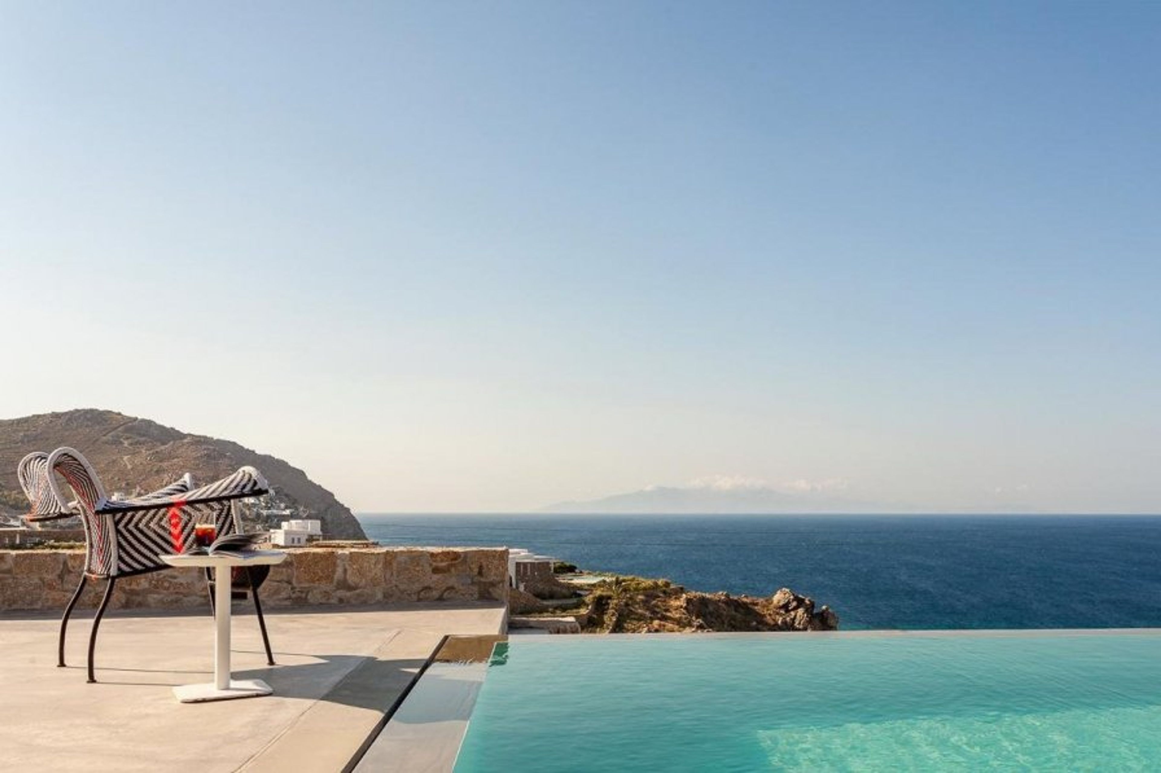 The terrace, pool, and sea are all visible from the open-concept living and dining area. It is a beautiful, sophisticated room with a painted beam ceiling that is typical of Mykonian design. The lighting fixtures are stunning and lovely. The kitchen is modern, spotless, and fully furnished. The bathrooms are wonderful, with the usual curves in a variety of materials, including plaster, cement, wood, and various shades of stone or grey. Some are chalk-white. Unlike Mykonos, one of them is even green!