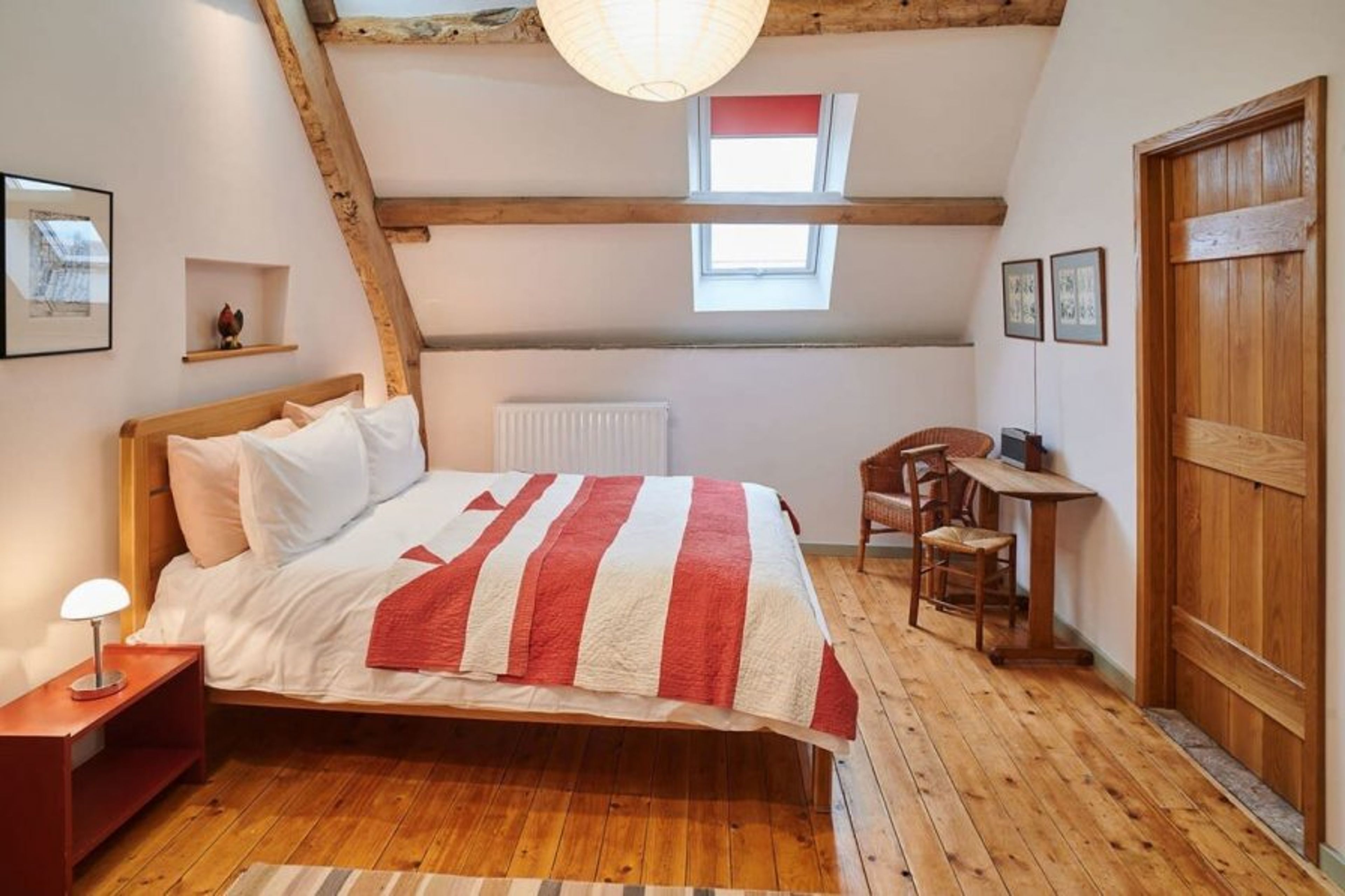 Featuring three single beds, the final bedroom at Penrheol Farmhouse is ideal for children, teenagers or groups of friends. With a neutral colour scheme and sloped ceilings, the room feels light whilst maintaining its original design.