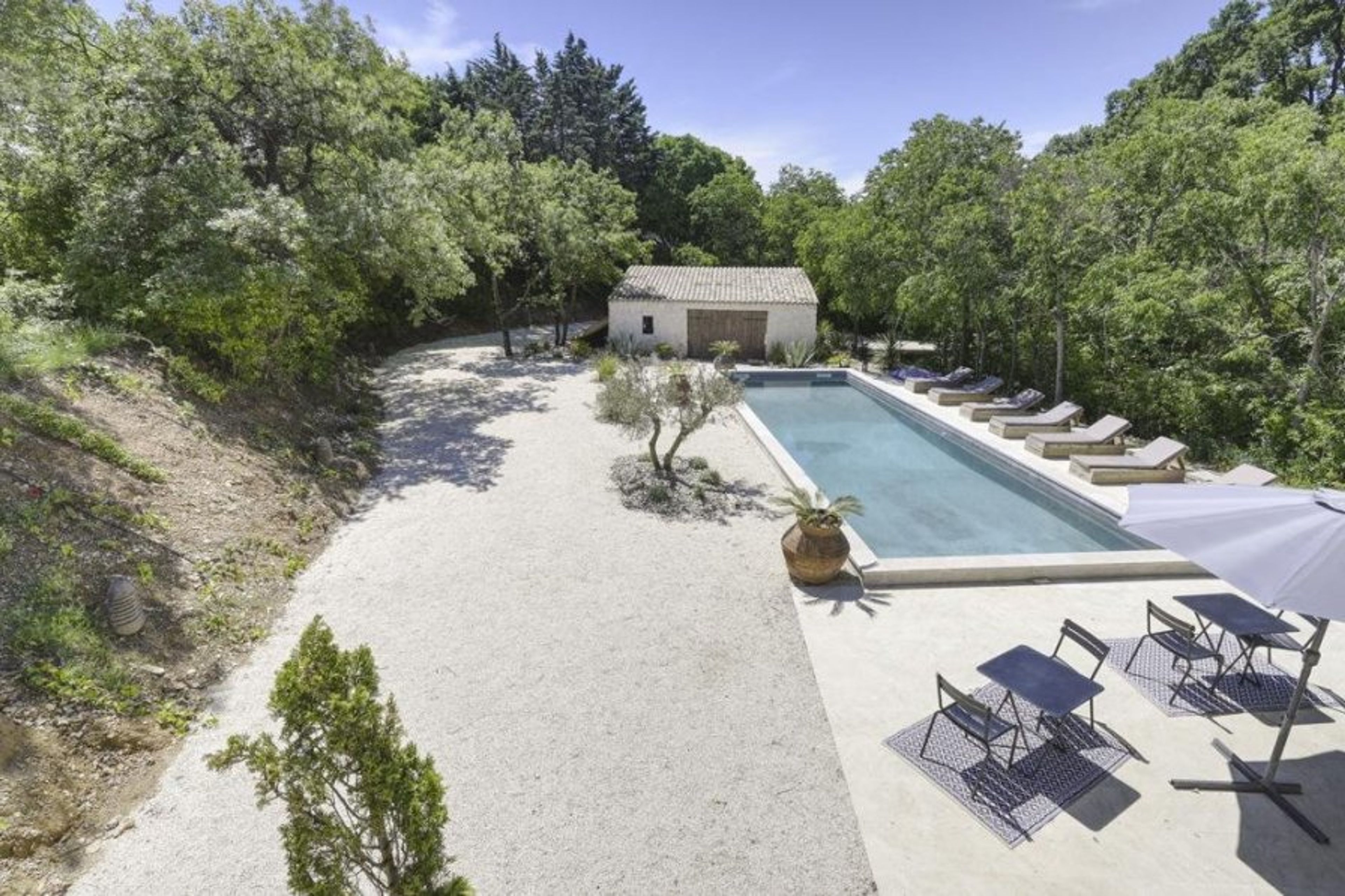 The upper garden provides space for alfresco lounging before stepping down to the pool, where you can relax in the water while listening to the birdsong in the trees.