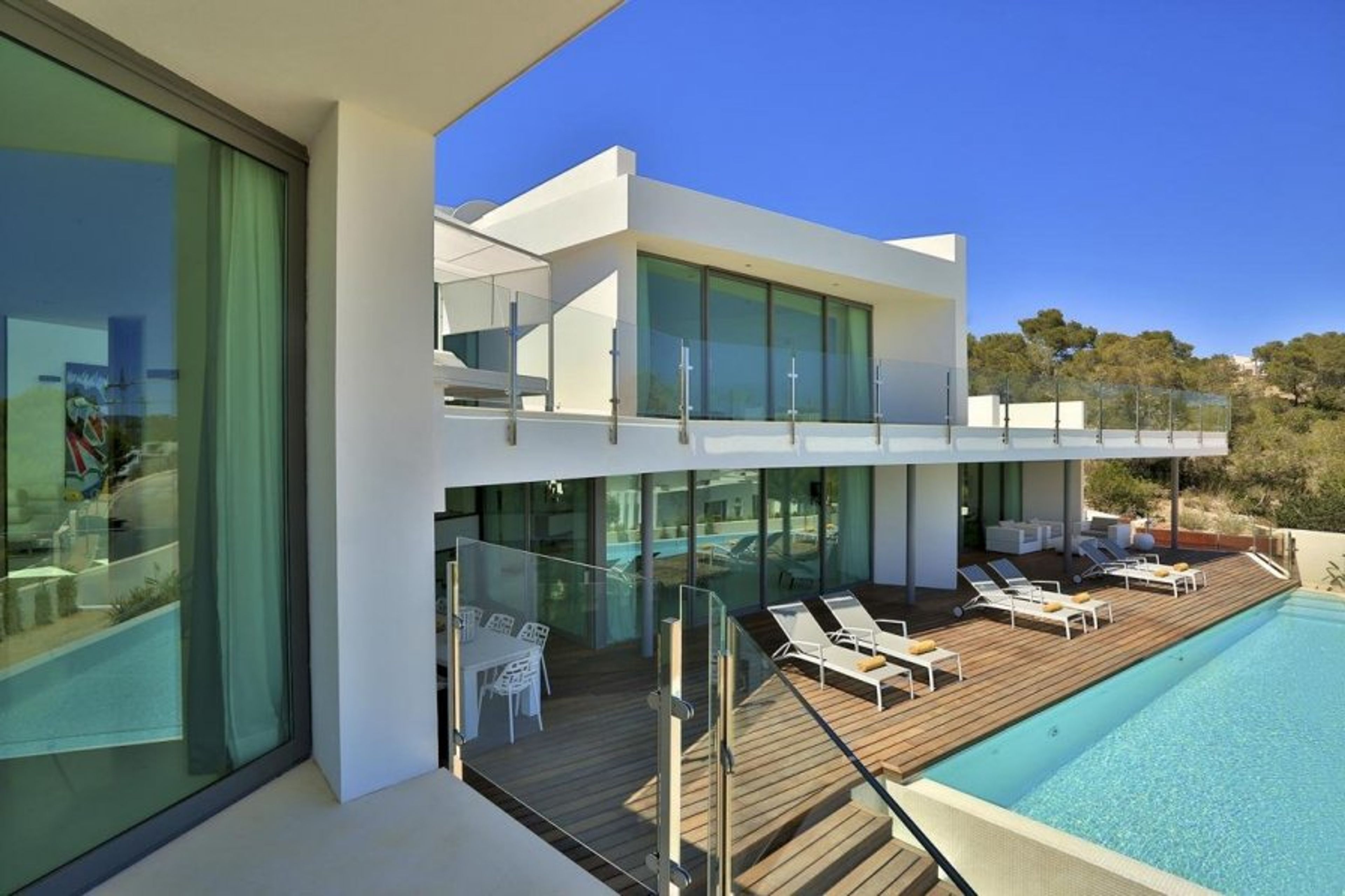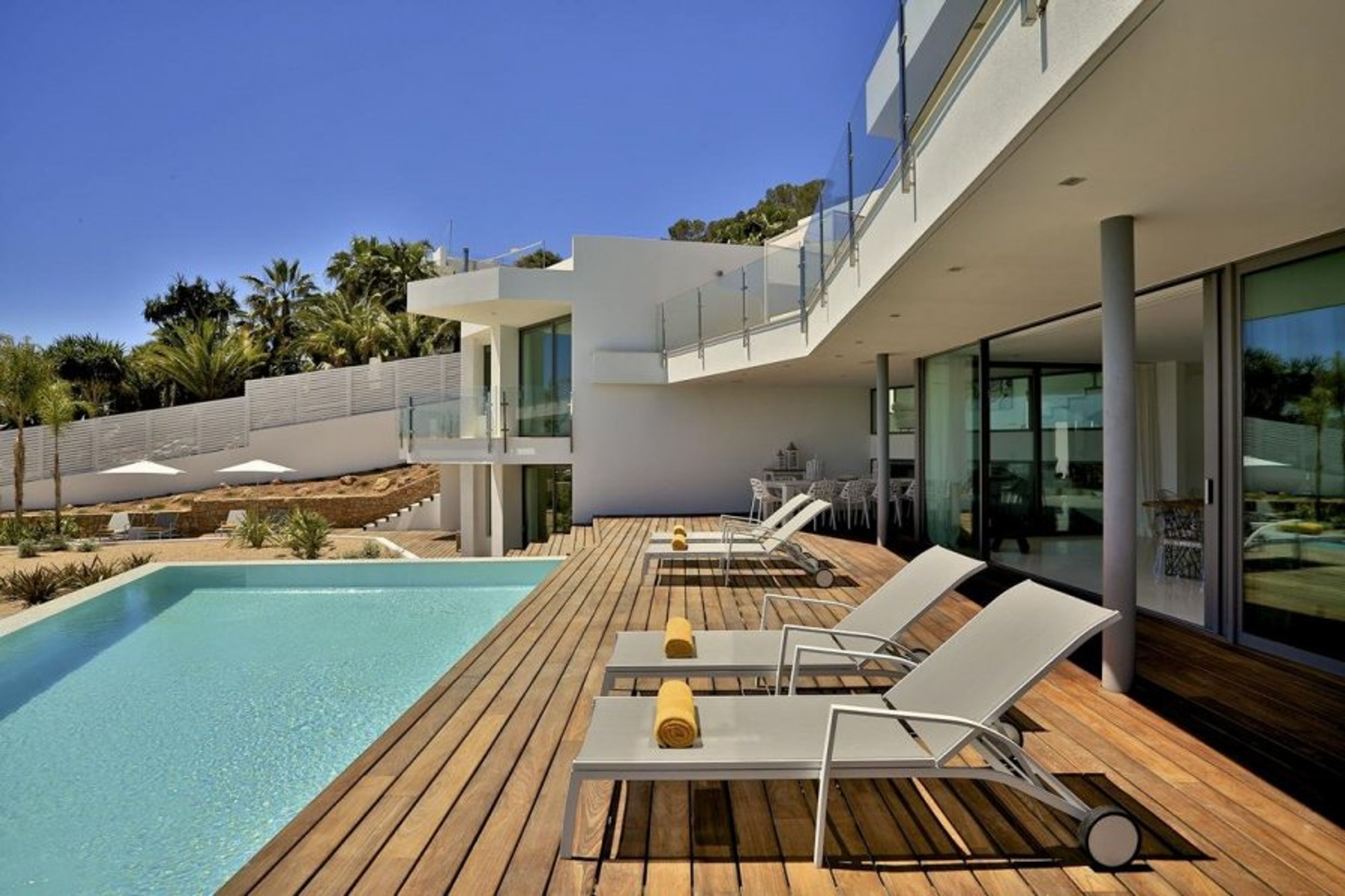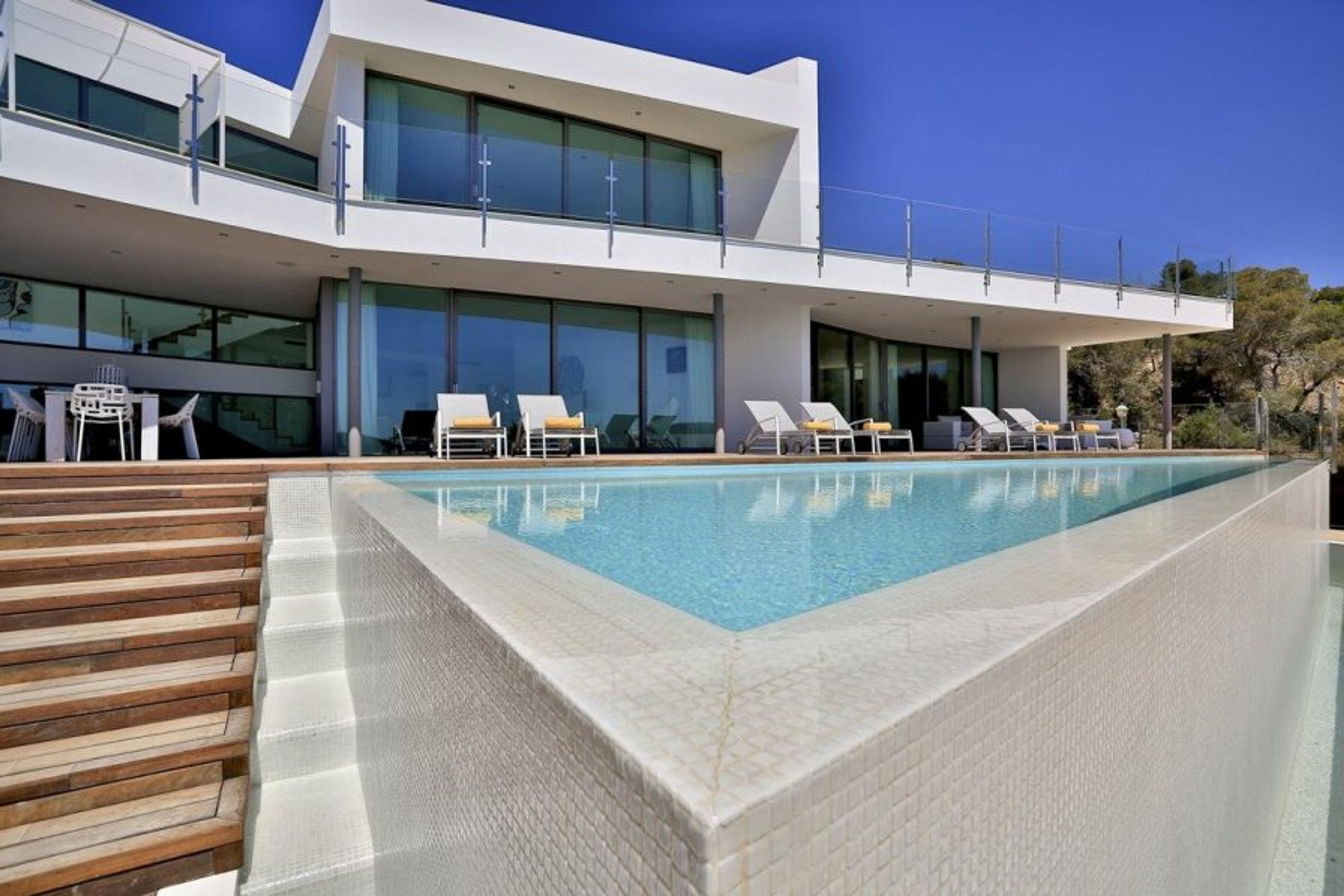 A breathtaking panoramic view of the glittering blue Es Torrent Bay may be seen from the south-facing pool and grounds. - It has five bedrooms, five bathrooms, and accommodation for up to ten people.