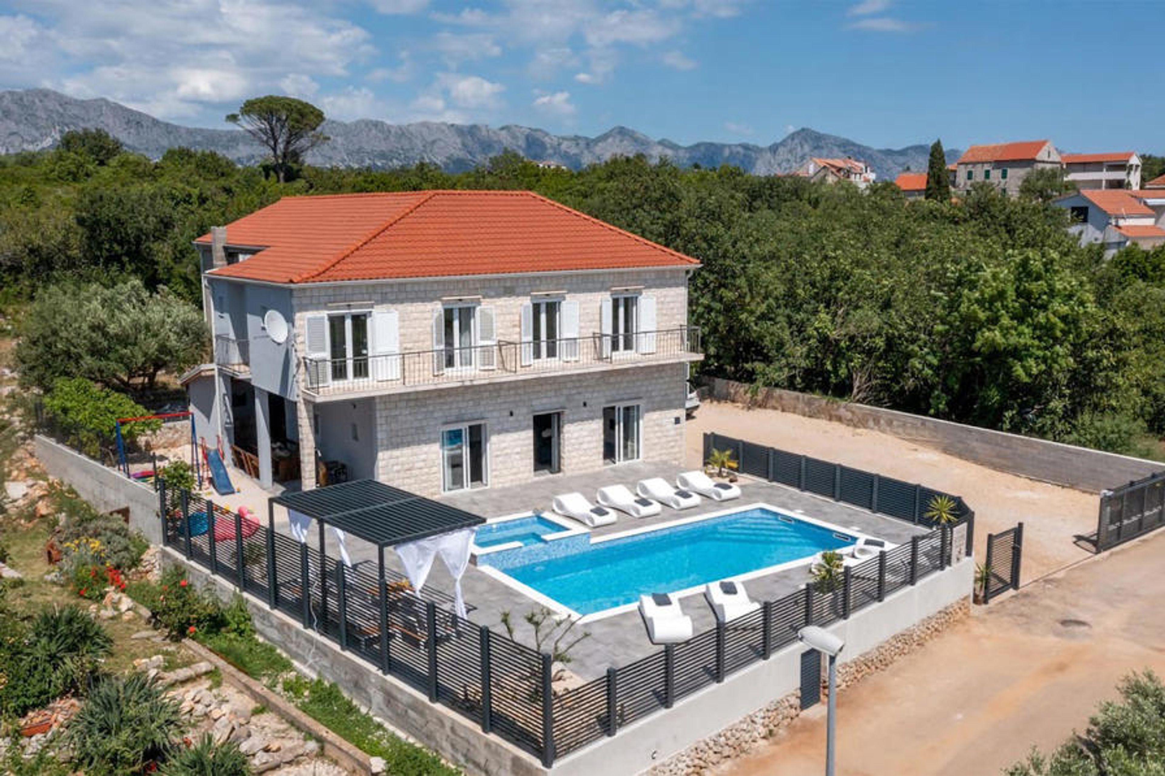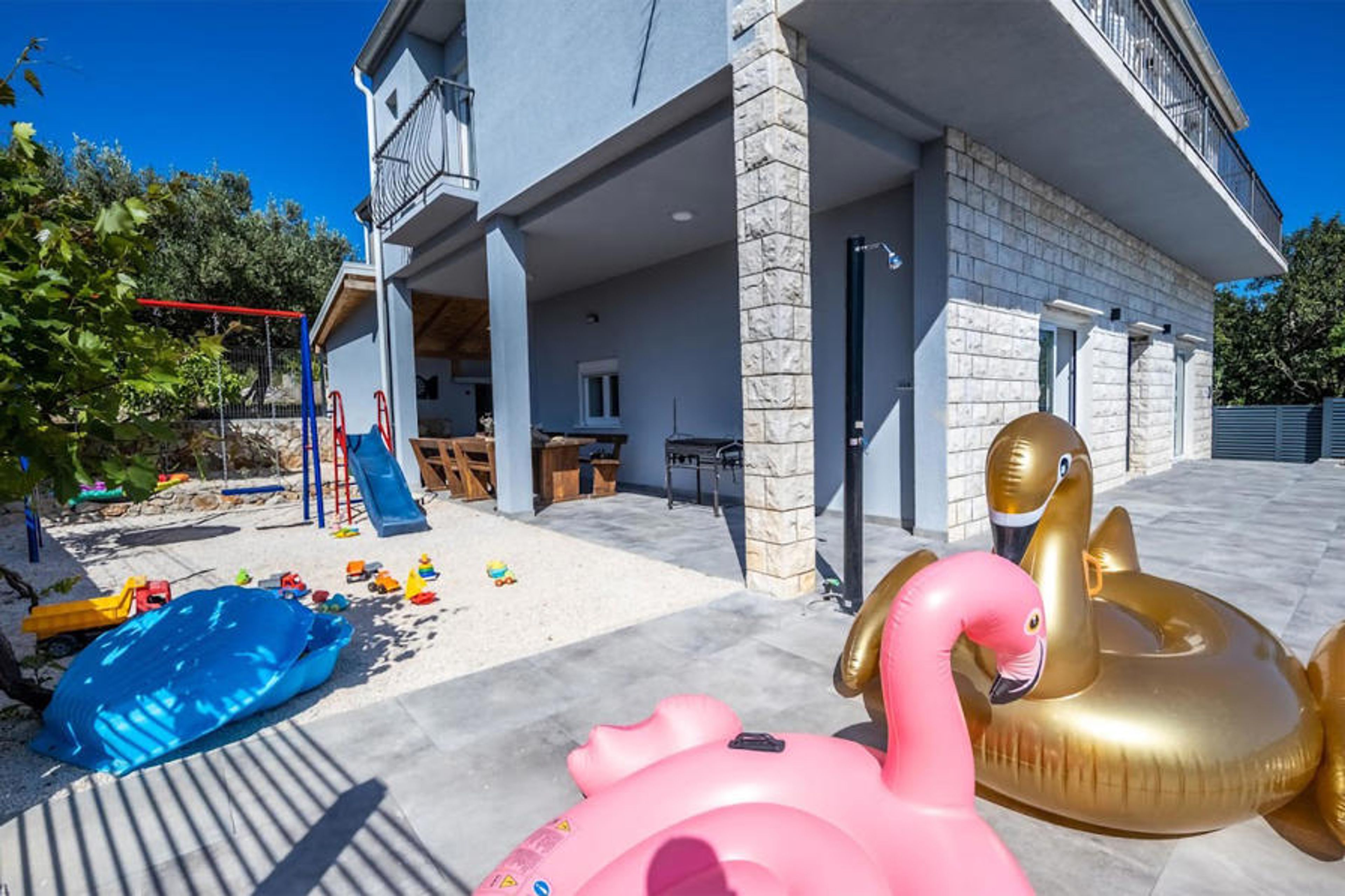 The attractive outdoor area of the house invites you to spend a lot of time outdoors. Here you can make yourself comfortable with a book in a deck chair and enjoy occasional refreshments in the pool, while your children contentedly slide and swing. Later, gather the whole family for barbecue treats and enjoy the balmy summer evening.