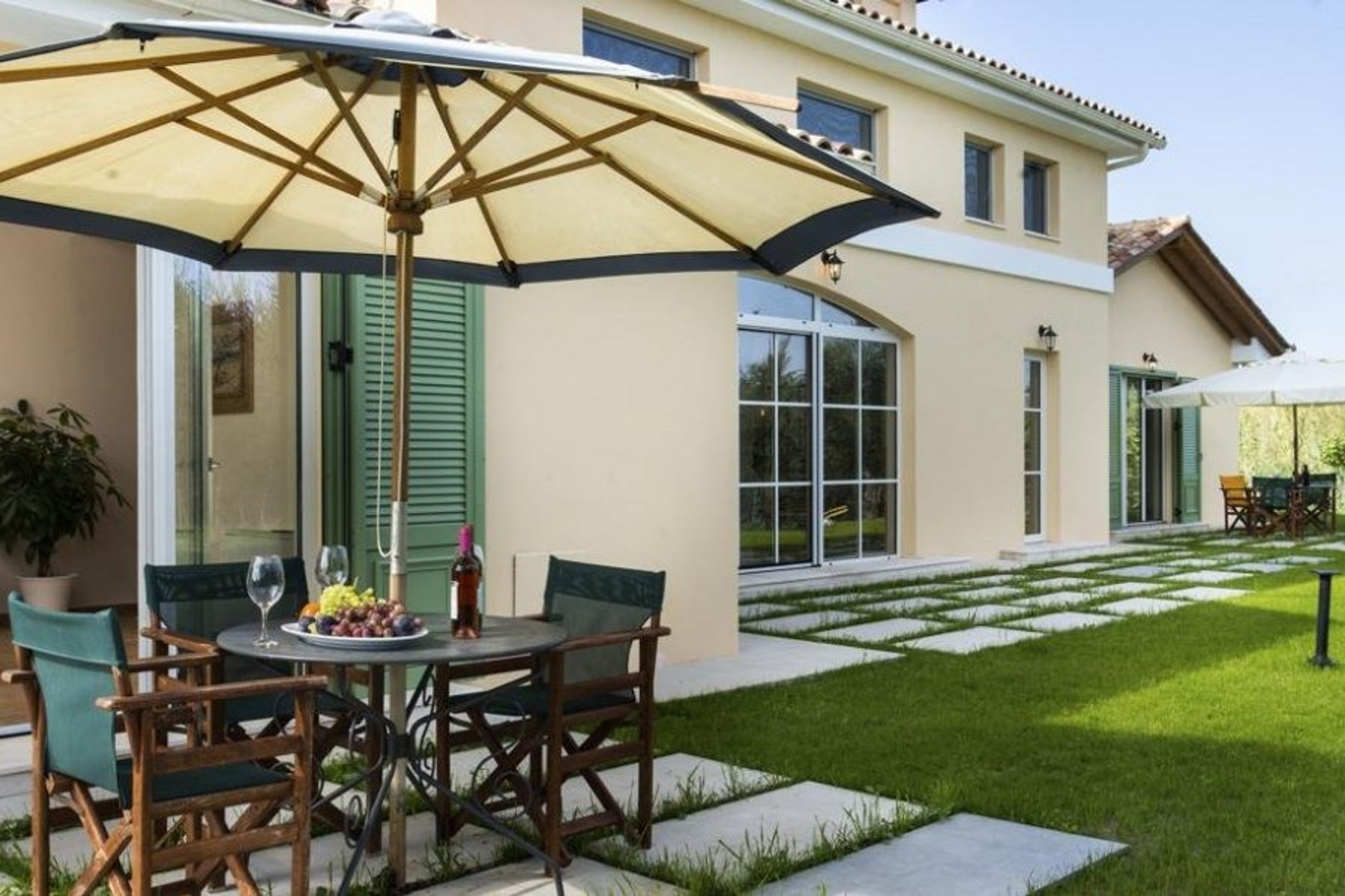 This freshly constructed, opulent rural estate is ideal for gatherings with plenty of family and friends, especially for special occasions. It is located on a very picturesque, sizable estate that is covered in lawns, flowers, fruit trees, olive groves, and vineyards. With its contemporary design, enormous glass doors and windows, open-concept living space, exquisitely tiled ensuite bathrooms, and fantastic patio, this enchanted location in the heart of Zakynthos allows visitors to unwind and enjoy it very fast. It has a fantastic pool with hydromassage, a separate little pool for kids, bicycles you can borrow, and shared use of a tennis court with night lighting. This large seven bedroom home is a great option for people seeking solitude, seclusion, and calm.