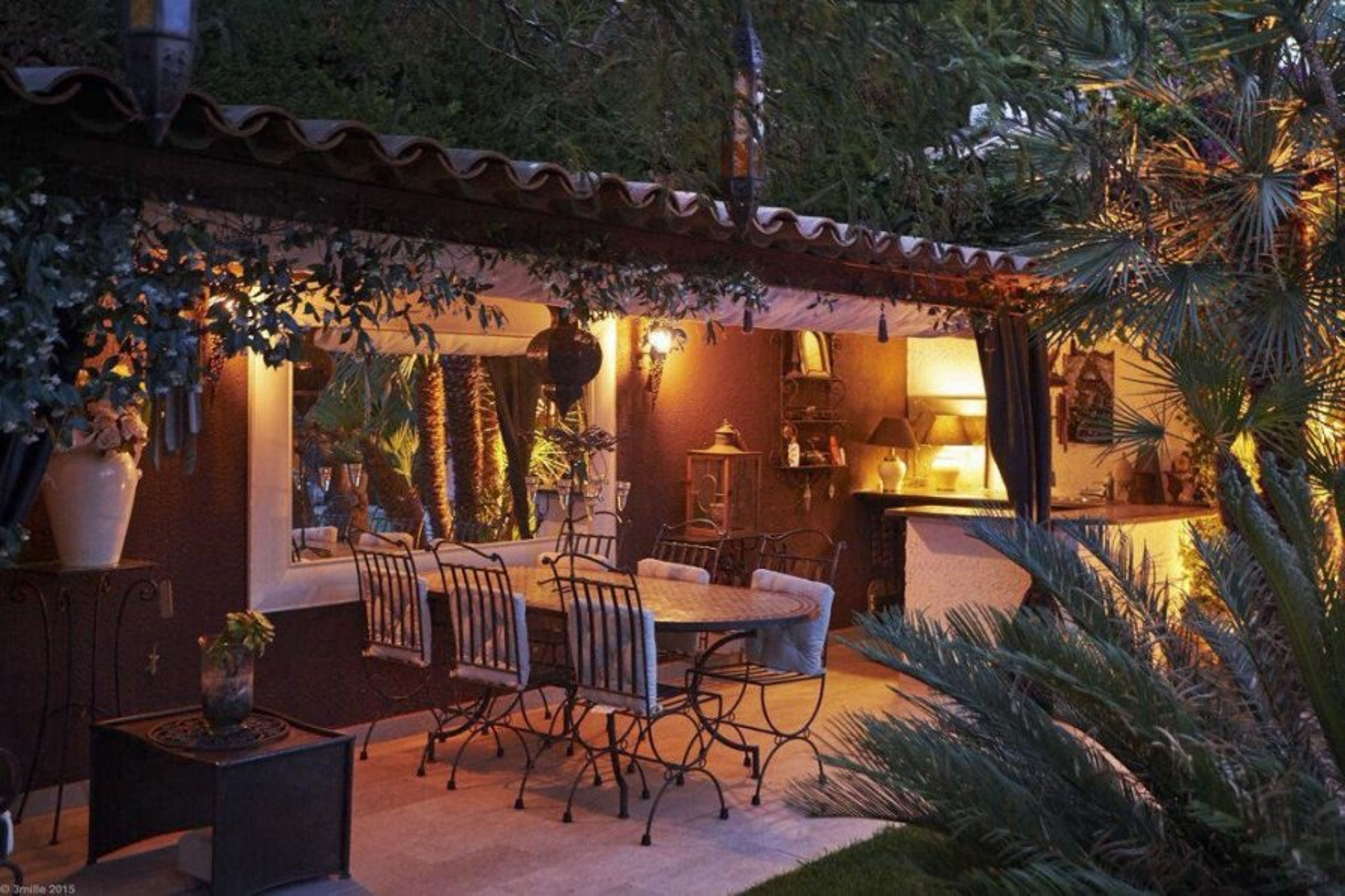 - South-facing terrace with fountain and fireplace