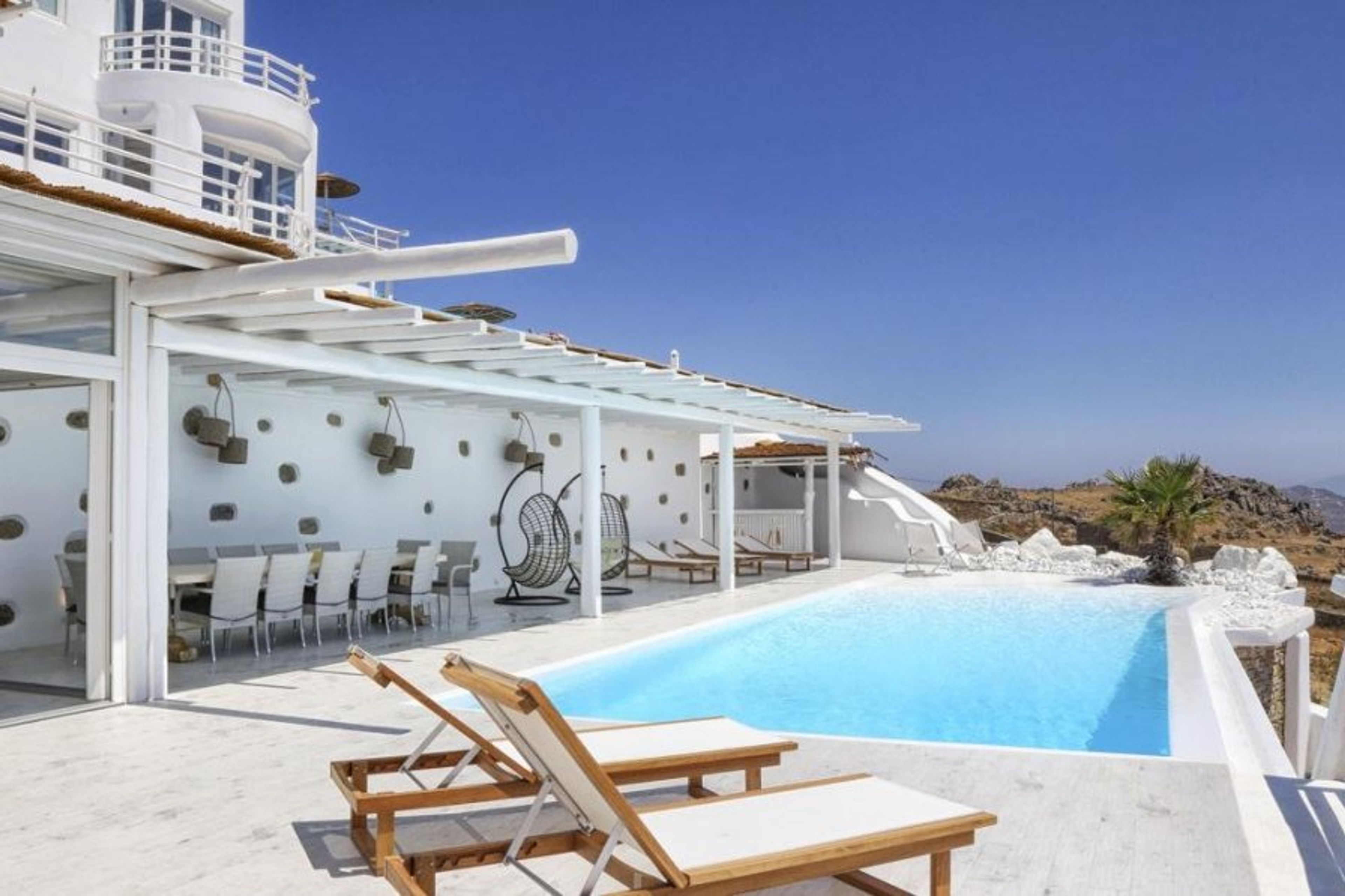 This is a luxury property, located 8.3 km from Mykonos town and a 15-minute drive from the beach. All the bedrooms count with their ouwn air conditioning system, a safe box and a TV. The villa sleeps 18 guests with 9 bedrooms and 8 bathrooms