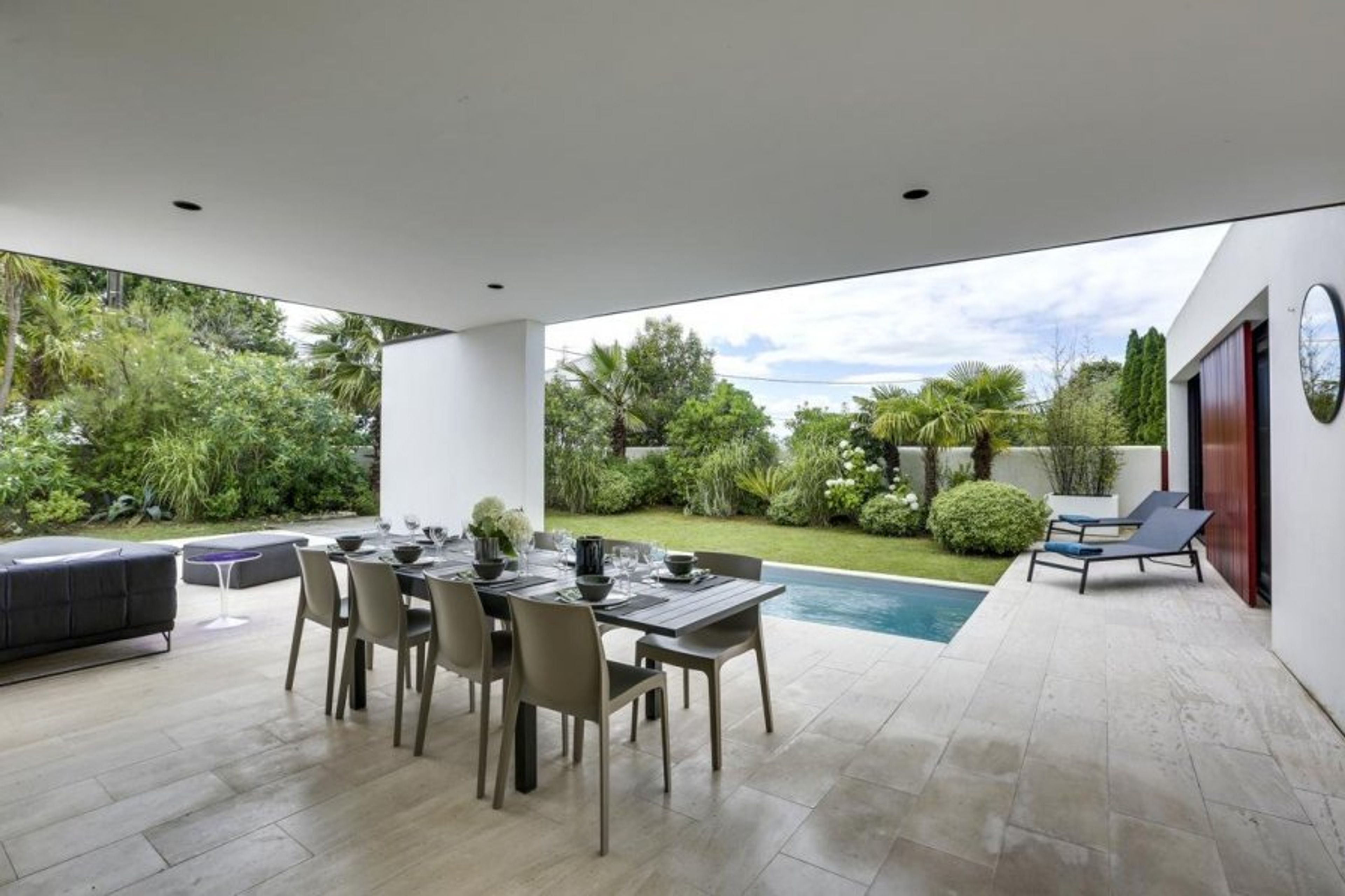 This modern home is all about stylish open-plan living, perfect for warm summer months when you can open the floor-to-ceiling sliding windows and step straight out to the covered terrace for long al-fresco lunches by the plancha and lounging by the heated swimming pool within the walled garden.