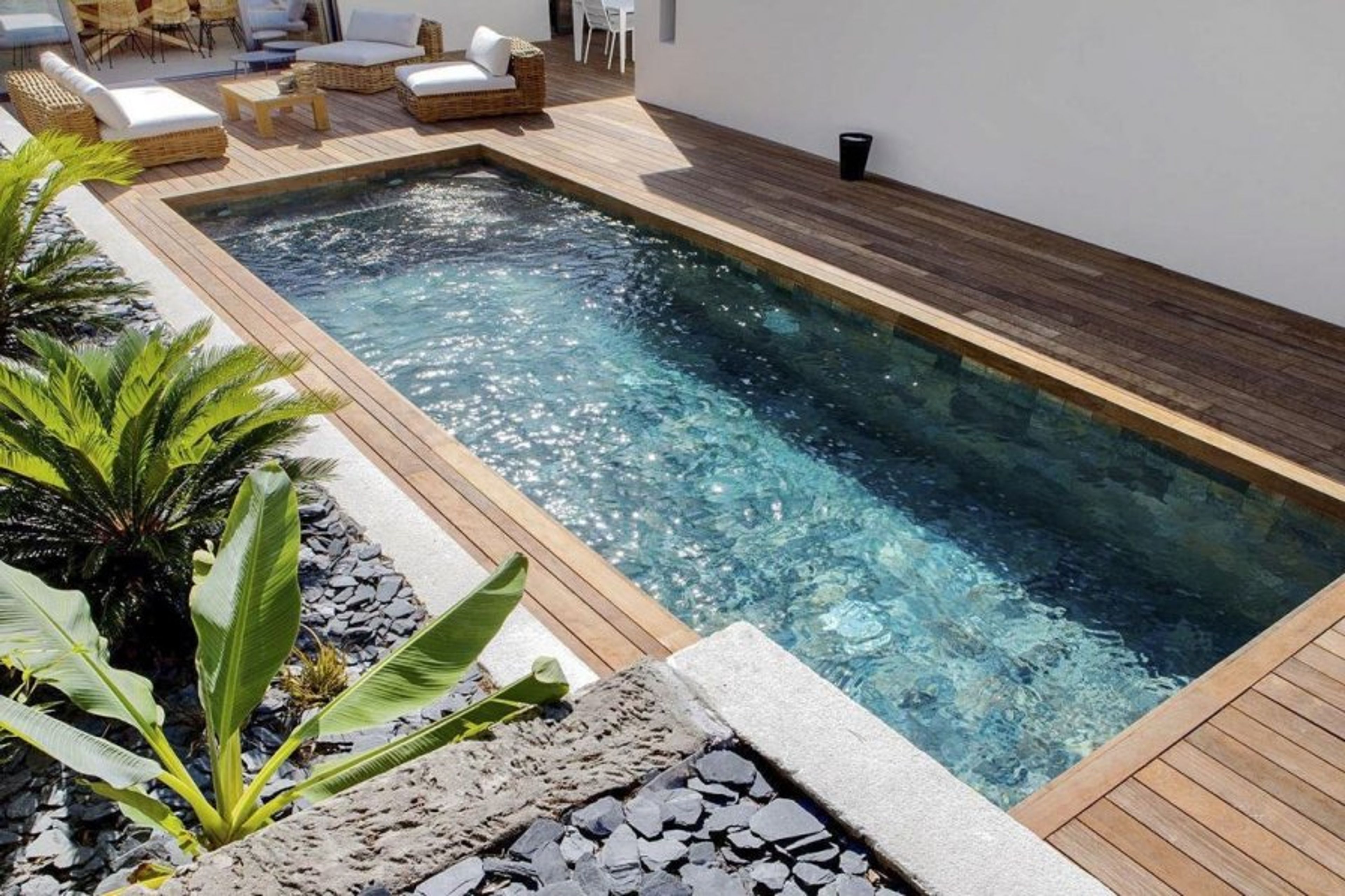 Heading outside, the landscaped garden is like a private oasis where you can spend the day taking a dip in the inviting pool or sunbathing on the stunning wrap-around decked area. There are also outdoor sofas and dining spaces, so you can spend lots of time outside enjoying the weather and the serene surroundings.