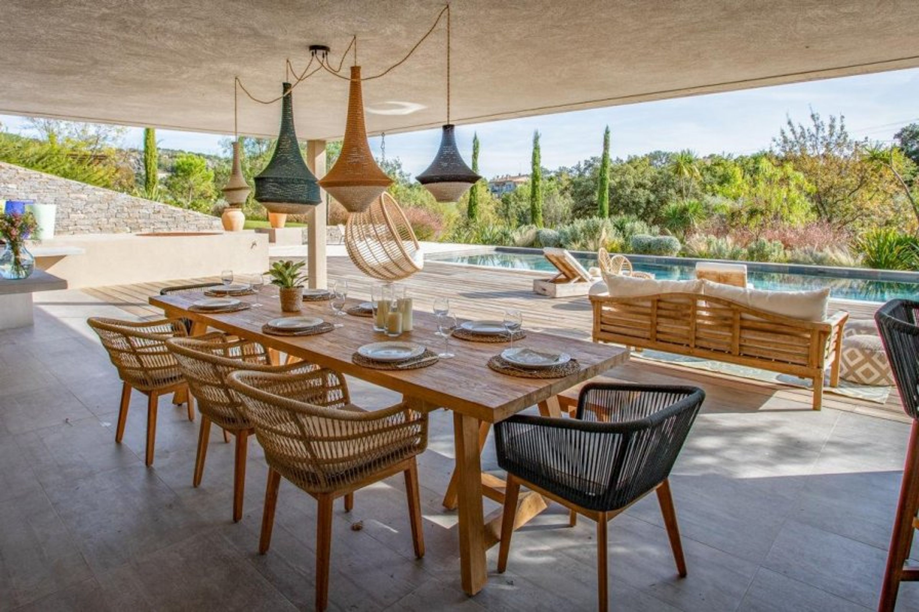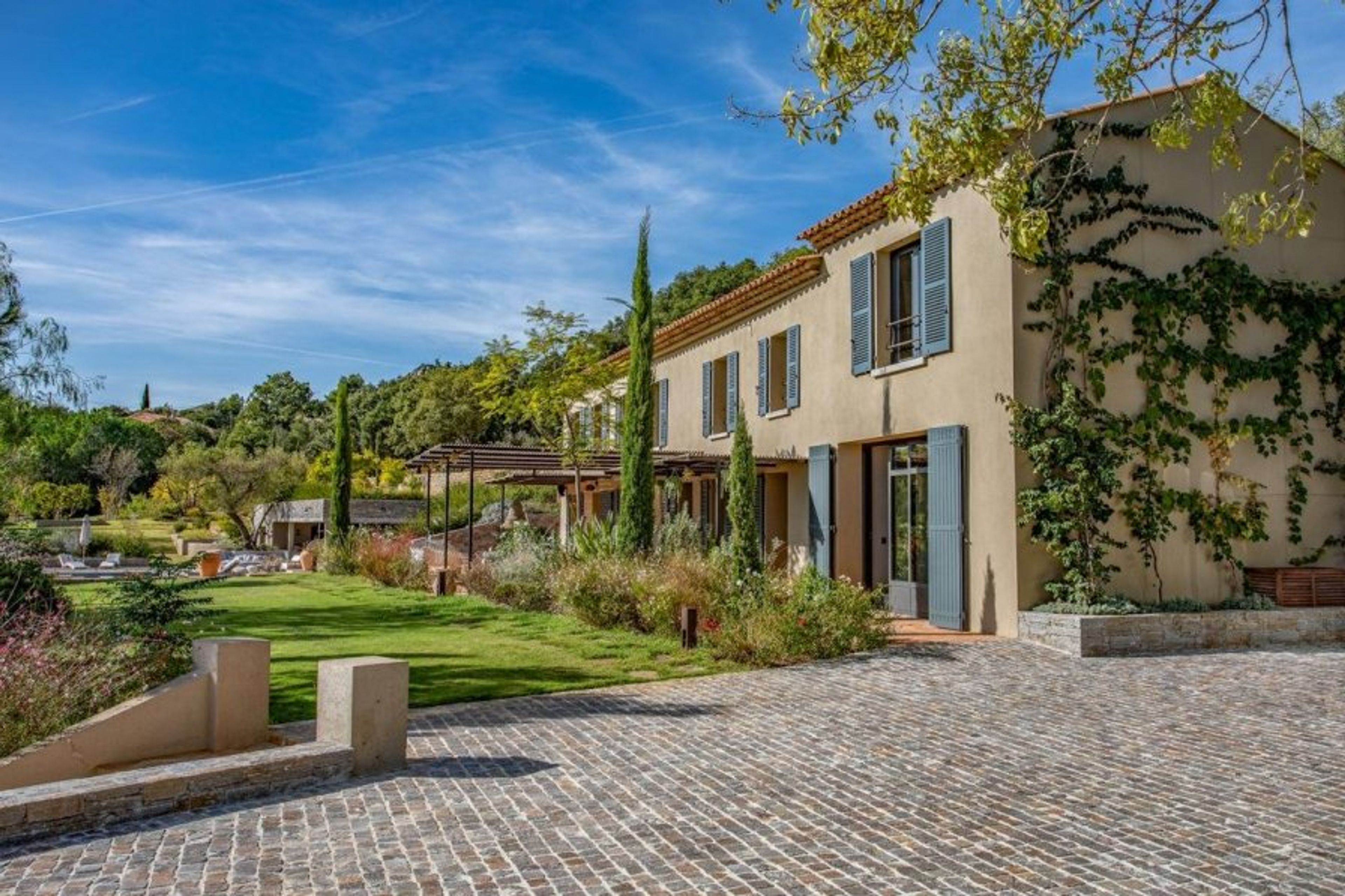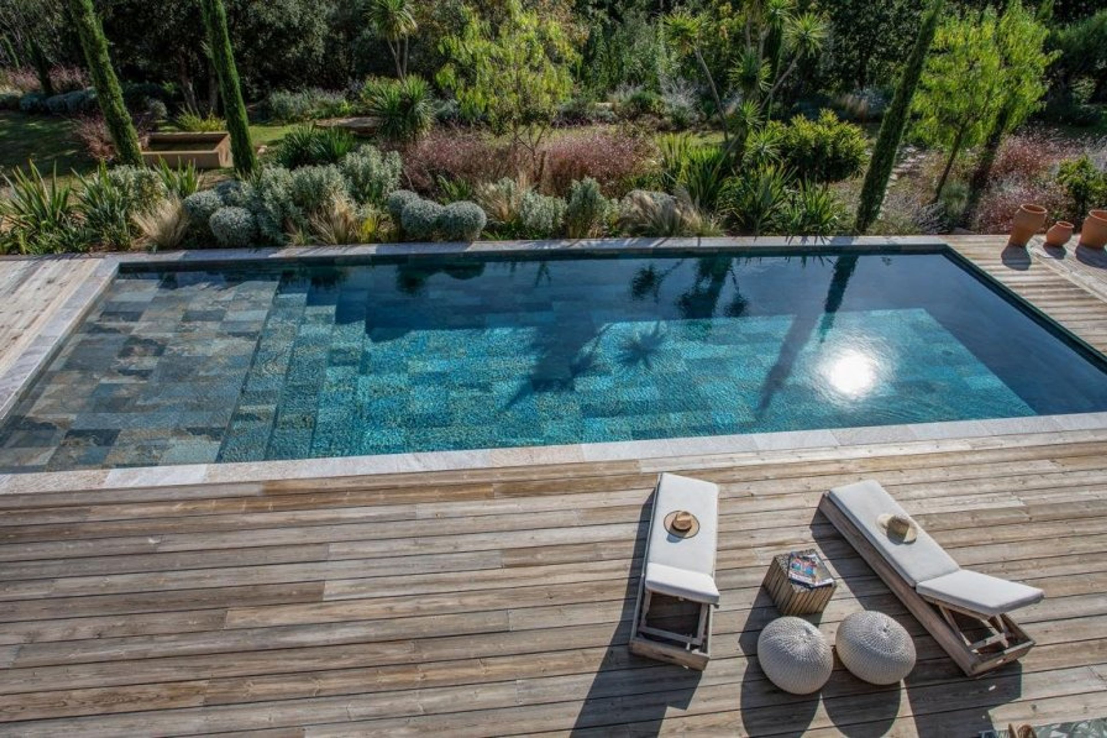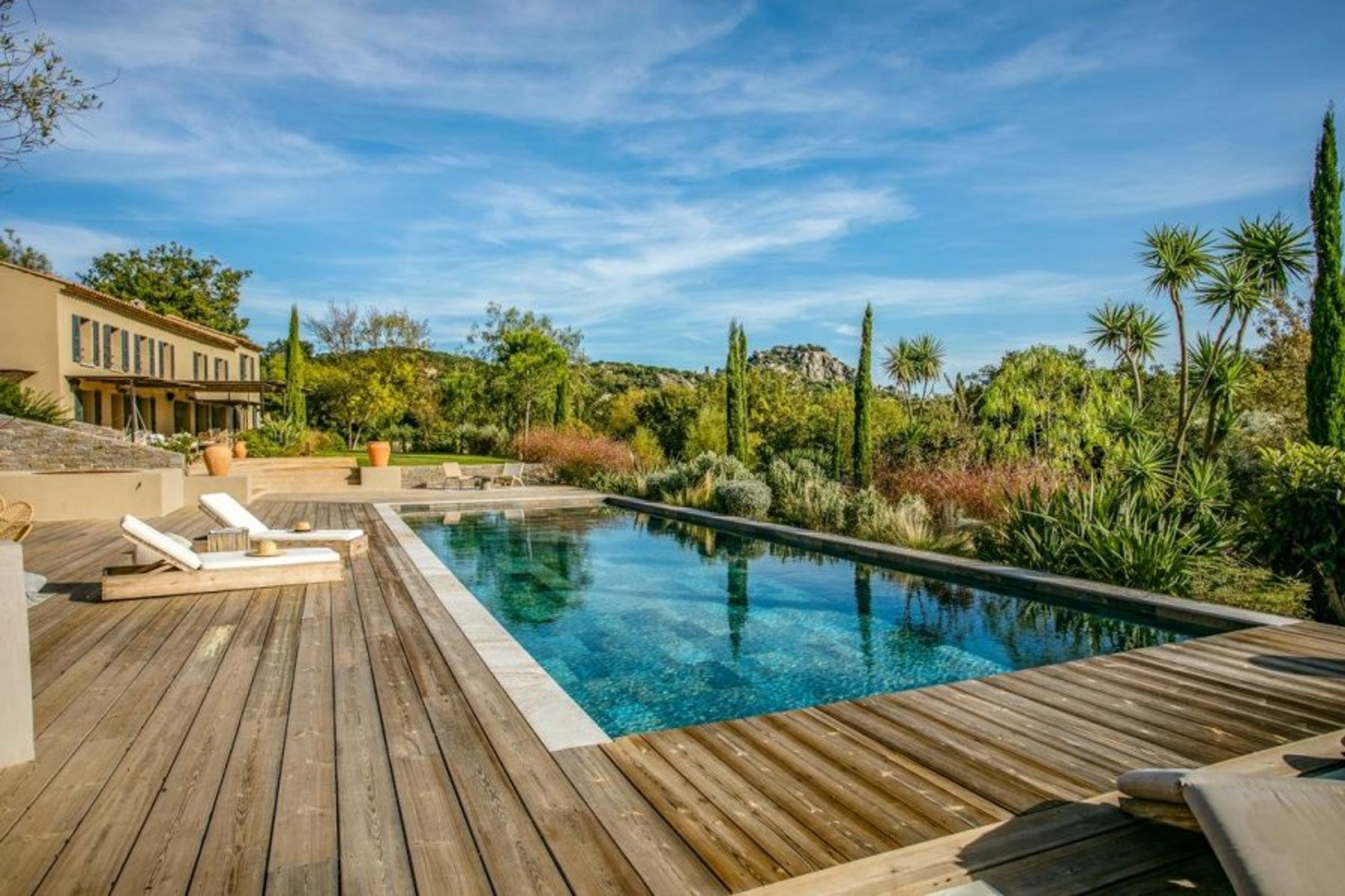 Yet most of your time will surely be spent kicking back in the chic pool house with its equipped summer kitchen, benches for convivial al-fresco dining alongside ample space to lounge on the decked poolside terrace. The Mediterranean gardens are also beautiful with terraced levels leading up to the atmospheric boules court and woodland beyond.