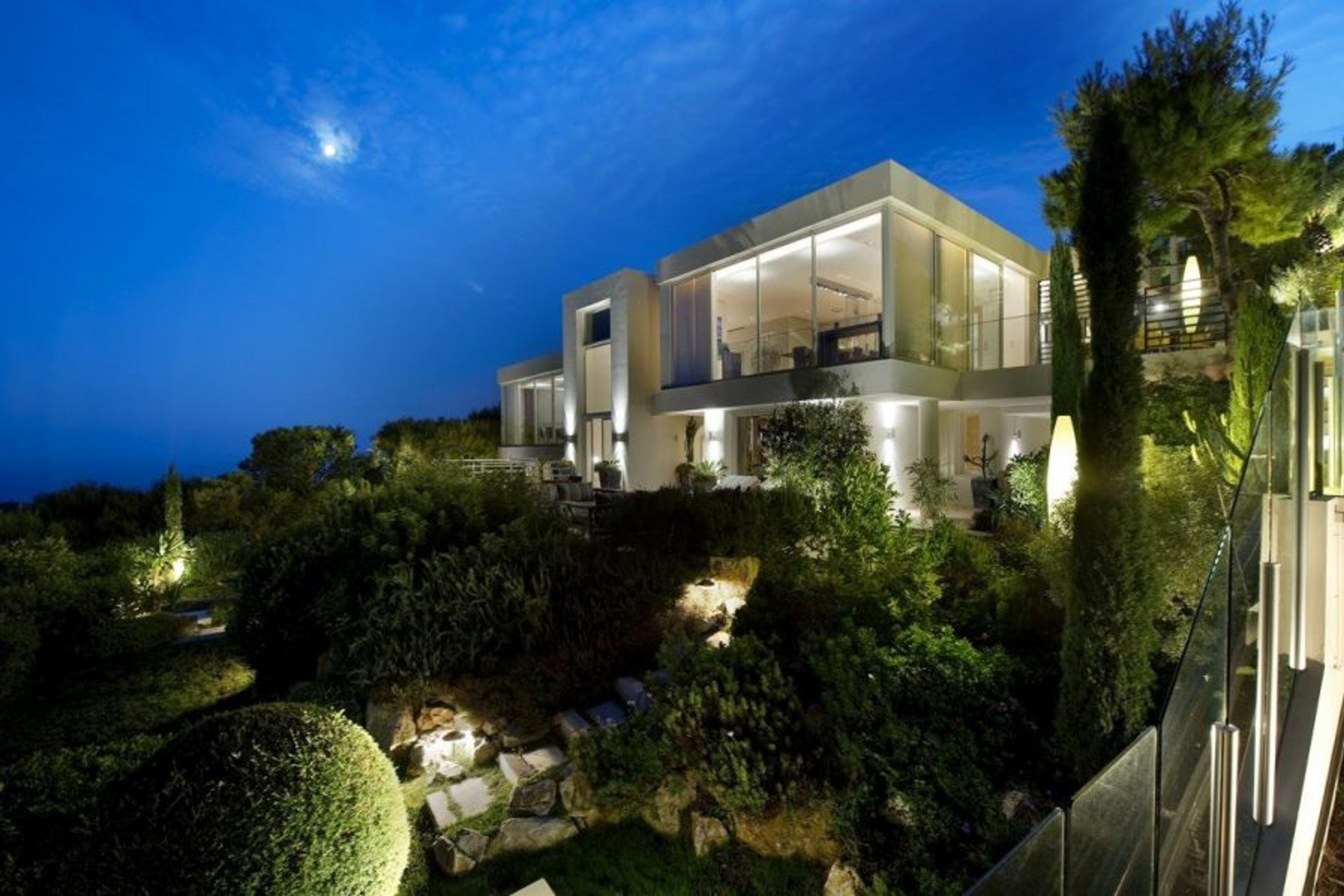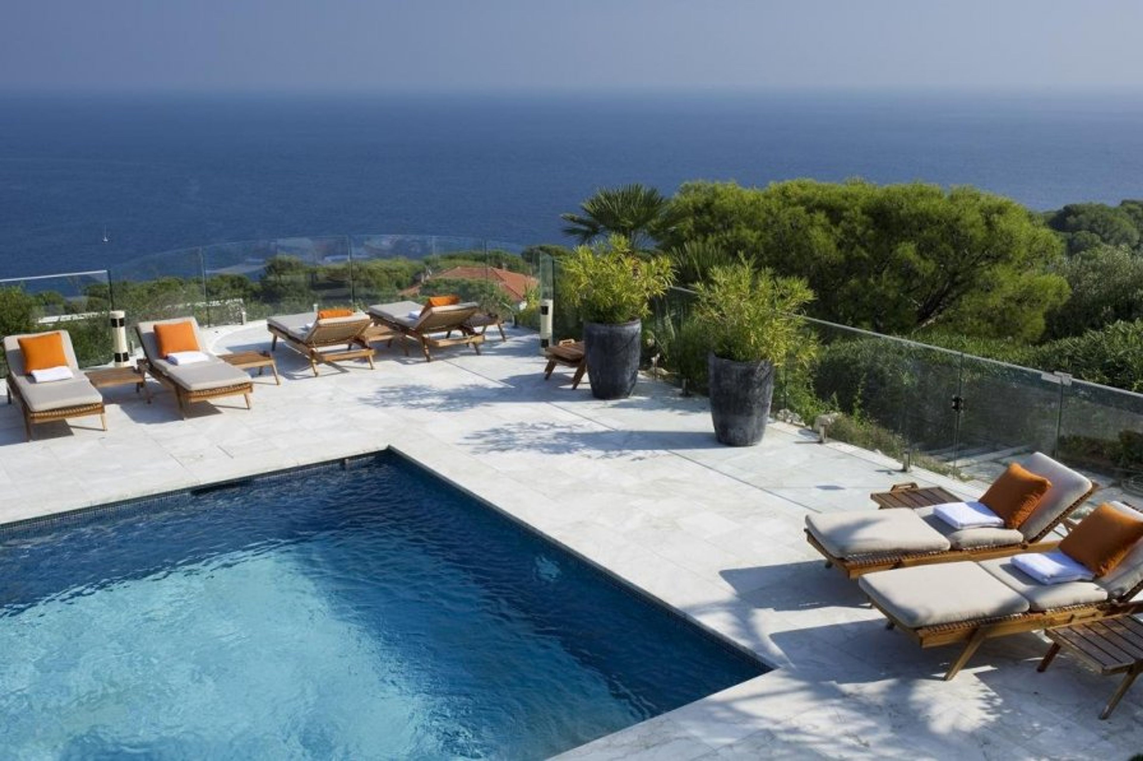 In the prestigious setting of the Cap Ferrat peninsula, between Nice and Monaco, it exudes luxury in so many ways. Start off at the very top by the glorious heated swimming pool with extraordinary vistas of the sea and ample space to relax with sun-loungers and a cooling mist system. Wander down the steps (or take the outdoor lift) to the architecturally striking villa and be amazed by the sumptuous lounge with floor to ceiling windows and the raised dining room looking straight out to sea.
