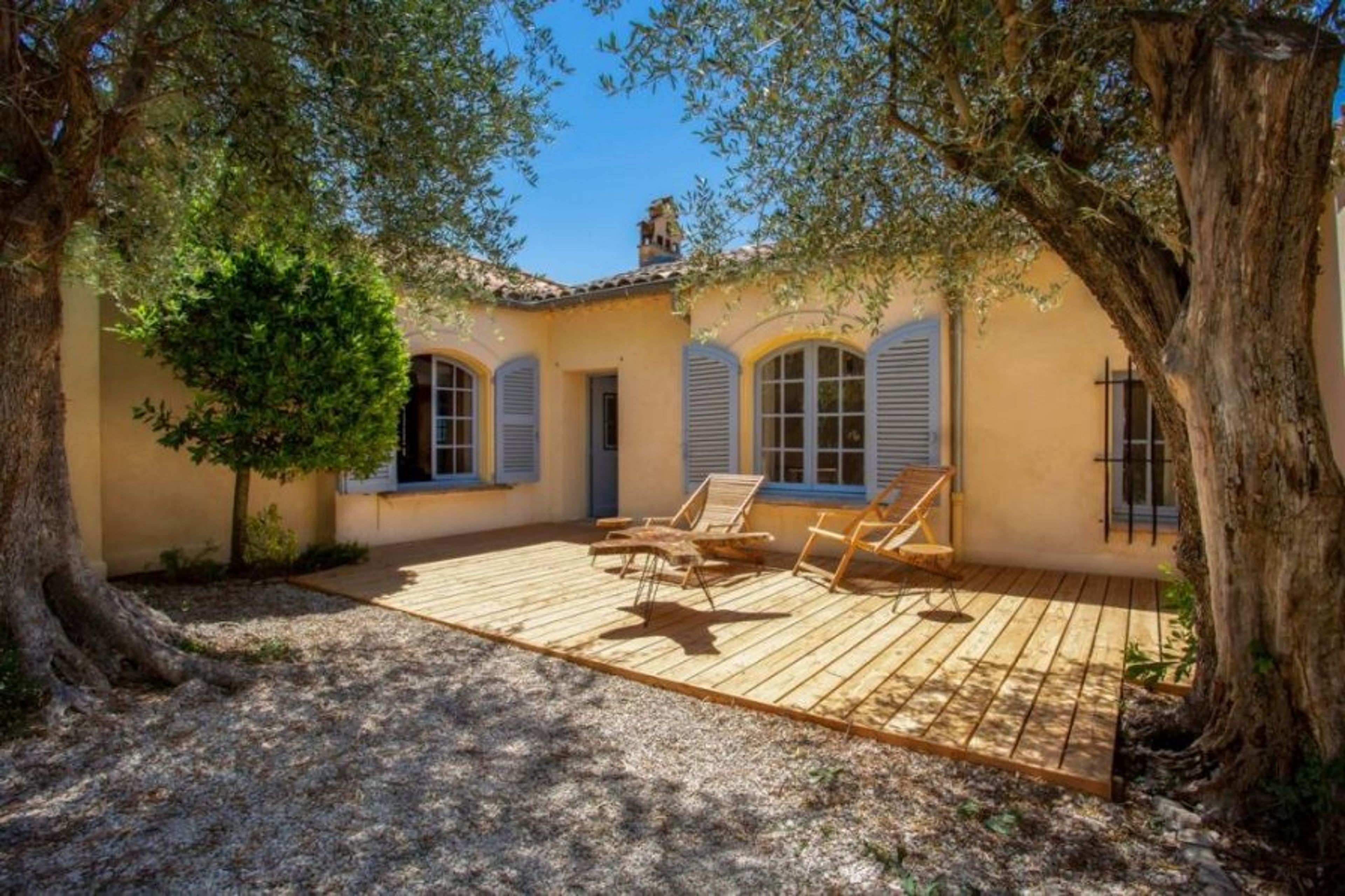 A restored stone mazet serves as a delightful bar close to the pool, set amongst the shady trees and deckchairs.