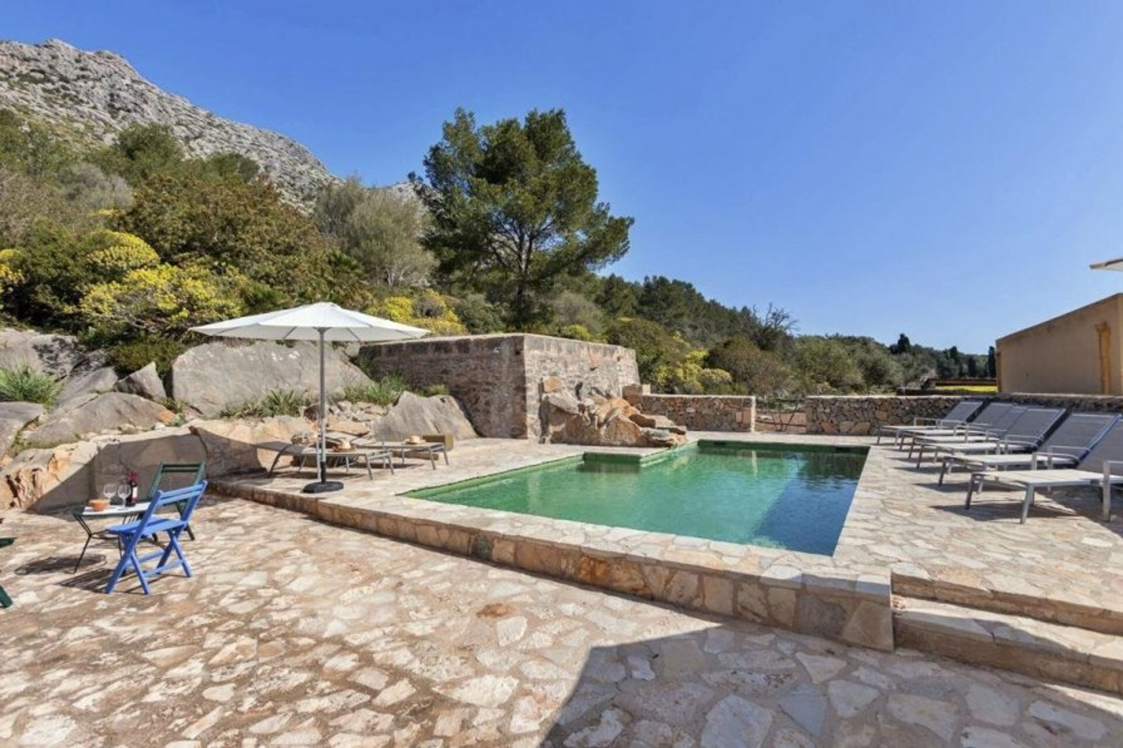 A beautiful forest, rocky stone walls, and terraces surround the villa, which is situated in the Mallorcan countryside amid the Cala Sant Vincent mountains.