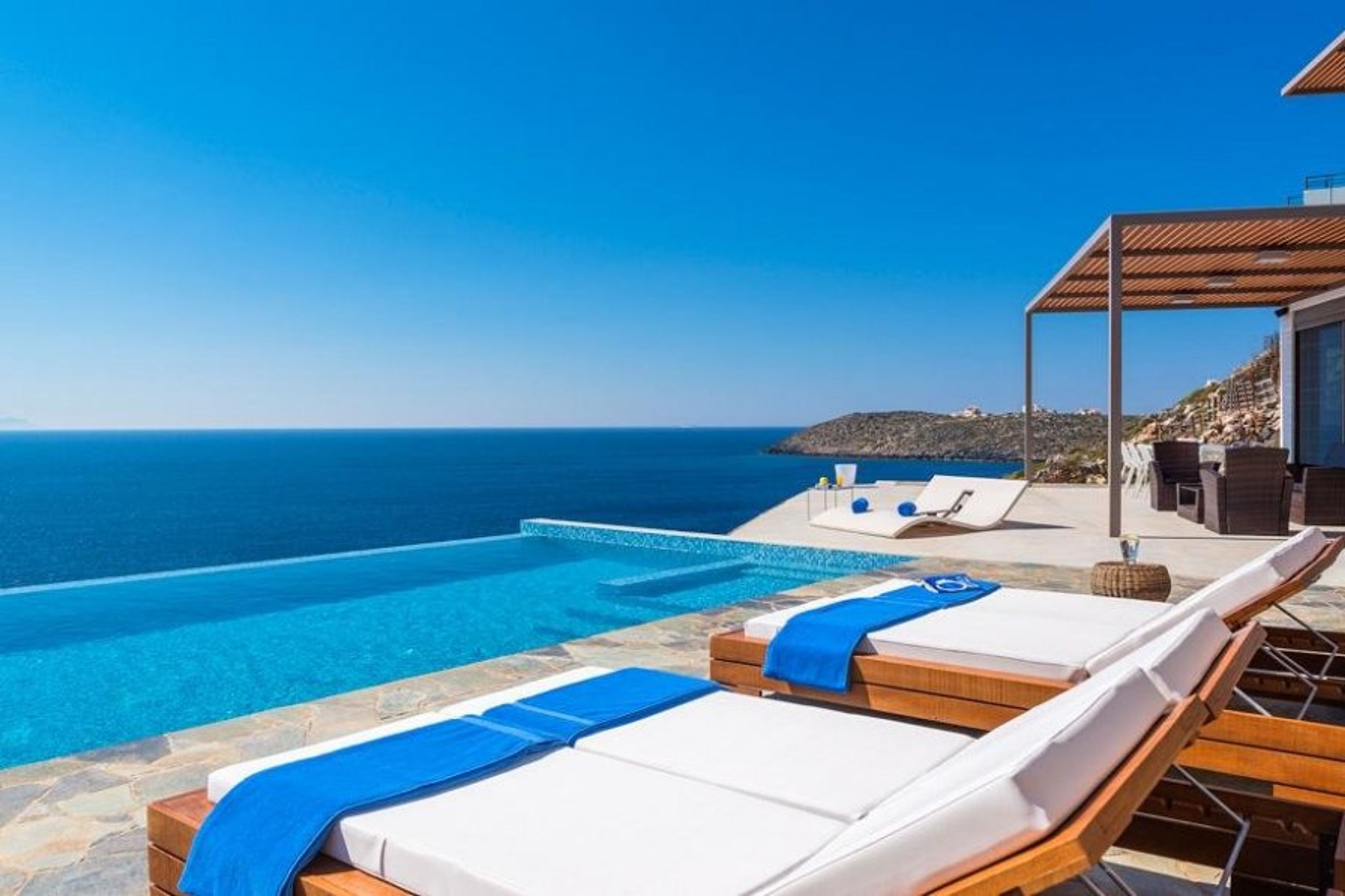 Halfway down is a "dream area" with a twin sun lounger, making it the ideal spot to relax in complete calm with a good book and a loved one. Back by the pool area is a sheltered dining area, ideal for those who want to dine al fresco while on sunny Crete!