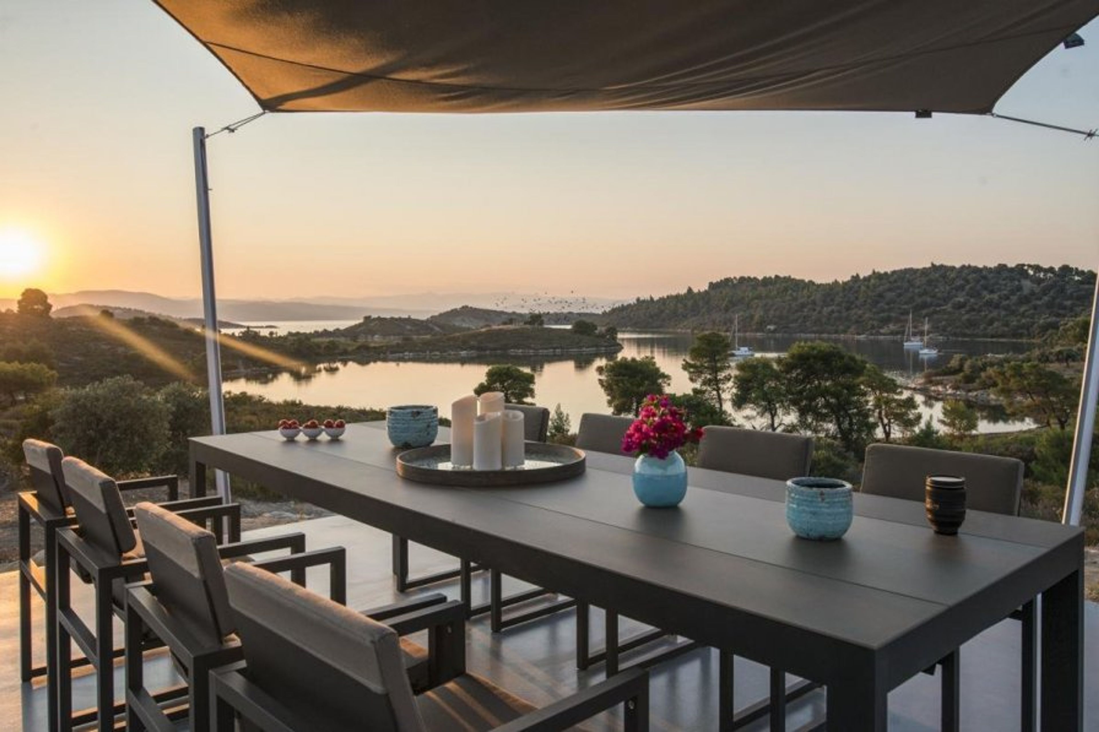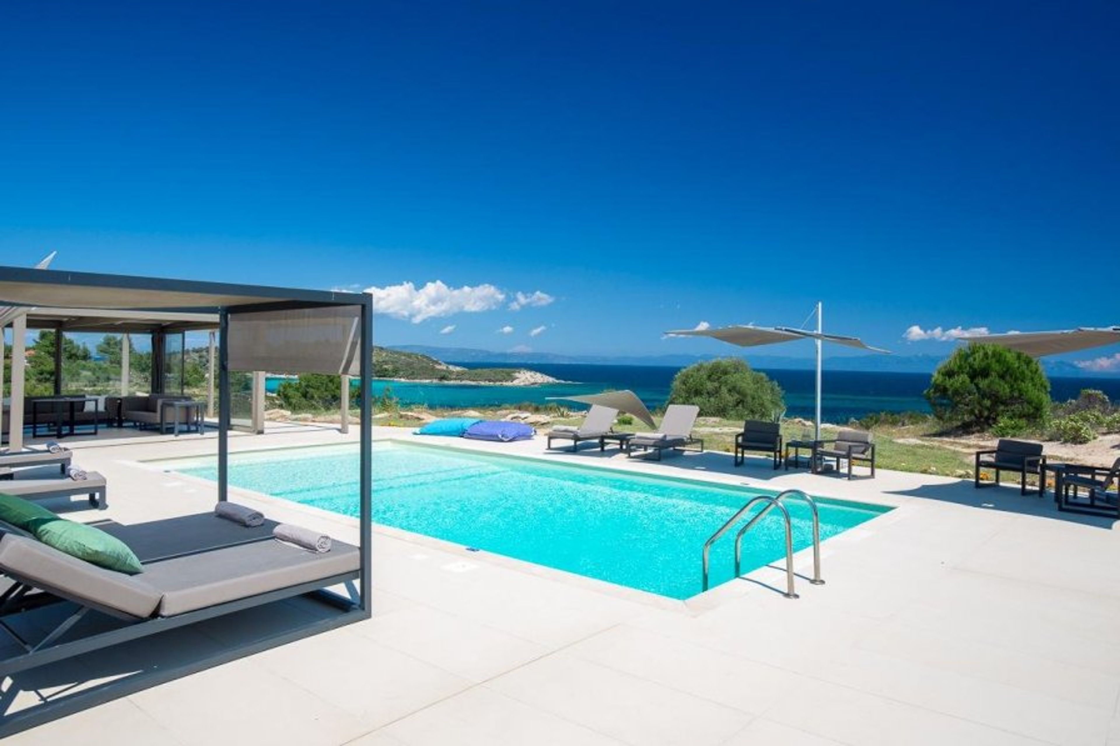 Spend your days lounging by your spacious swimming pool, reading on the tranquil terrace, or cycling around the island. Discover hidden coves or must-see sights like the Holy Mountain, which rises just over 2,000 meters from the southern tip of the Halkidiki peninsula, or traditional Greek villages like Ornos Panagias, which has a picturesque harbour and local tavernas serving freshly caught seafood.