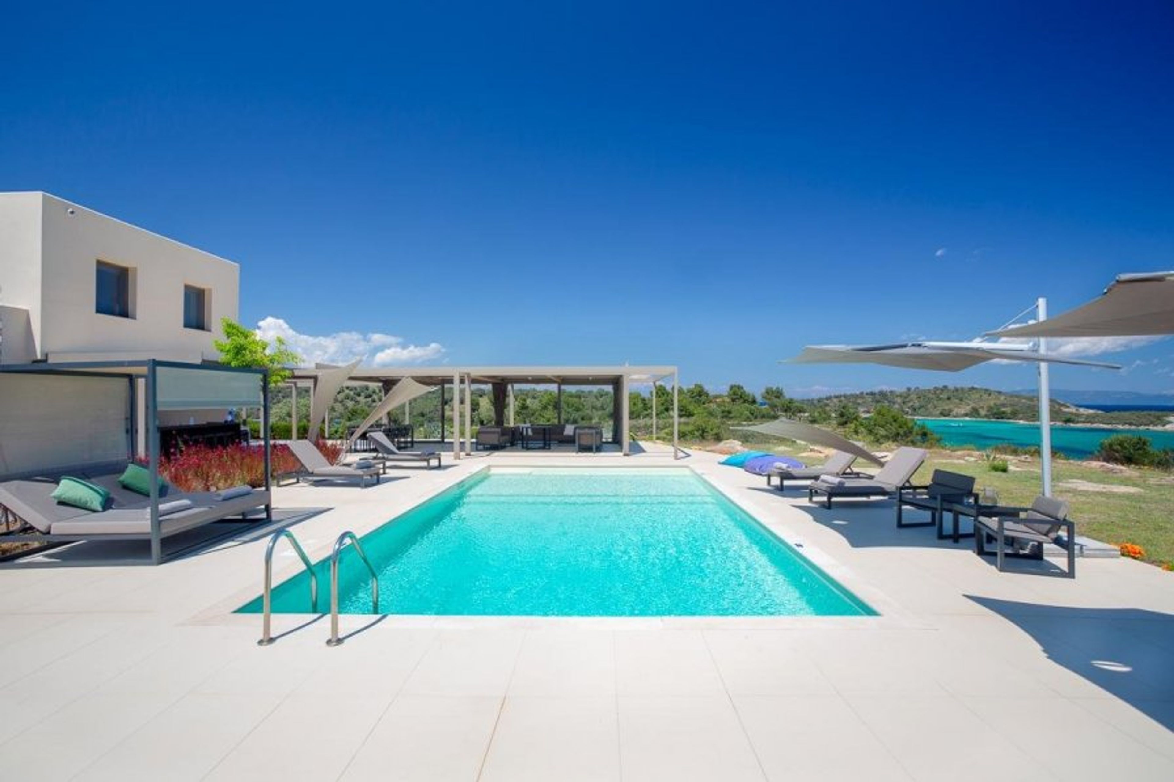 Inside the modern villa, you'll find all of your home comforts, including a fully-equipped kitchen, and two spacious sitting rooms (one overlooking the natural gulf of Kryftos and the other the mountain of Athos), and plenty of places to sunbathe or relax in the shade.