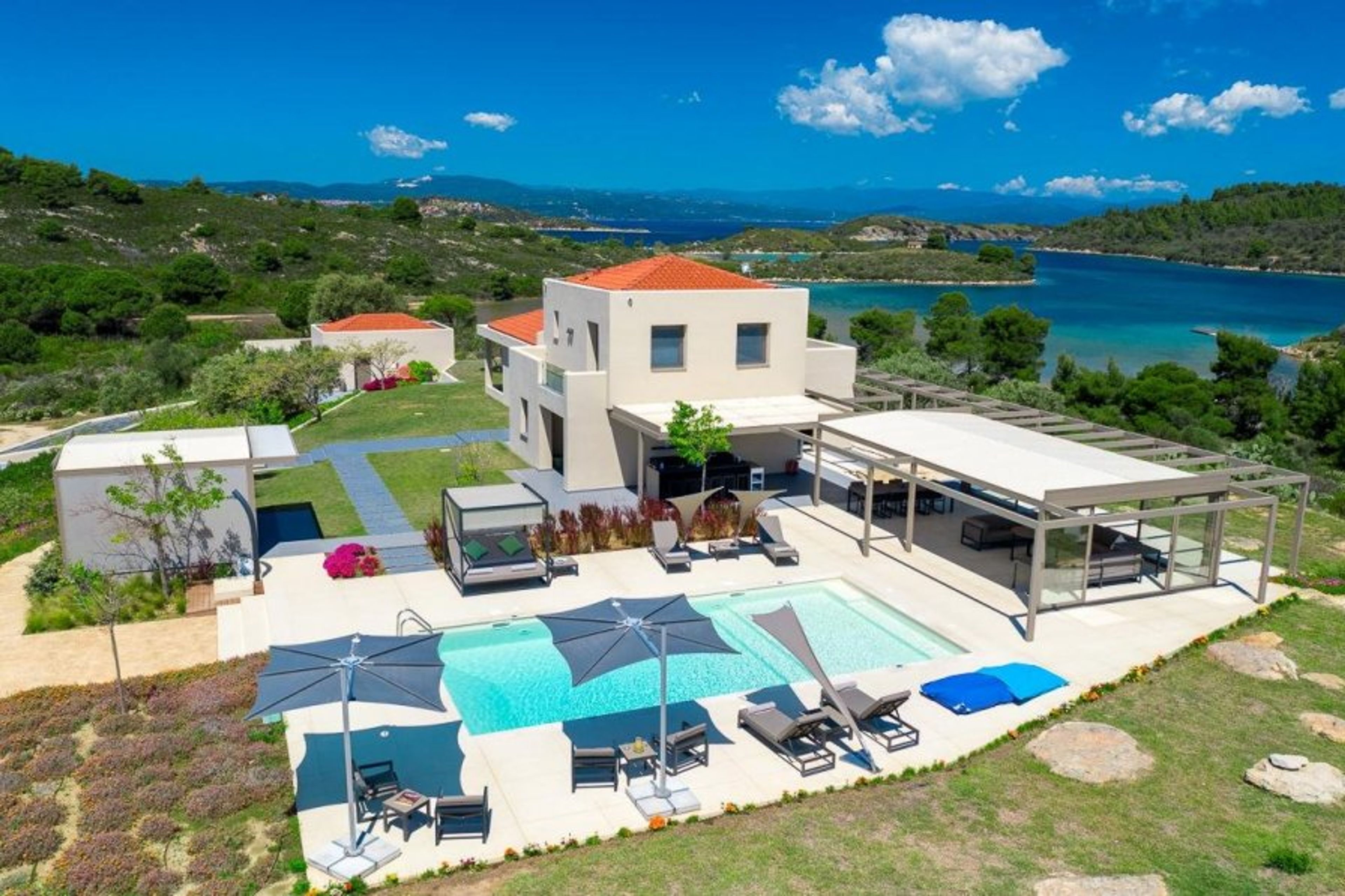 The luxurious villa has fantastic views of the sandy coastline below thanks to its elevated position and peaceful setting on the quiet and private island of Diaporos.