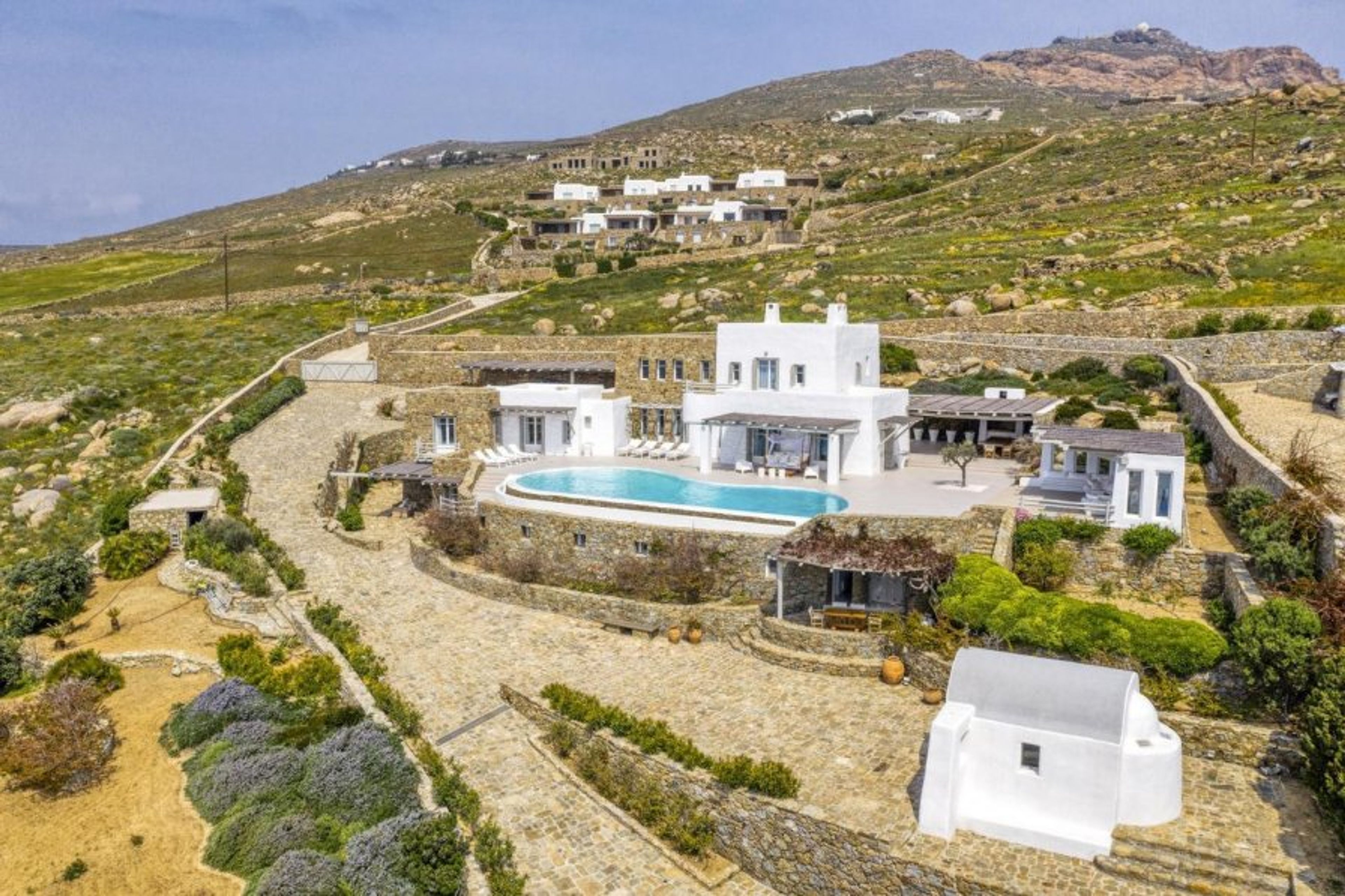 Finally, when you exit out into the back, you'll find a covered terrace and an unexpected amenity: a small church on the property! It is ideal for a smaller, fairy-tale wedding on Mykonos.